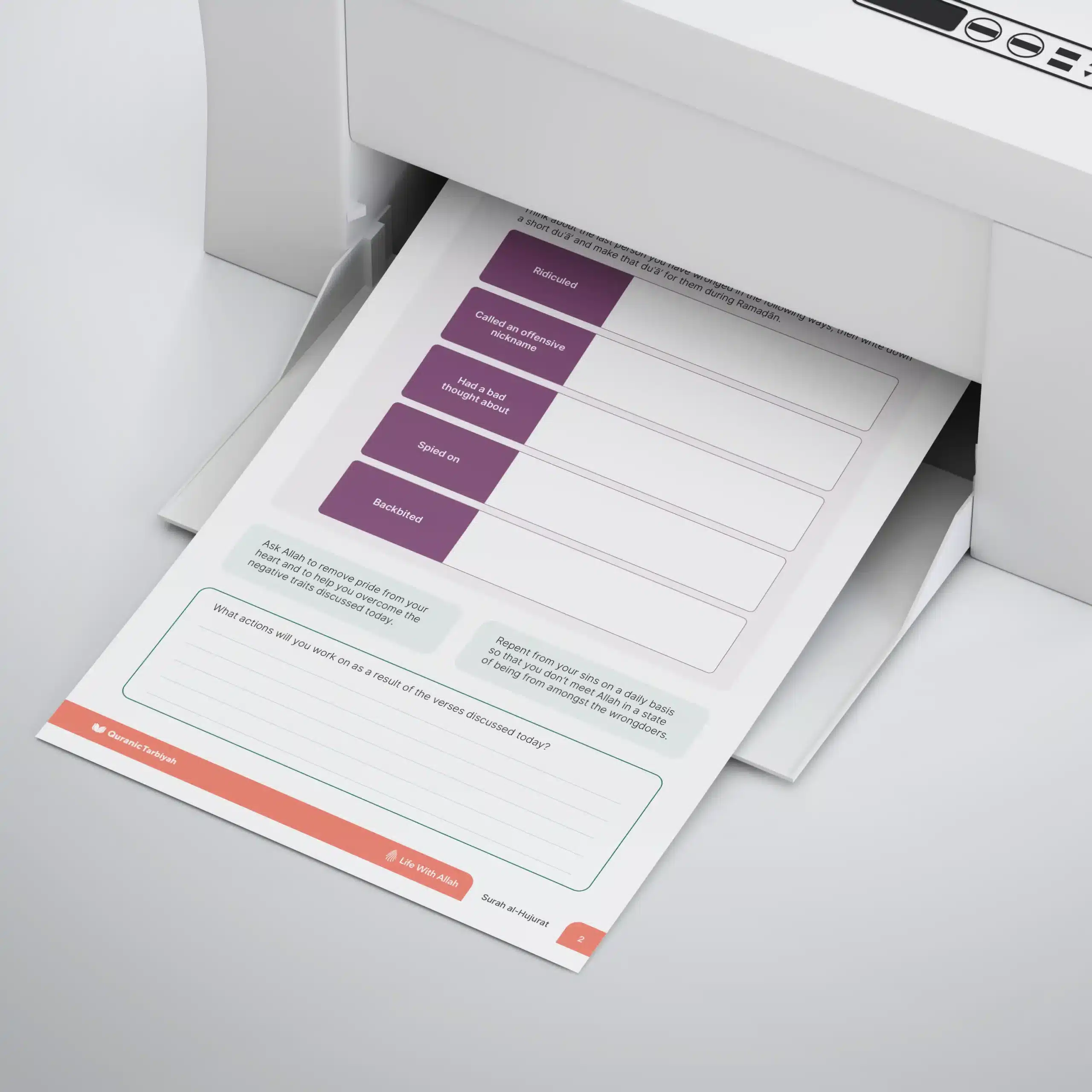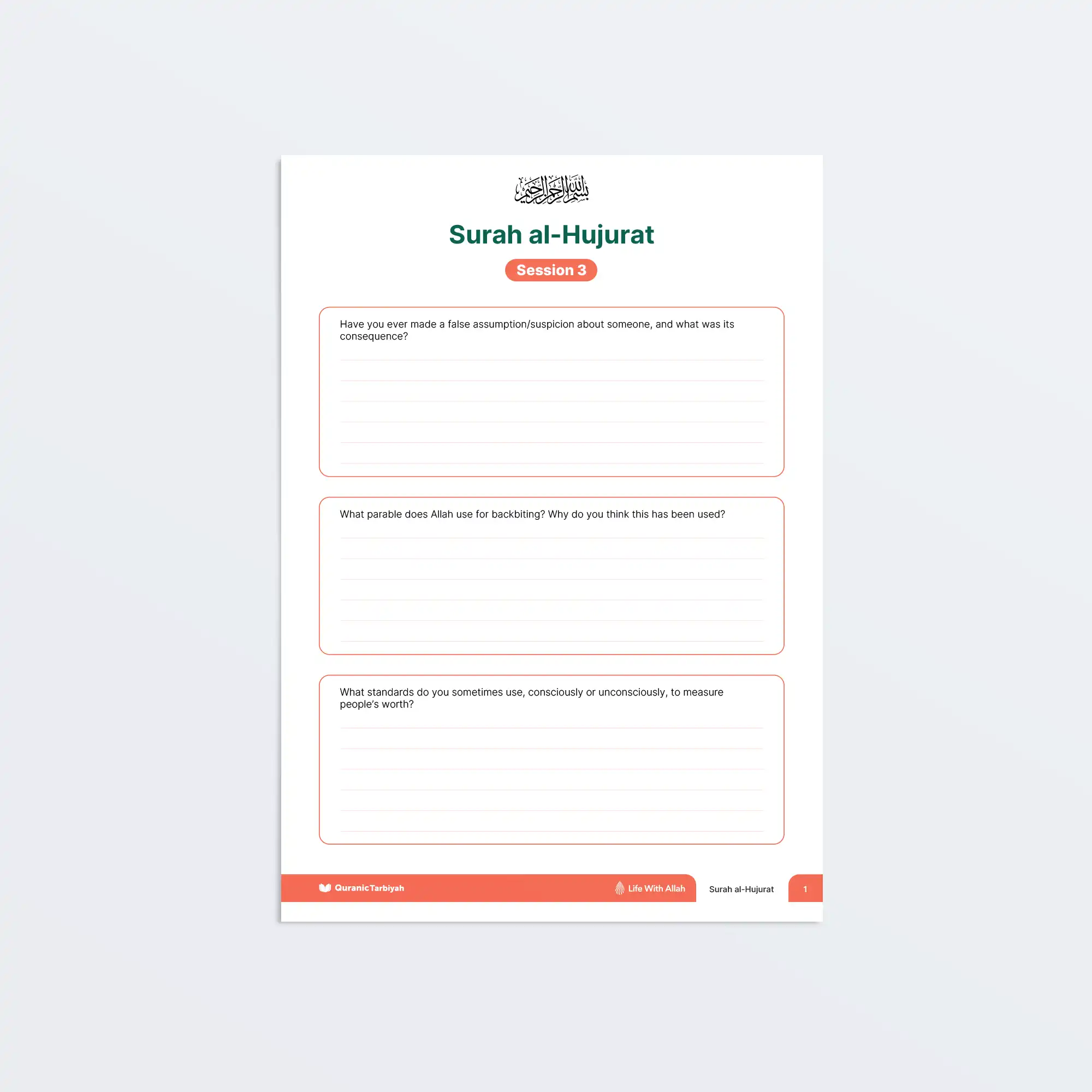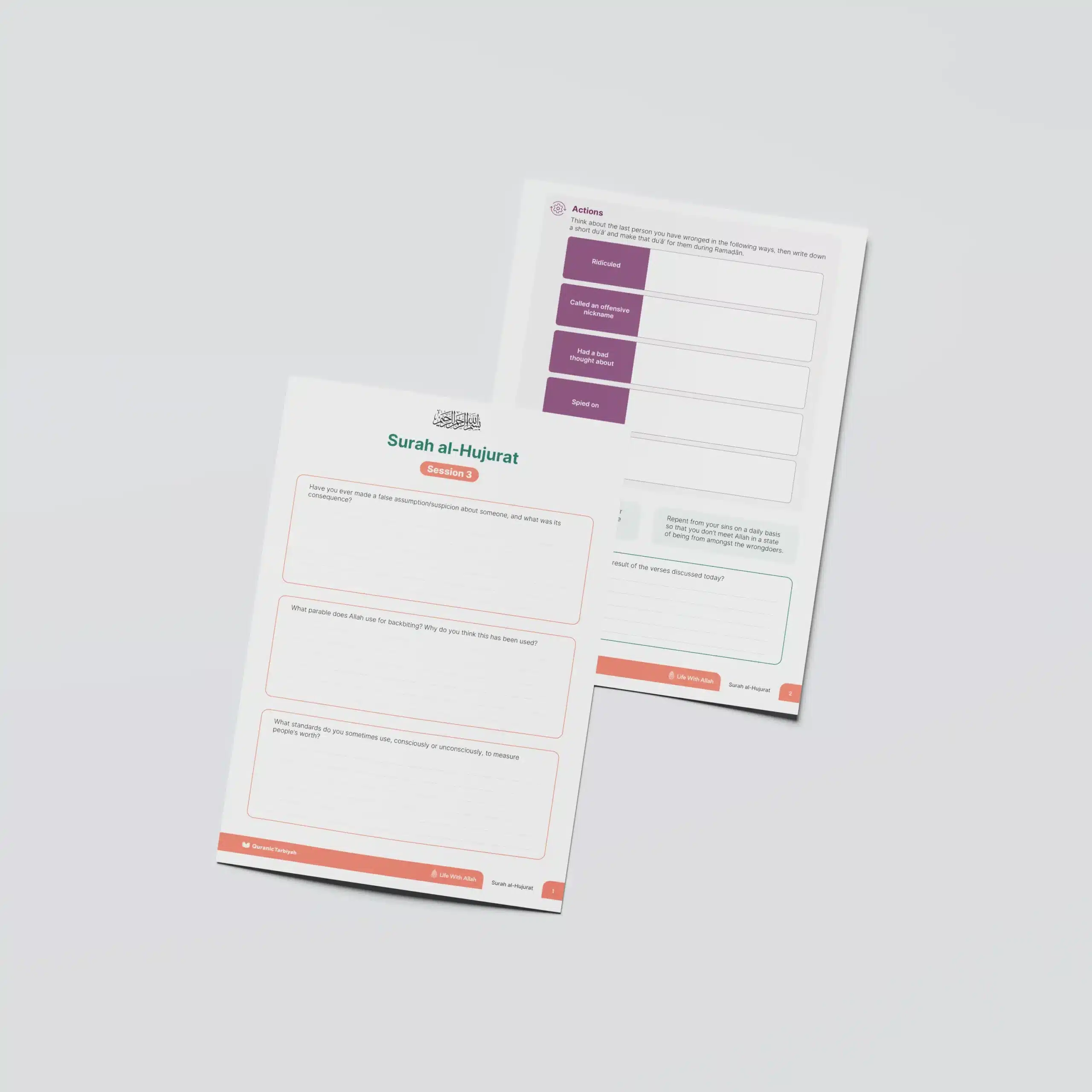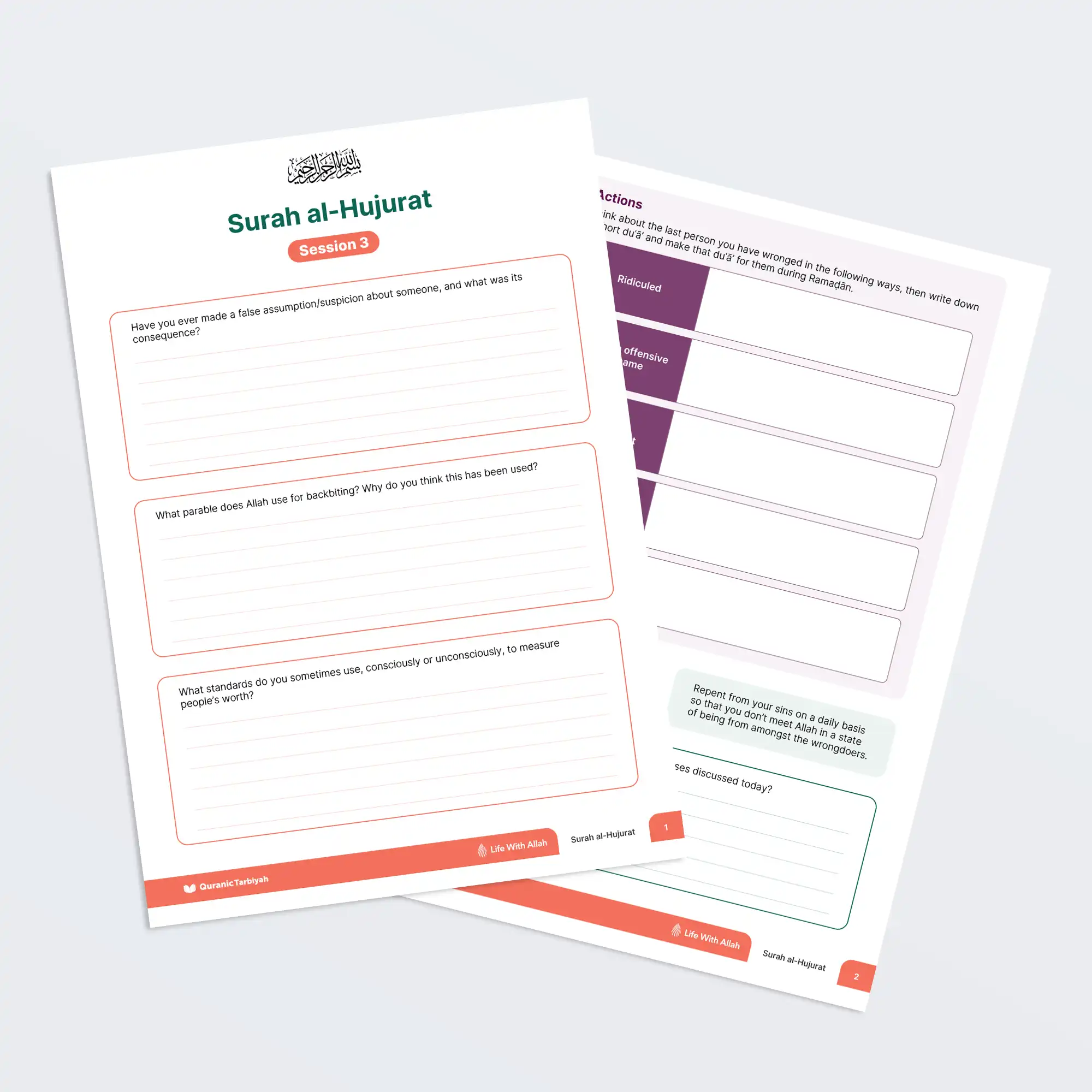 Adult learners worksheet on Surah Al-Hujurat Session 3 exploring false assumptions, evil suspicions, and backbiting. Features deep reflection questions, practical actions for repairing harm through duas, and commitment to removing pride and negative traits.