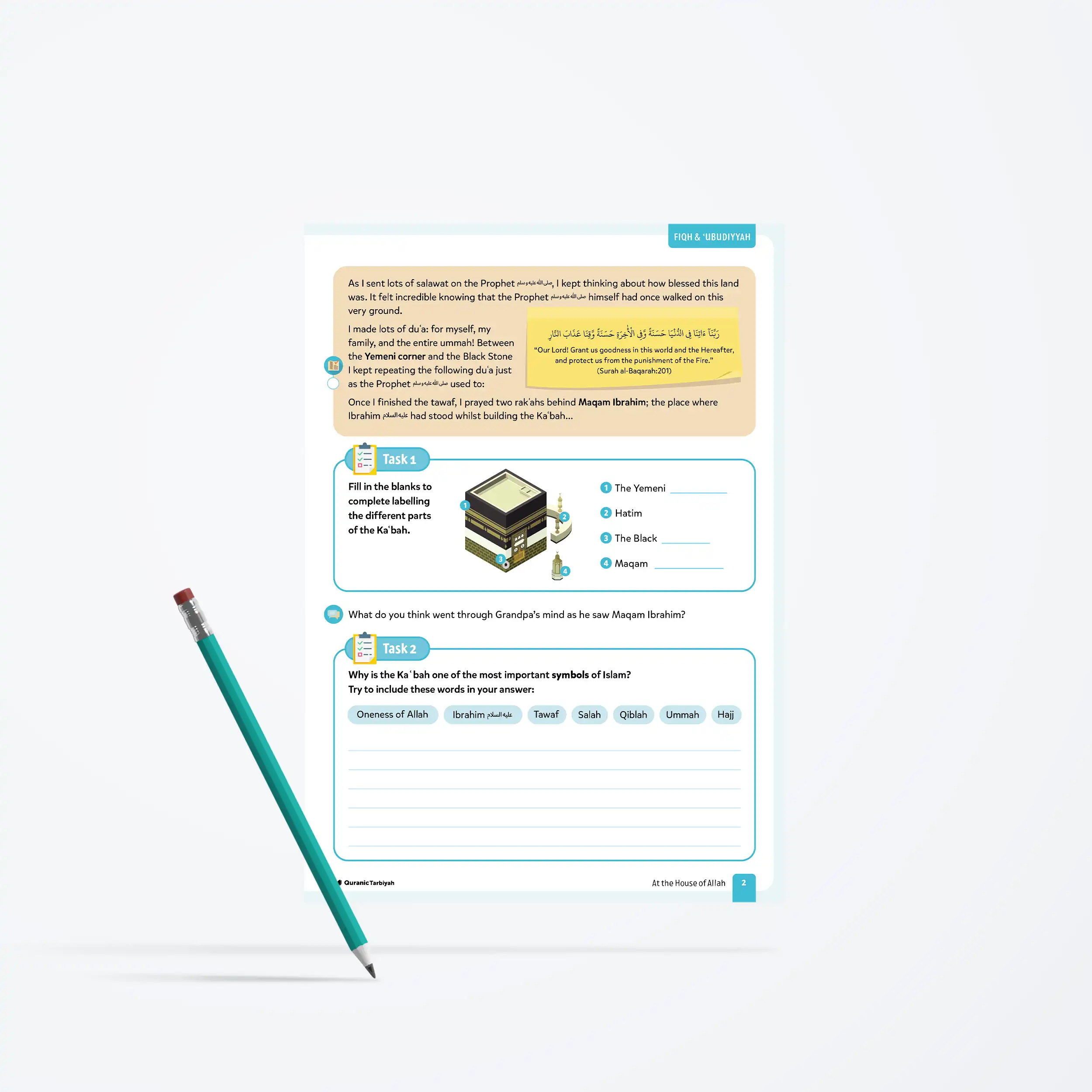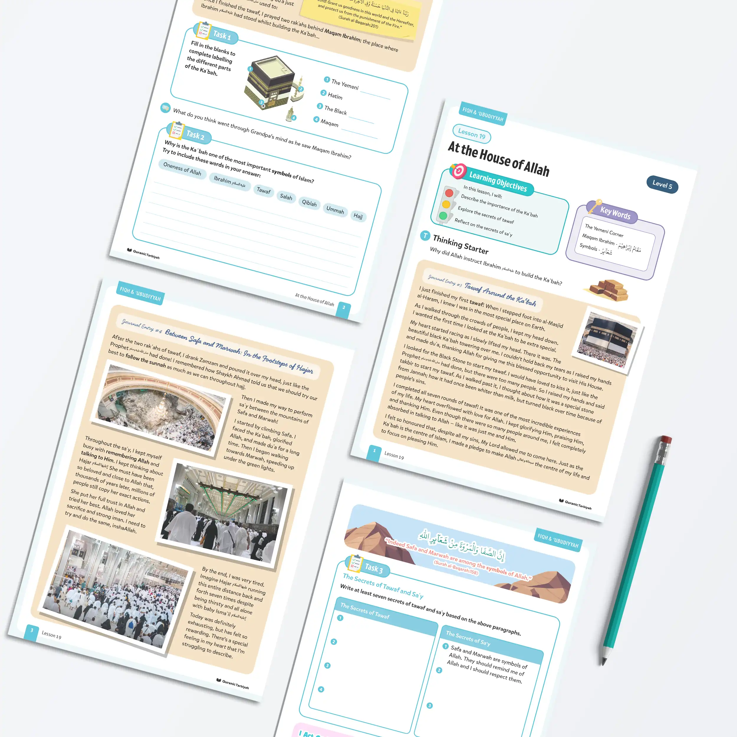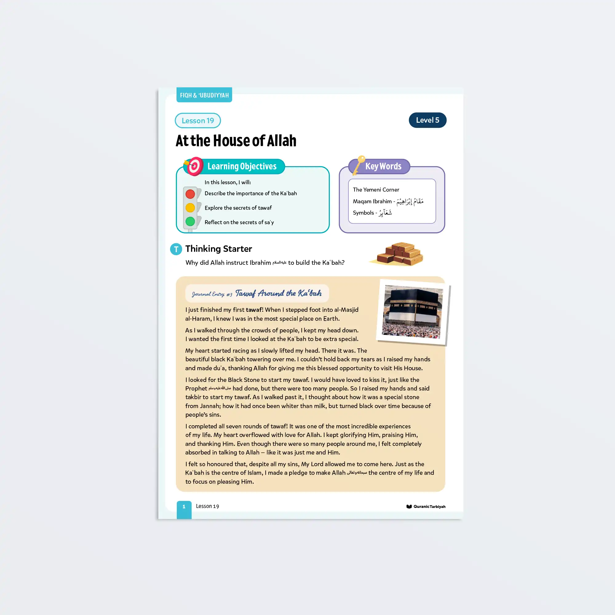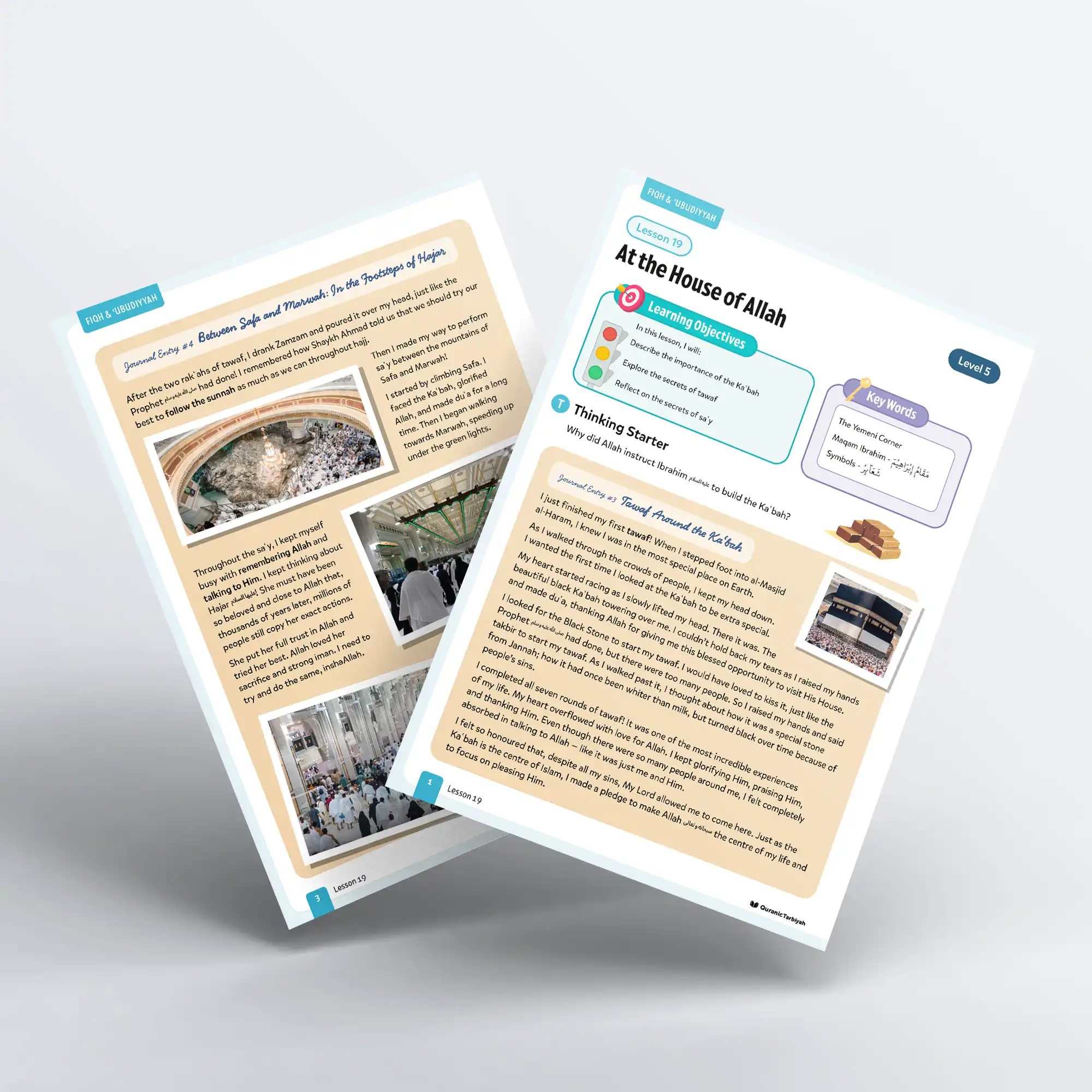 Through Grandpa’s journal entries, young learners witness his first glimpse of the Kaʿbah, the tears that fell as he raised his hands in duʿa, and the overwhelming sense of love and humility that washed over him during tawaf. The lesson unpacks the spiritual significance of the Black Stone, Maqam Ibrahim, and the duʿa recited between the Yemeni Corner and the Black Stone, helping learners understand that every action of hajj carries deep meaning rooted in tawhid and servitude to Allah.