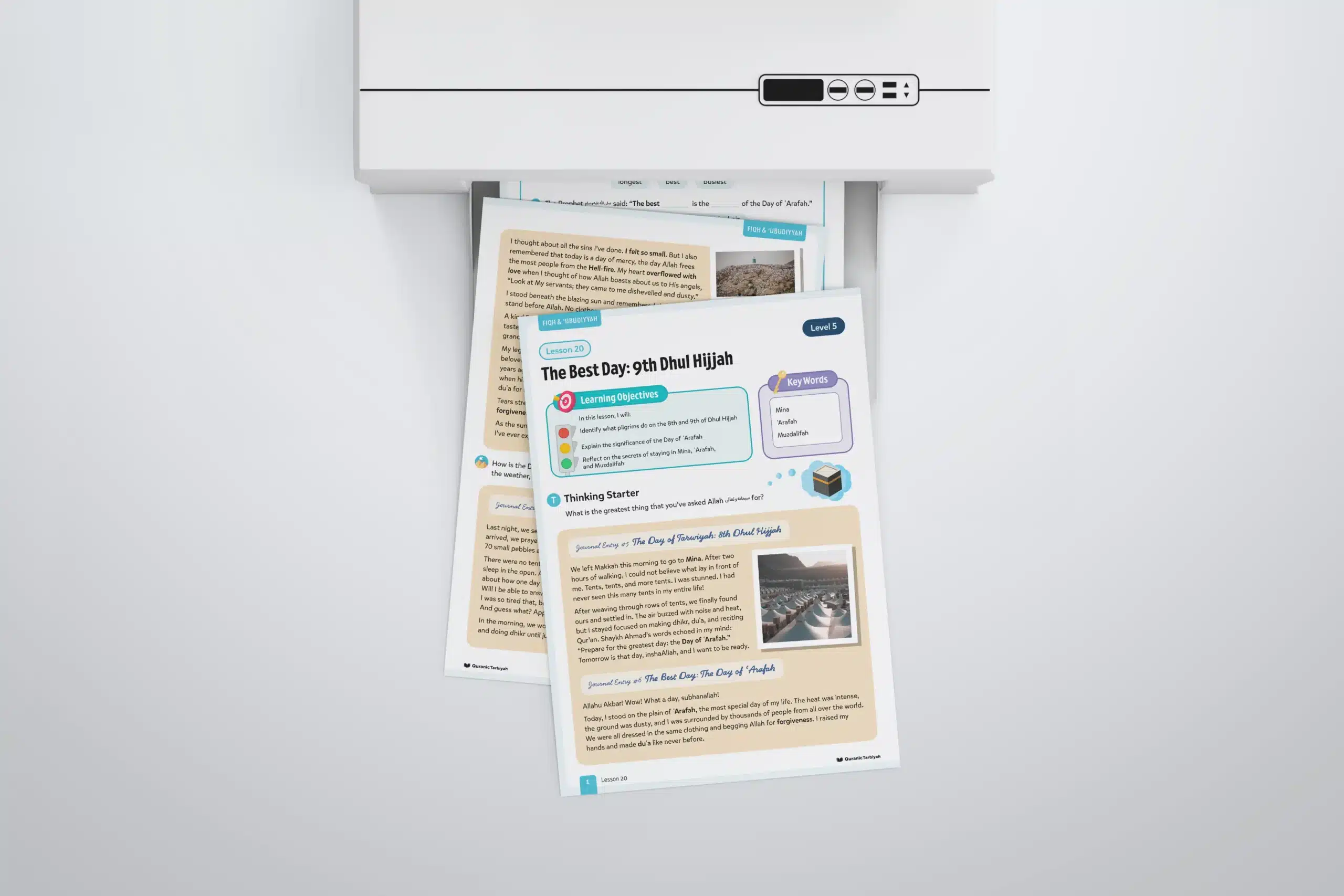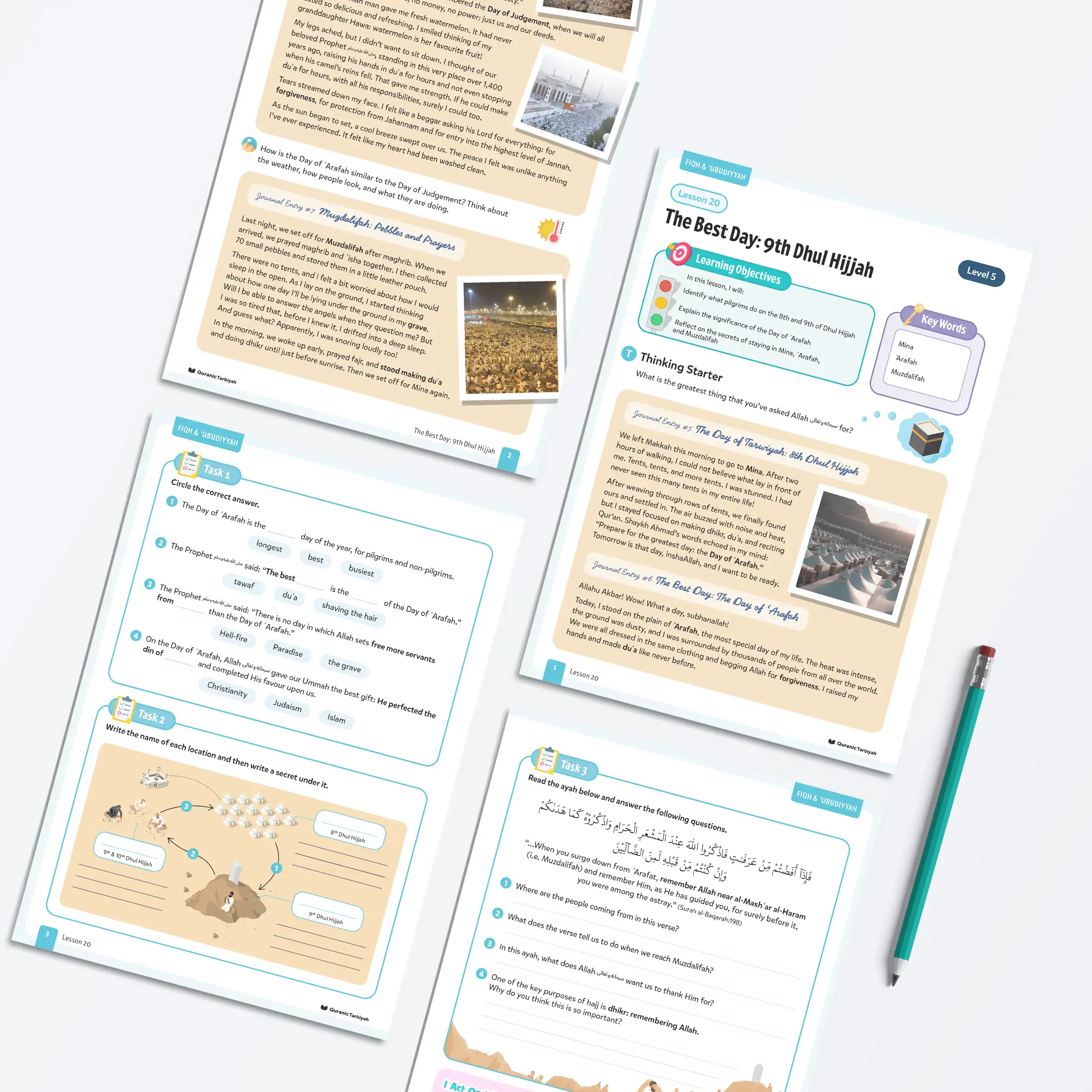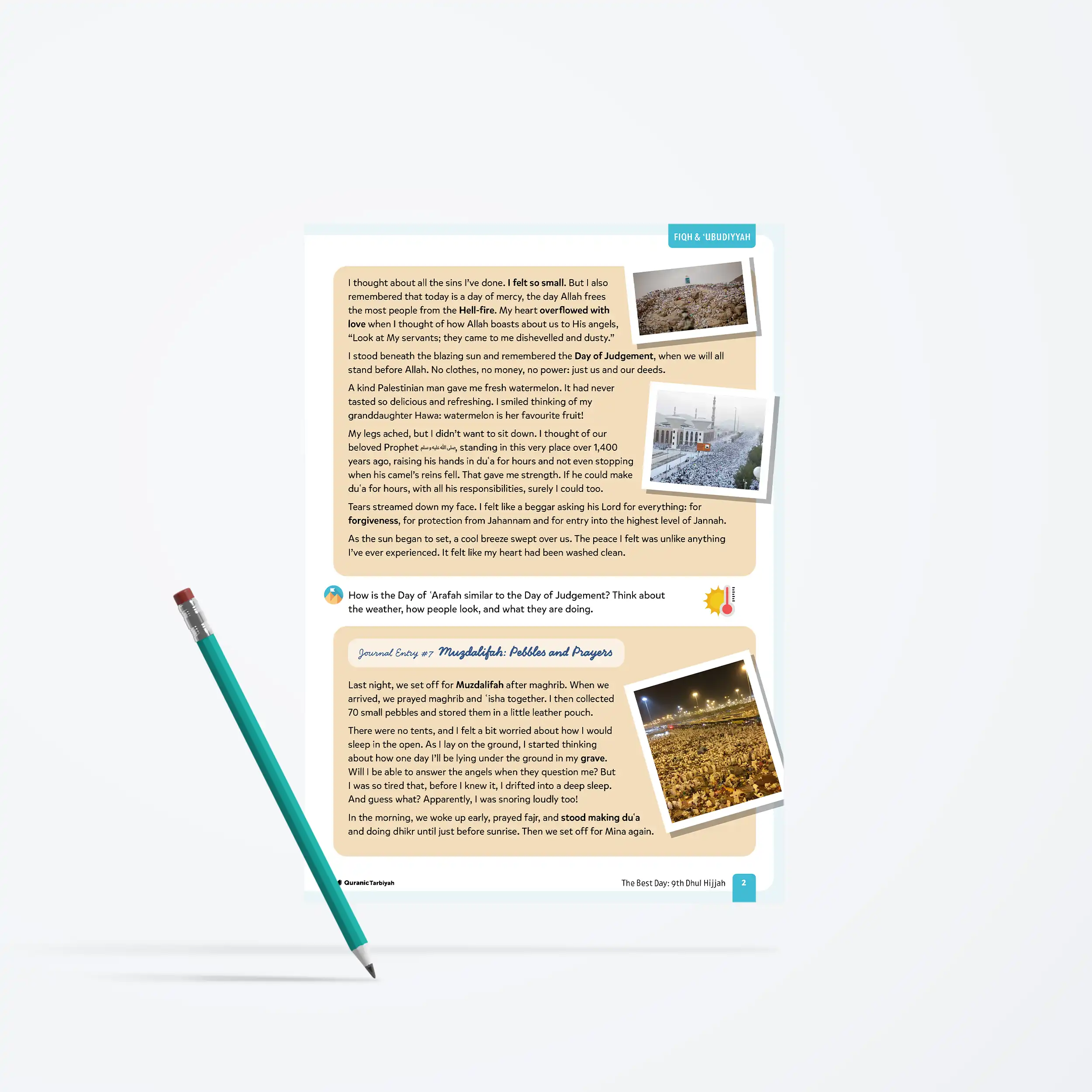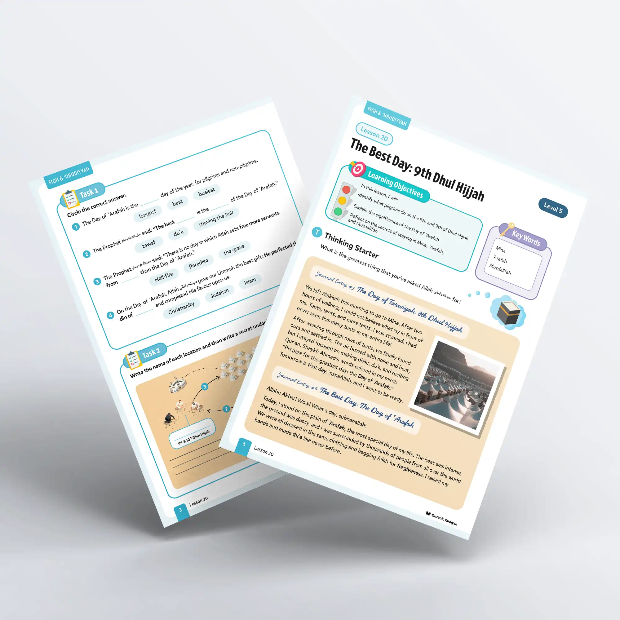 Through vivid journal entries, learners walk alongside Grandpa as he arrives in Mina on the Day of Tarwiyah, filling his time with dhikr, duʿa, and the recitation of Qur’an in preparation for the greatest day ahead. The lesson then reaches its emotional peak on the plain of ʿArafah, where Grandpa stands beneath the blazing sun, weeping before Allah, drawing strength from the memory of our beloved Prophet ﷺ who once stood in that very place raising his hands in duʿa for hours without pause.