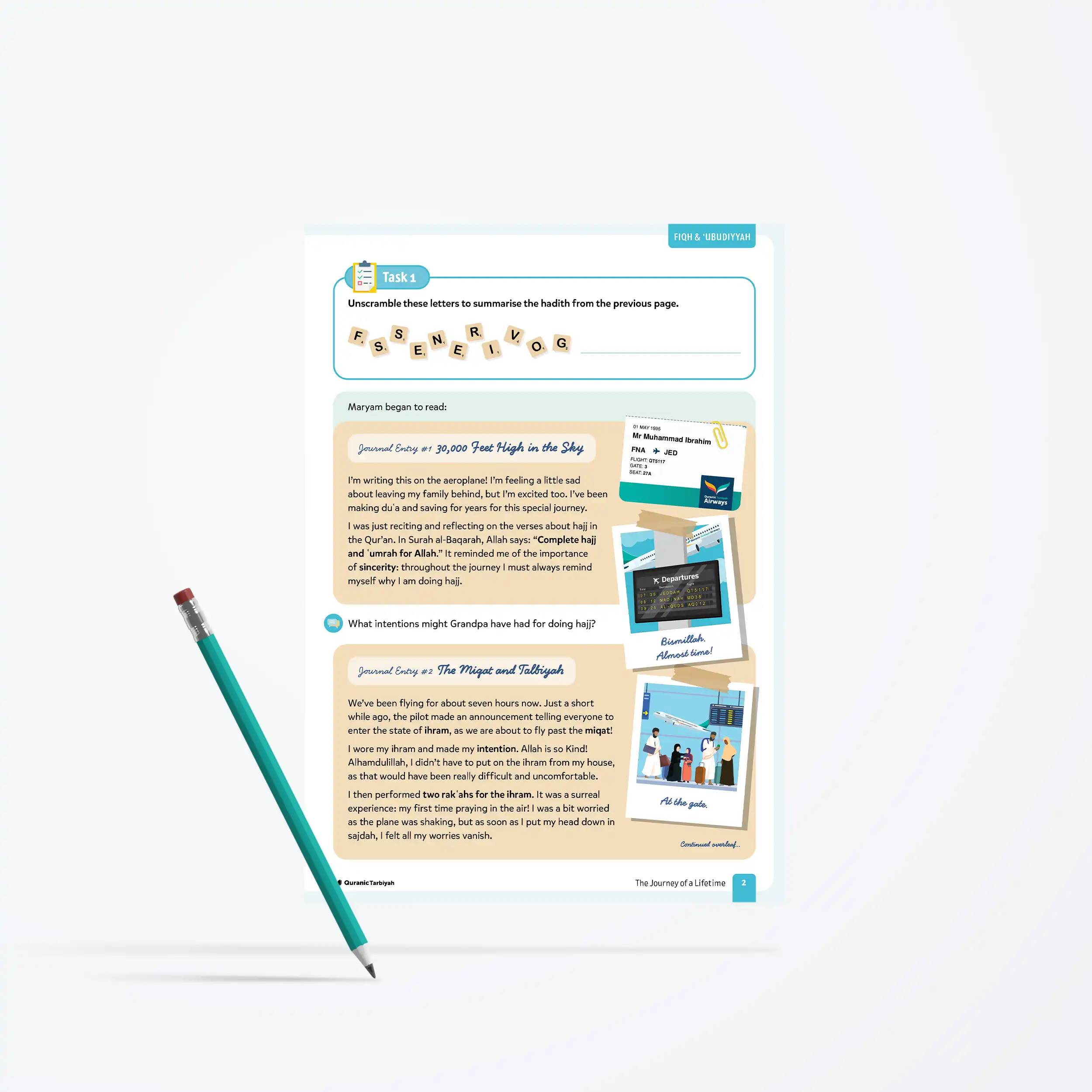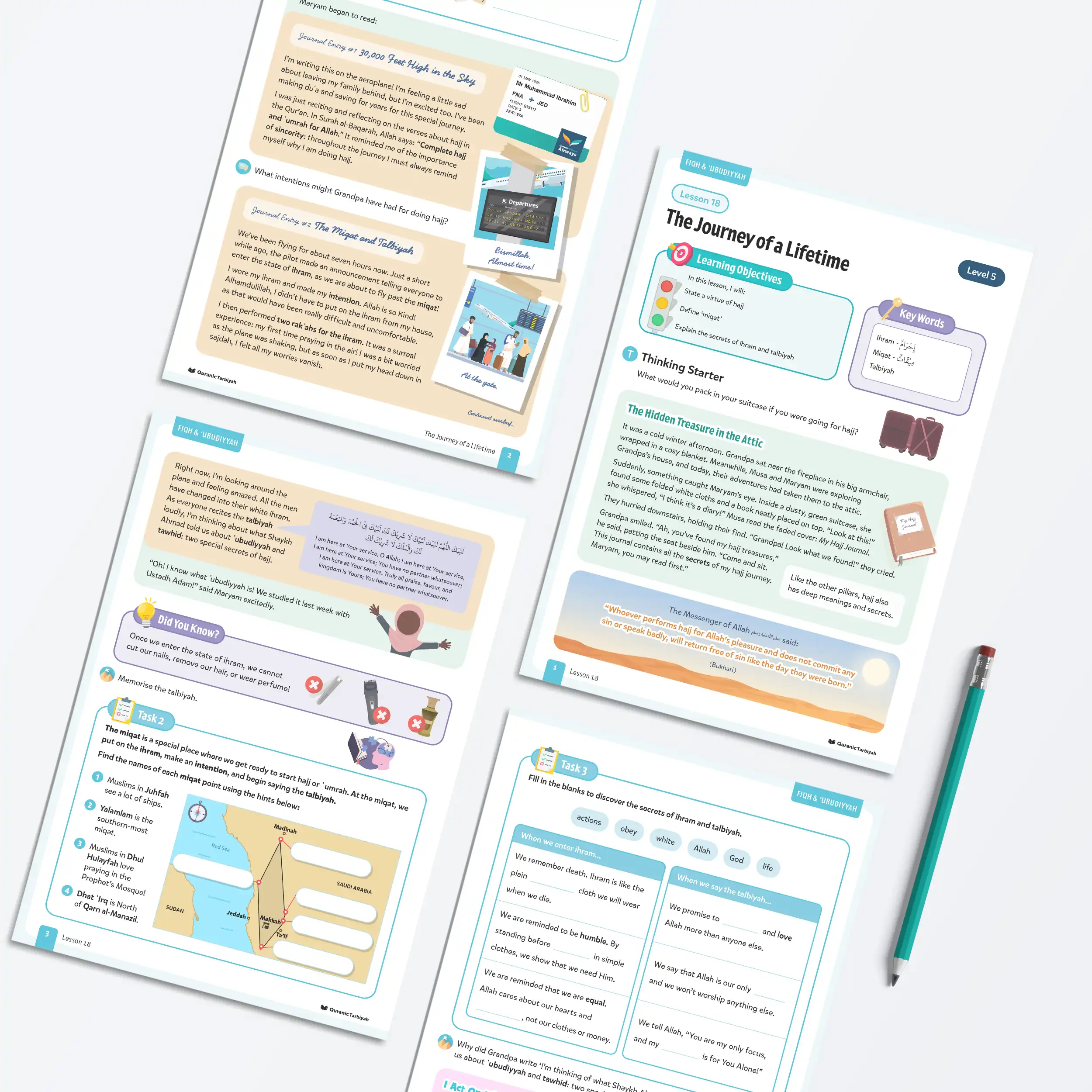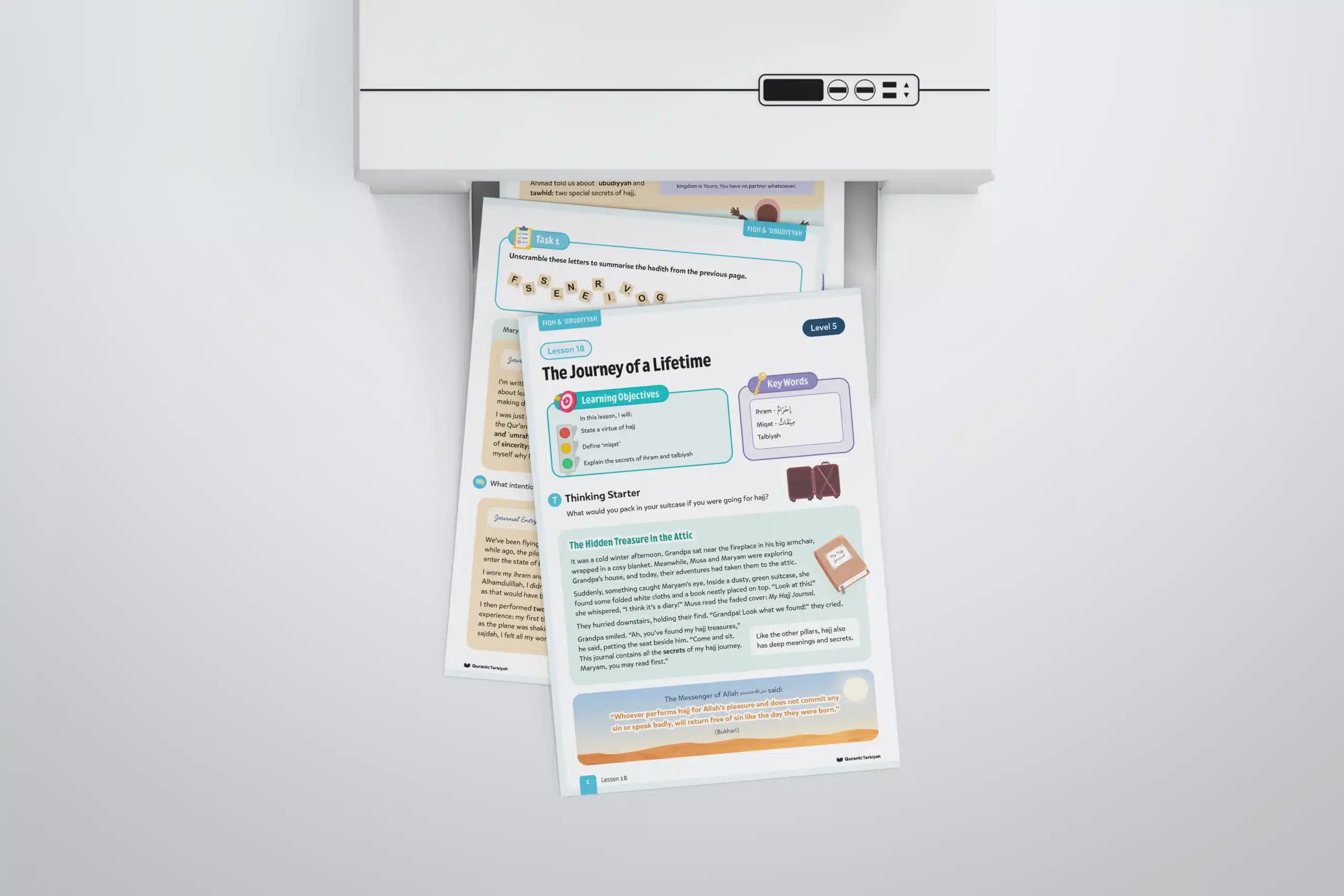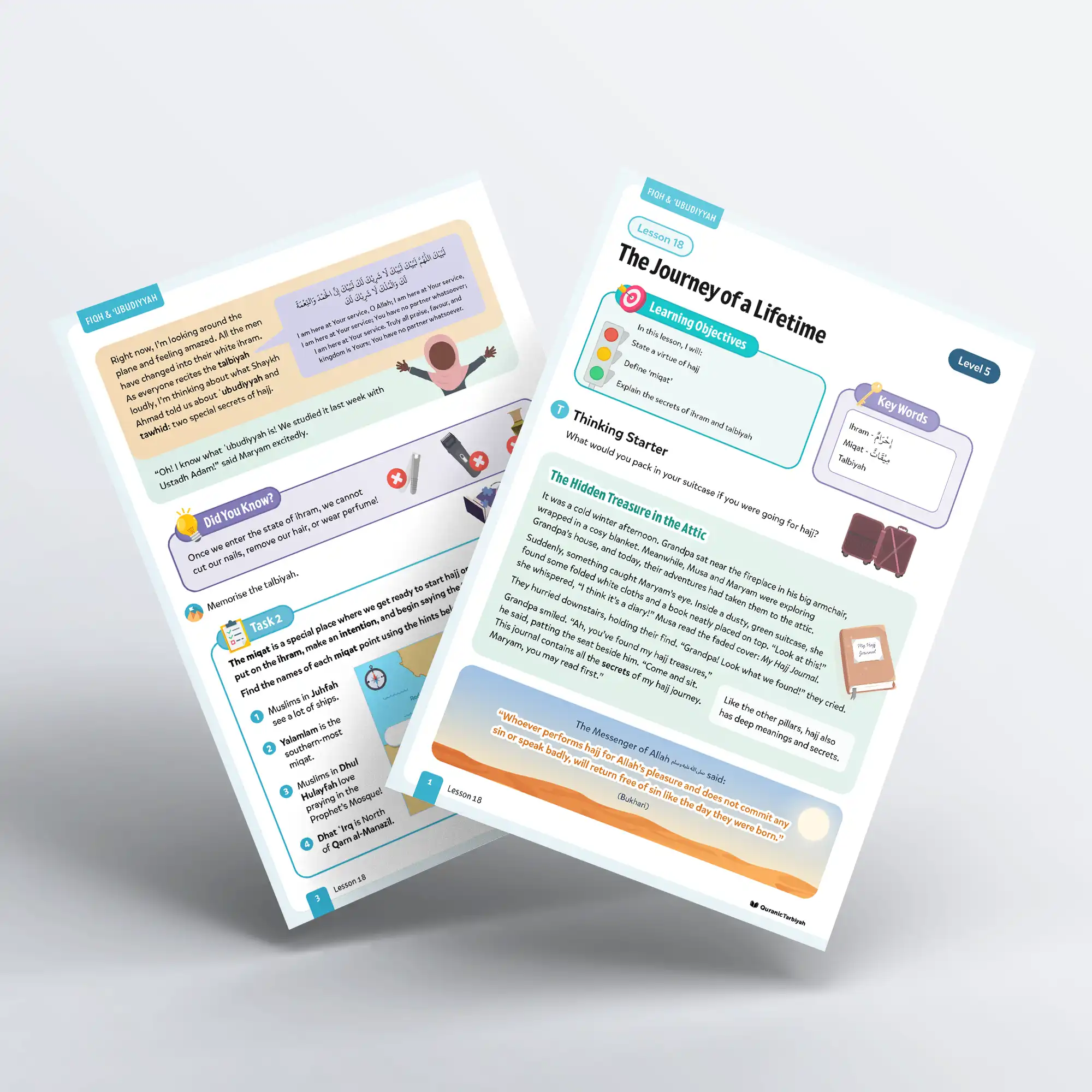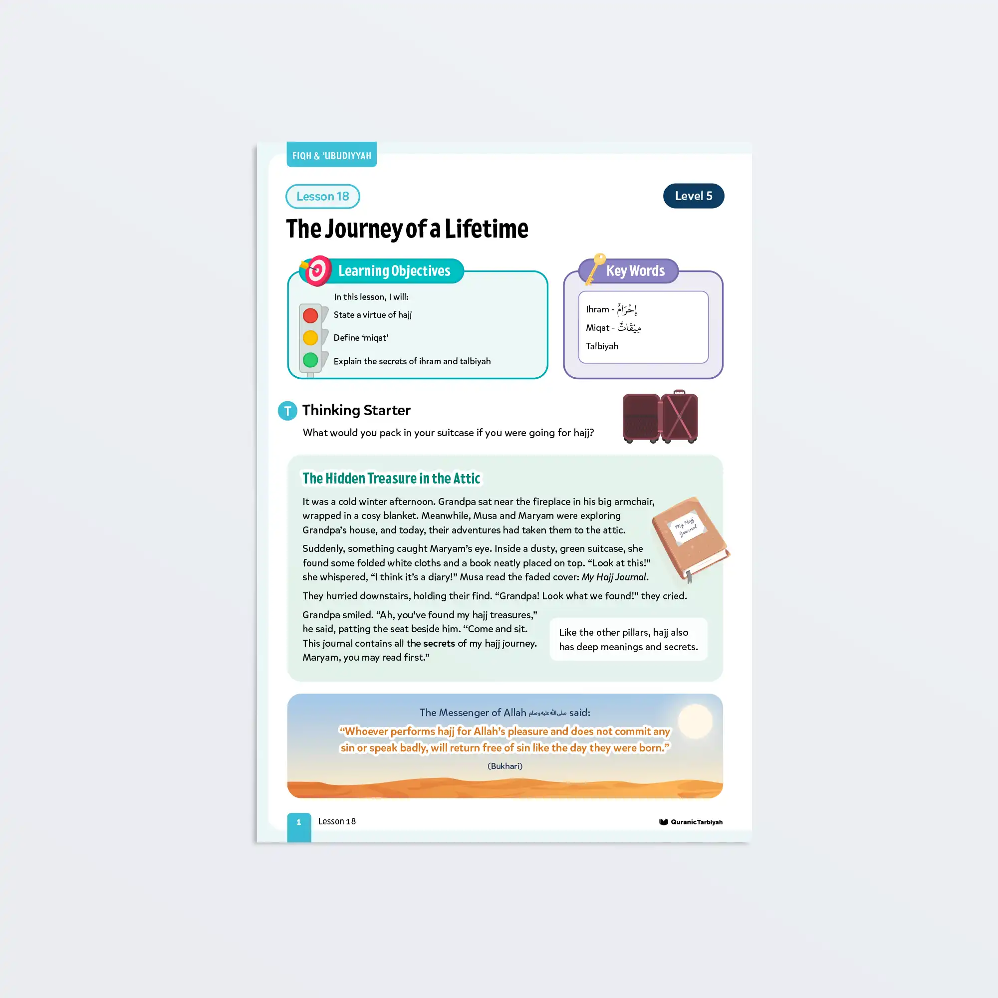This engaging lesson opens with a heartwarming story: two curious children discover their grandfather’s old Hajj Journal tucked away in the attic. As they read his personal entries aloud, learners are transported on the journey alongside him, from boarding the aeroplane to flying past the miqat, entering the state of ihram, and lifting their voices in talbiyah. The narrative approach draws learners in naturally, making abstract concepts feel vivid and real.