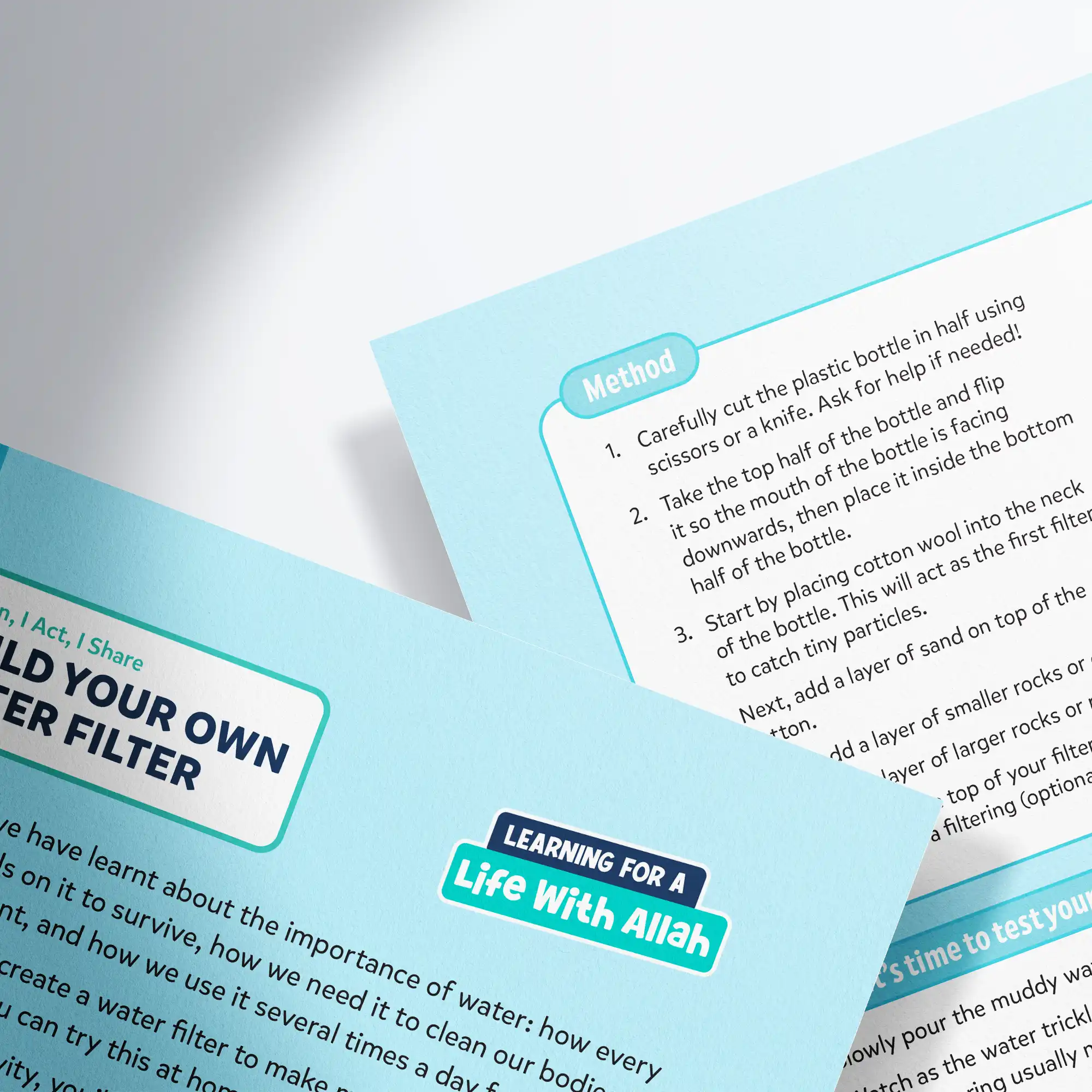 After learning about the importance of water, how every living creature depends on it to survive, how we need it to clean our bodies, clothes, and environment, and how we use it several times a day for wudu, young learners are invited to put their understanding into action by building a working water filter that transforms muddy water into something cleaner.