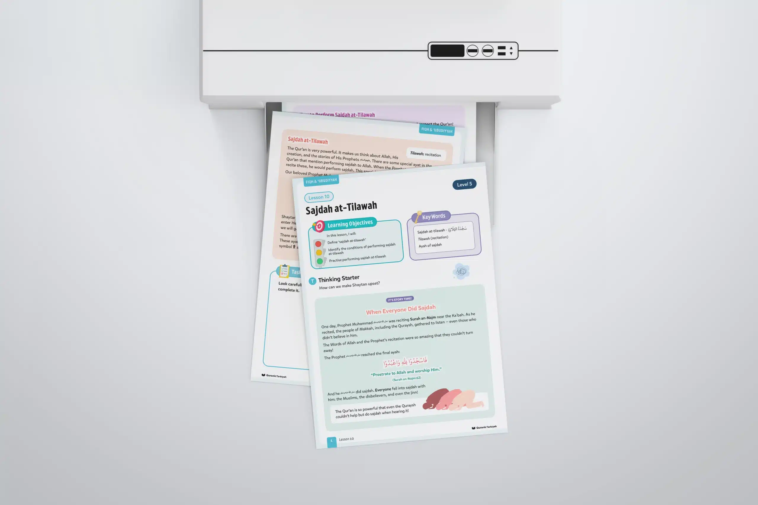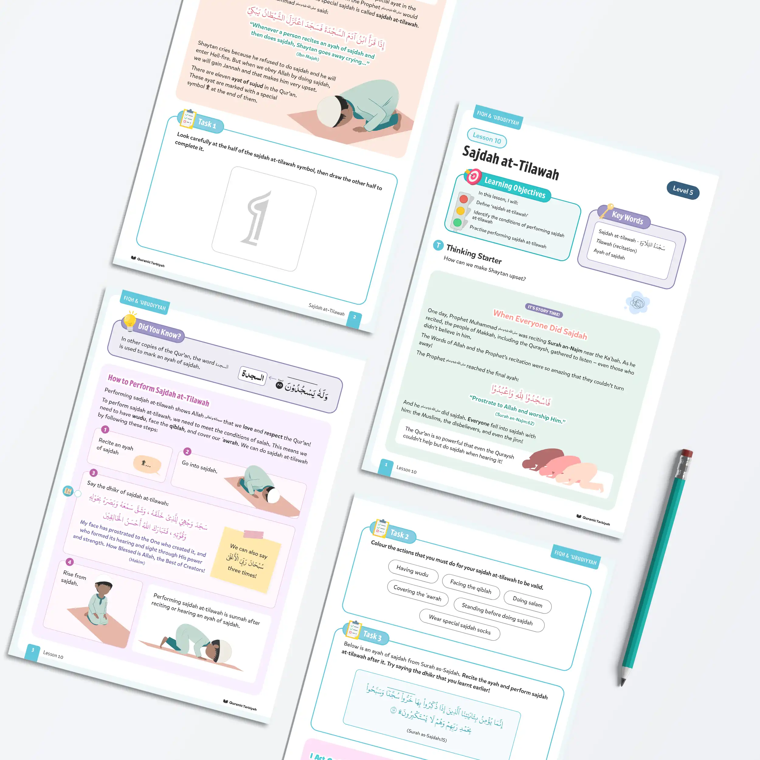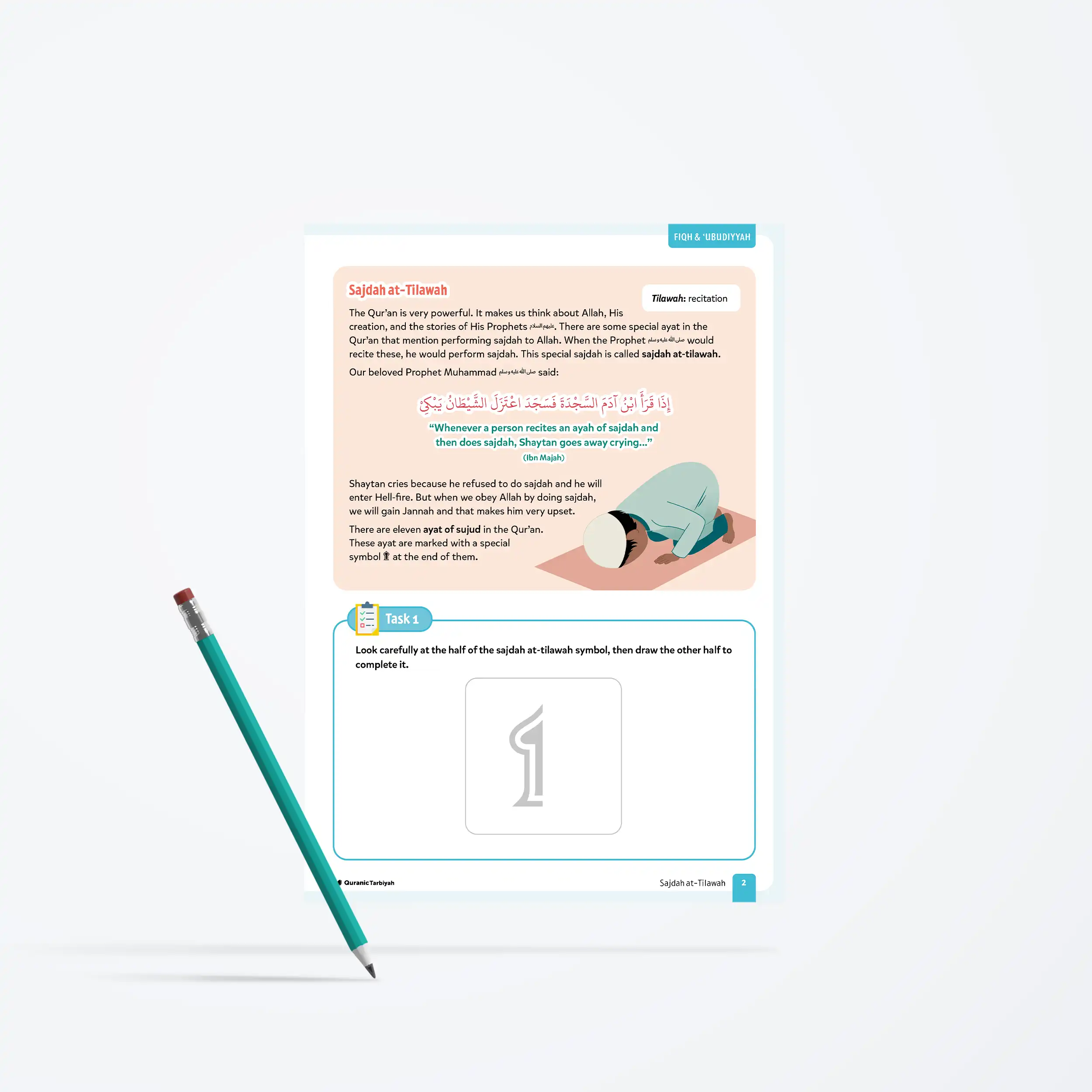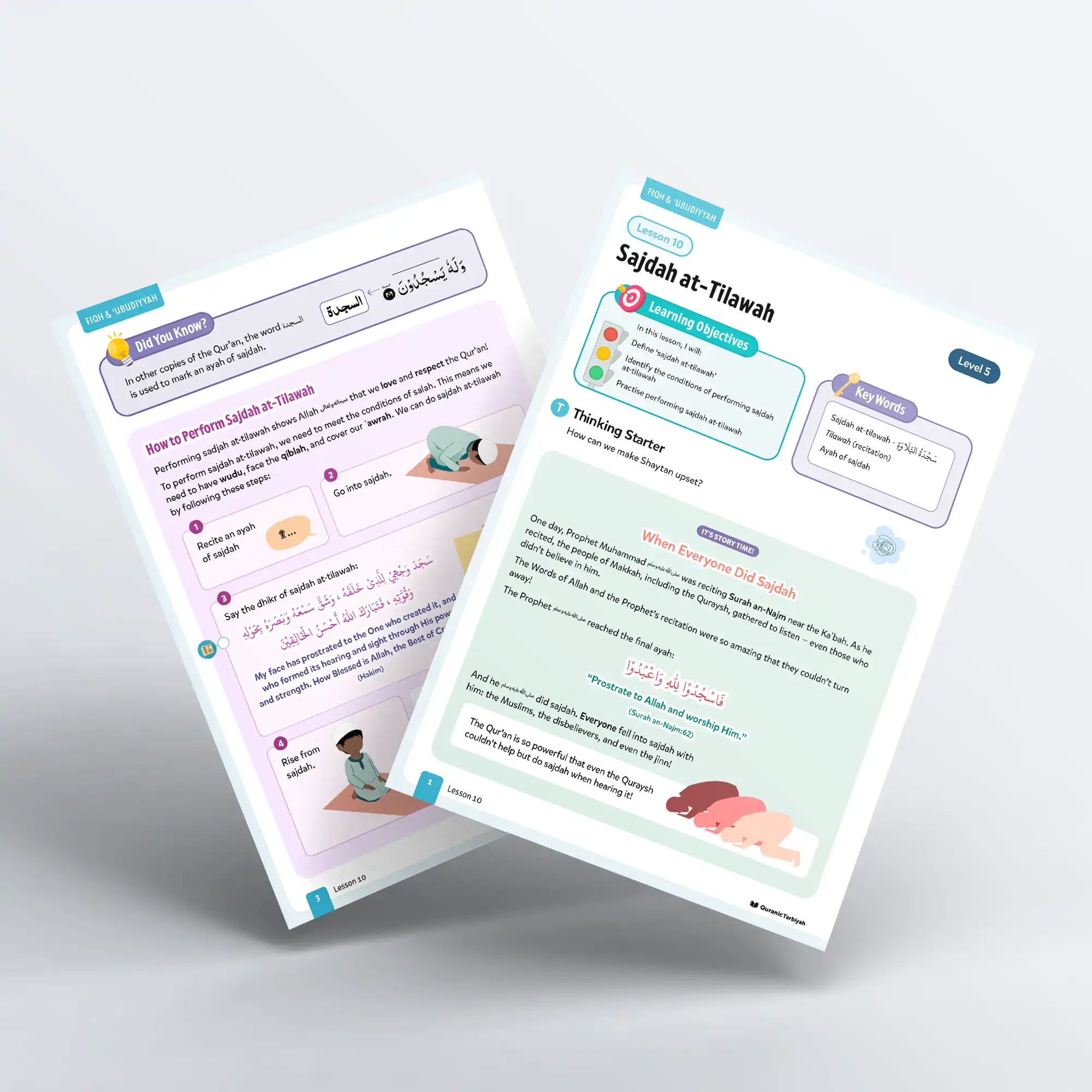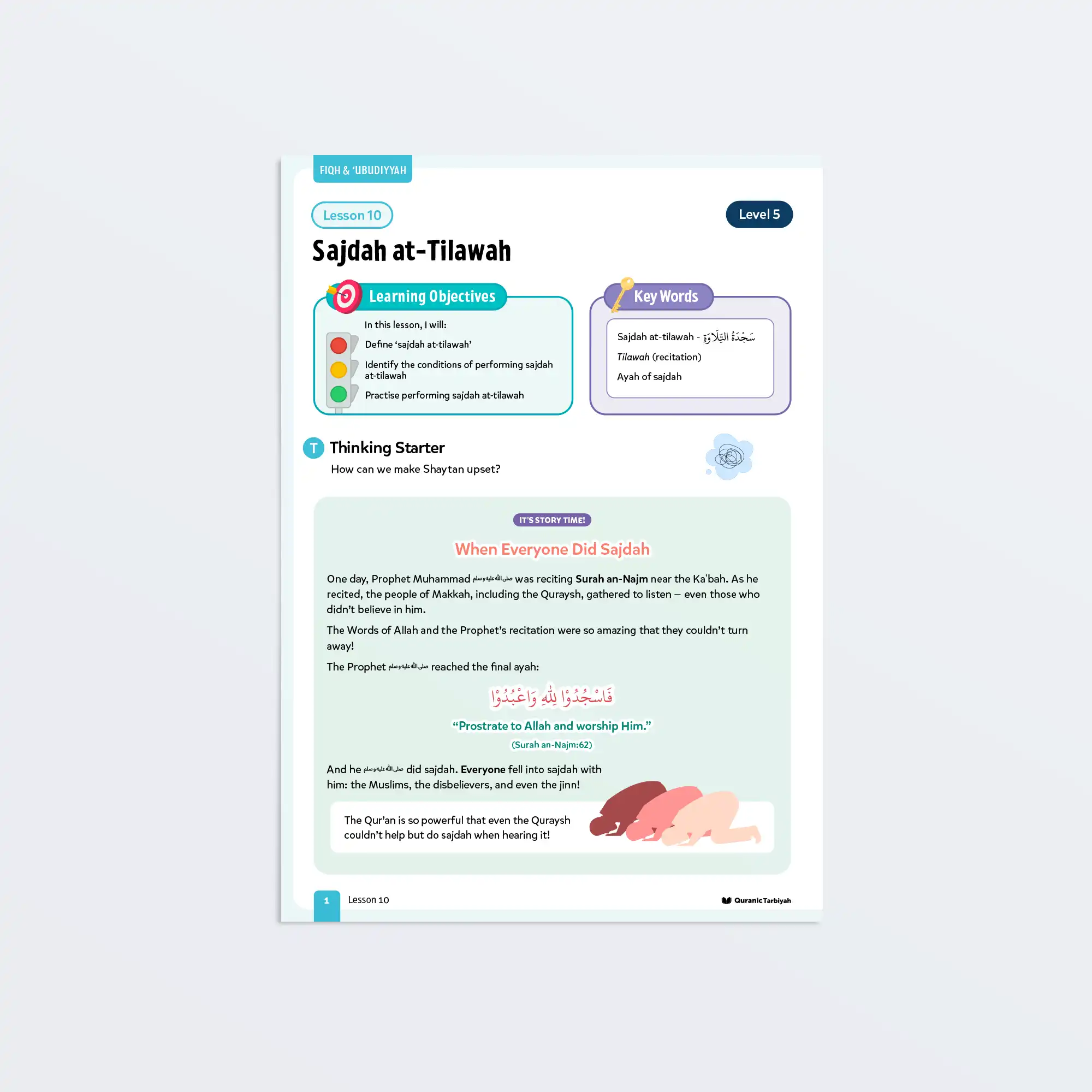 The Qur’an is so powerful that even those who disbelieved could not resist falling into sajdah upon hearing it. Sajdah at-Tilawah is the lesson introducing young learners to one of the noble gestures of devotion connected to the recitation of the Qur’an.