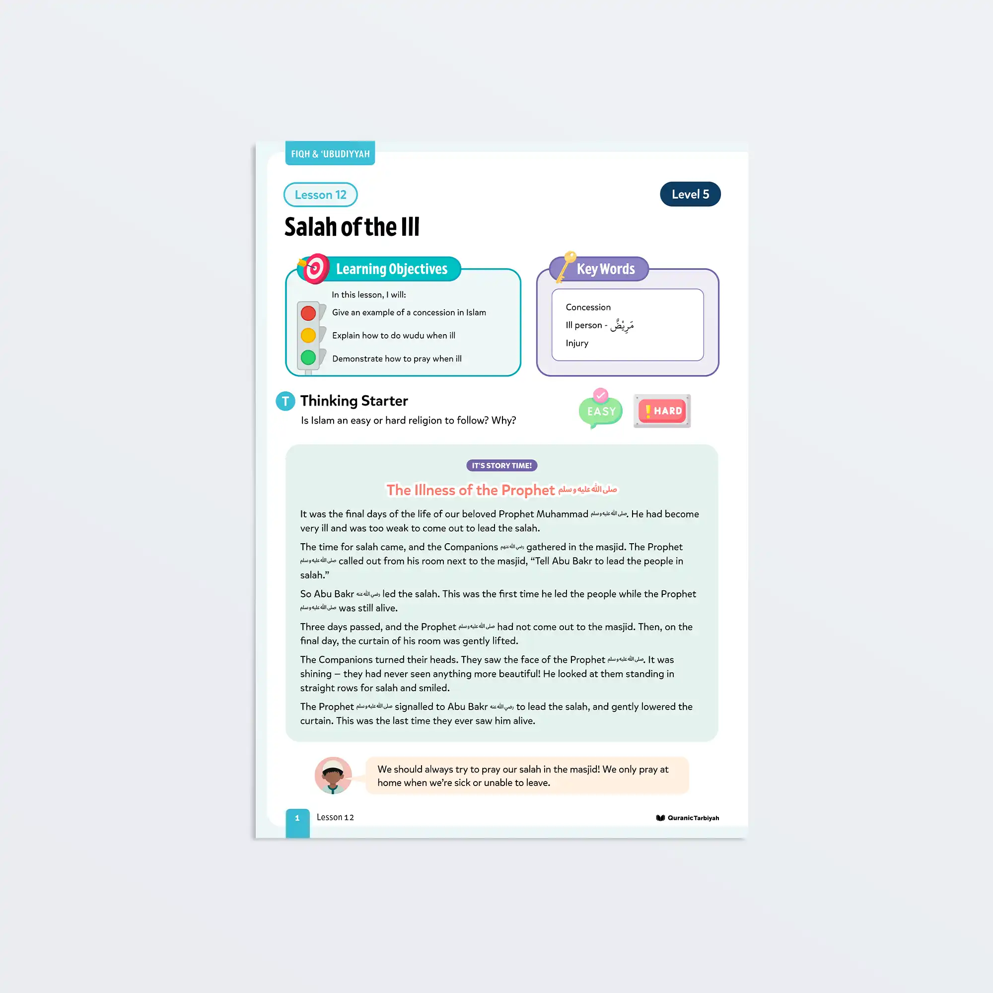 Islam is a religion of ease and one of the most beautiful expressions of this is the way Allah has made worship accessible to every believer, no matter their condition. Salah of the Ill is the lesson that guides young learners through the merciful concessions Islam provides for those who are unwell.