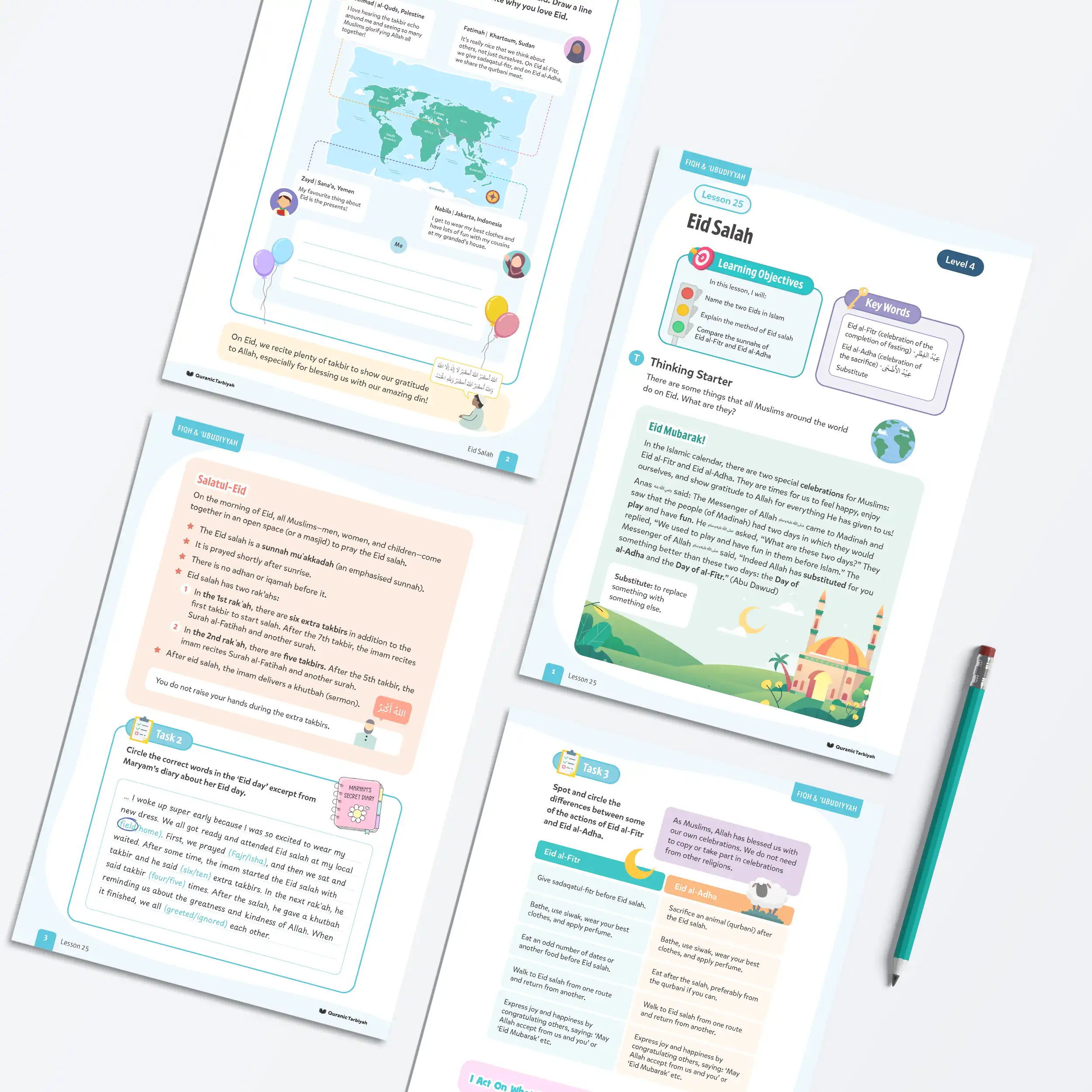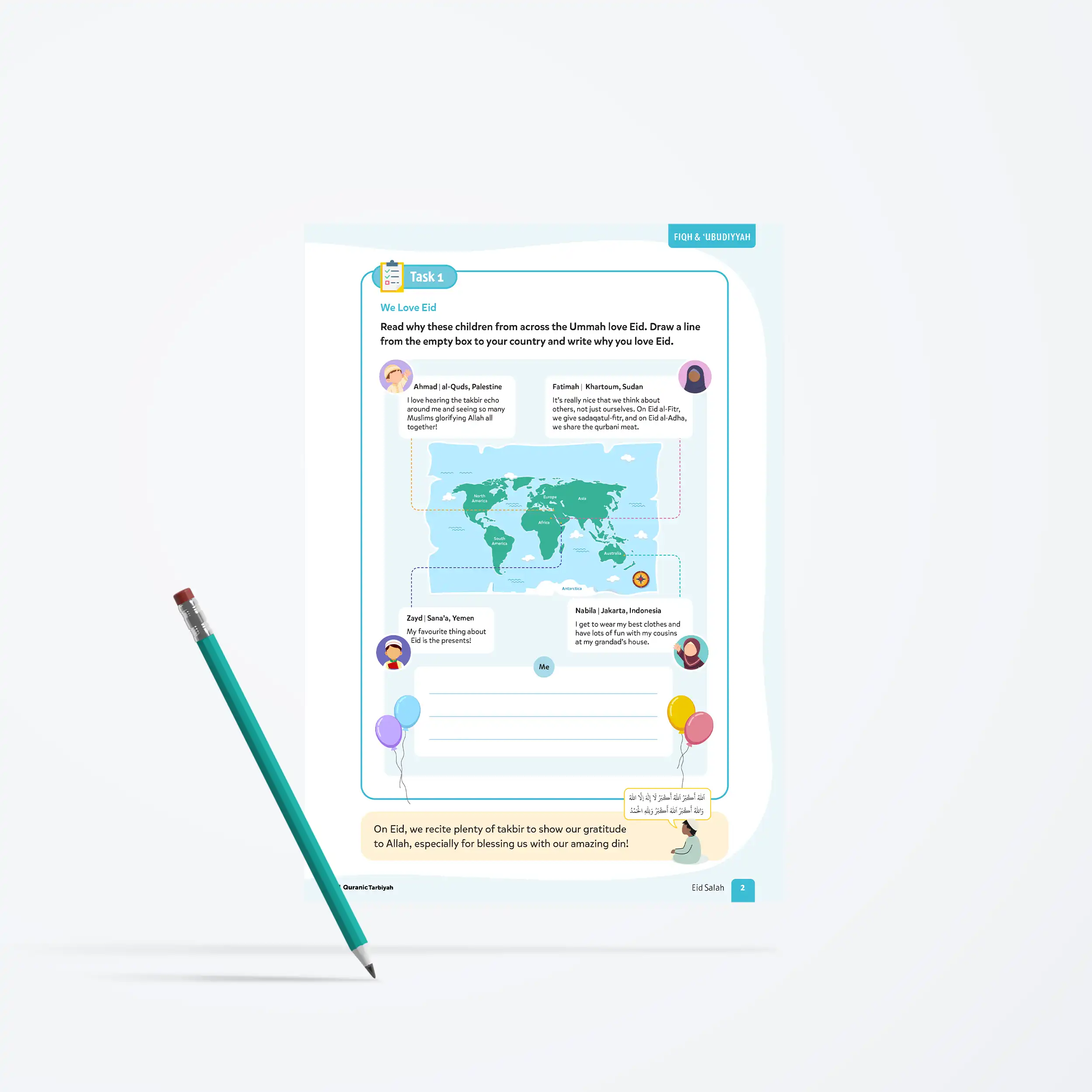 Through interactive activities and authentic hadith from Abu Dawud, learners discover the complete method of Eid salah with its unique seven takbirs in the first rakสฟah and five in the second. The lesson includes a beautiful world map activity connecting children across the Ummah and practical guidance on the different sunnahs for each Eid, helping children understand that Allah has blessed Muslims with our own celebrations.