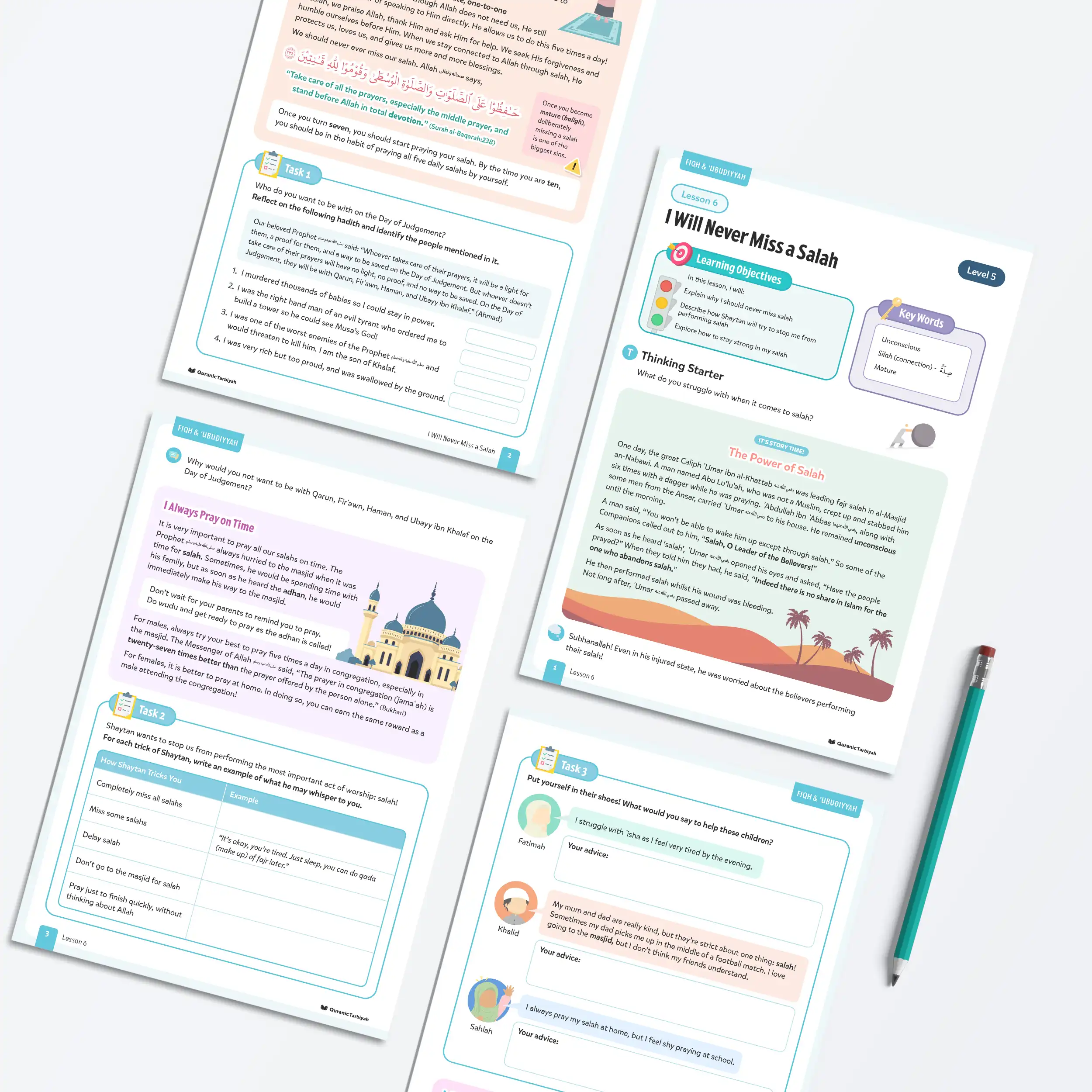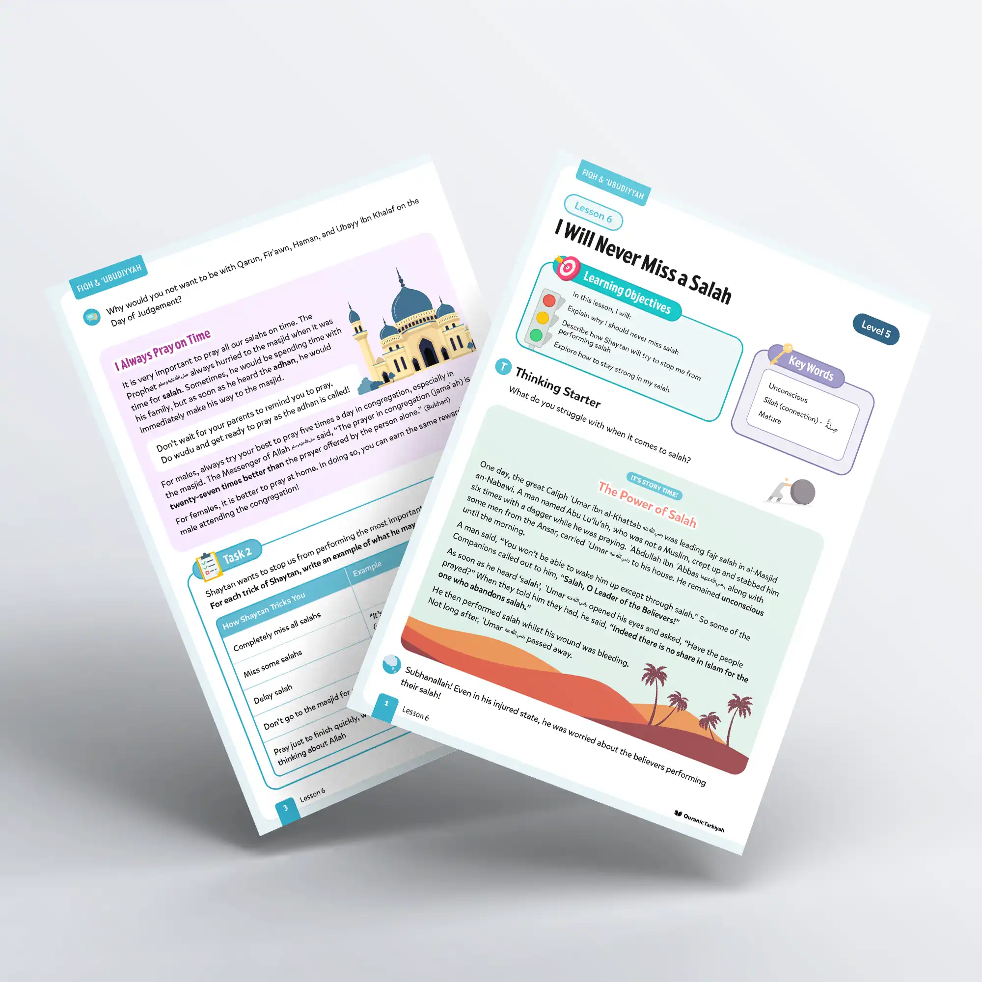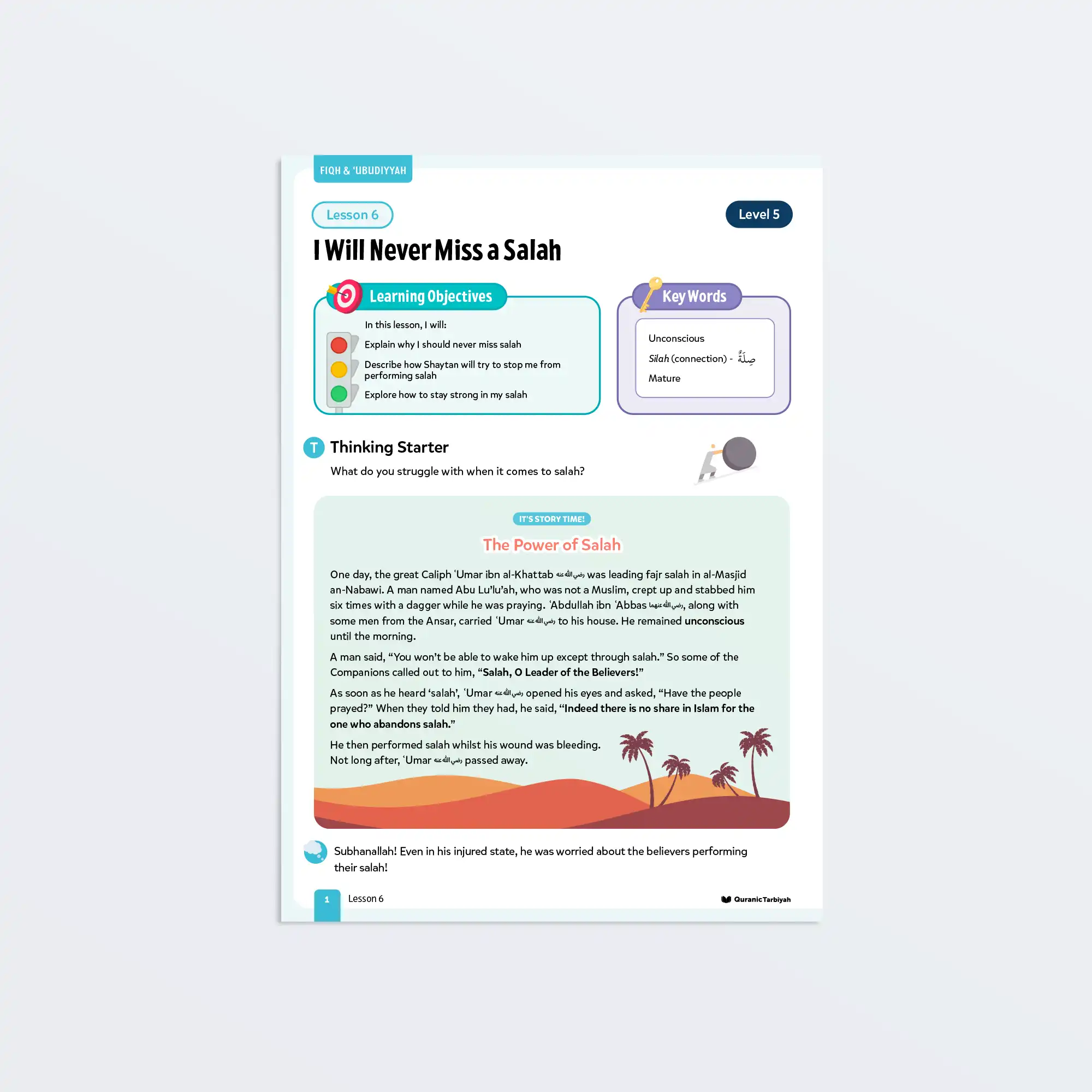 Help young learners develop unwavering commitment to salah through this powerful lesson. This lesson guides young Muslims to understand the profound importance of never missing salah through the inspiring story of ʿUmar ibn al-Khattab, who even whilst fatally wounded insisted on praying. They learn that salah is their direct connection (silah) to Allah and discover how to stay strong against Shaytan’s tricks.