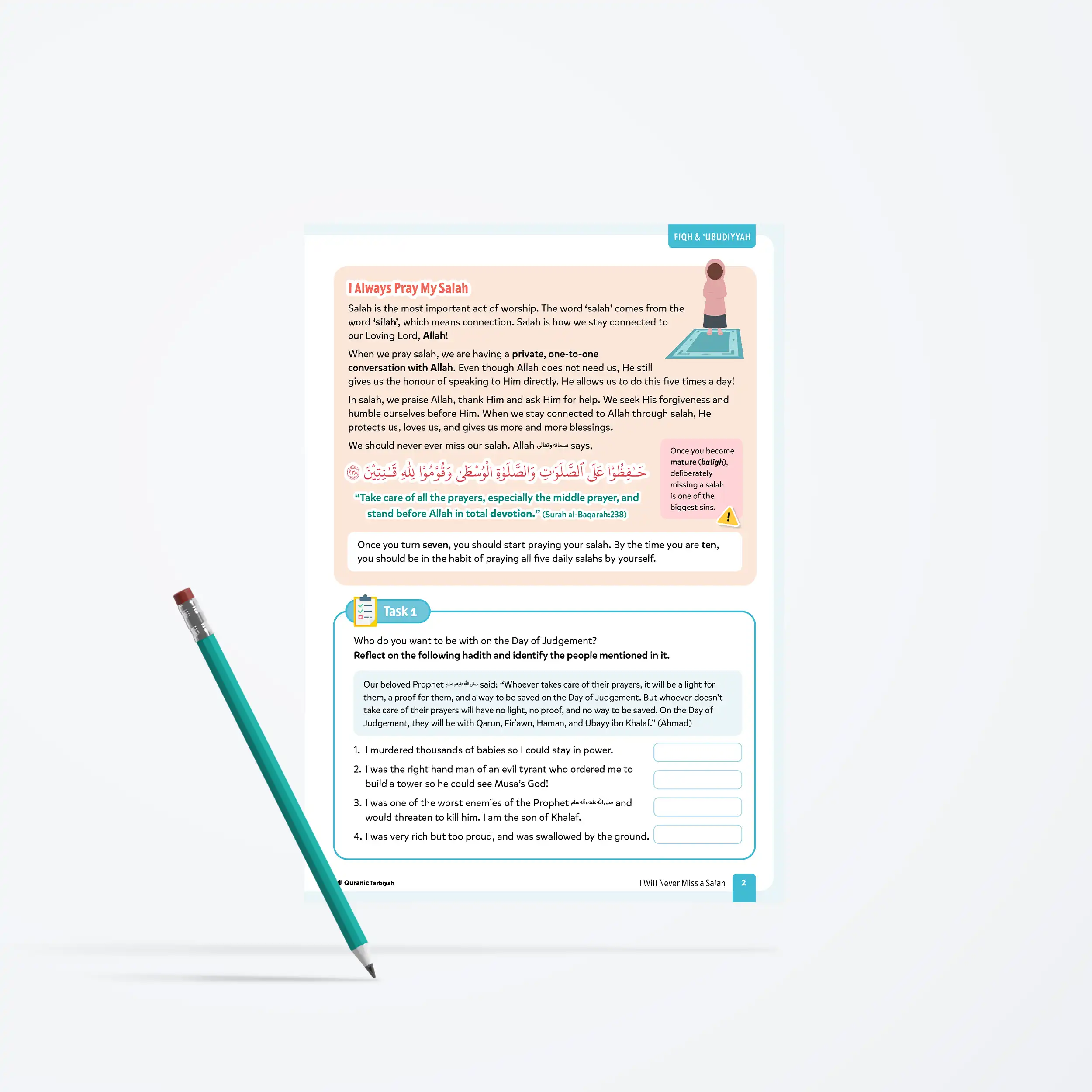 The lesson emphasizes that once children turn seven, they should start praying, and by age ten should pray all five daily salahs independently. Once mature (baligh), deliberately missing salah becomes one of the biggest sins. Through a powerful Hadith, learners discover that those who don’t take care of their prayers will be with Qarun, Firʿawn, Haman, and Ubayy ibn Khalaf on the Day of Judgement.