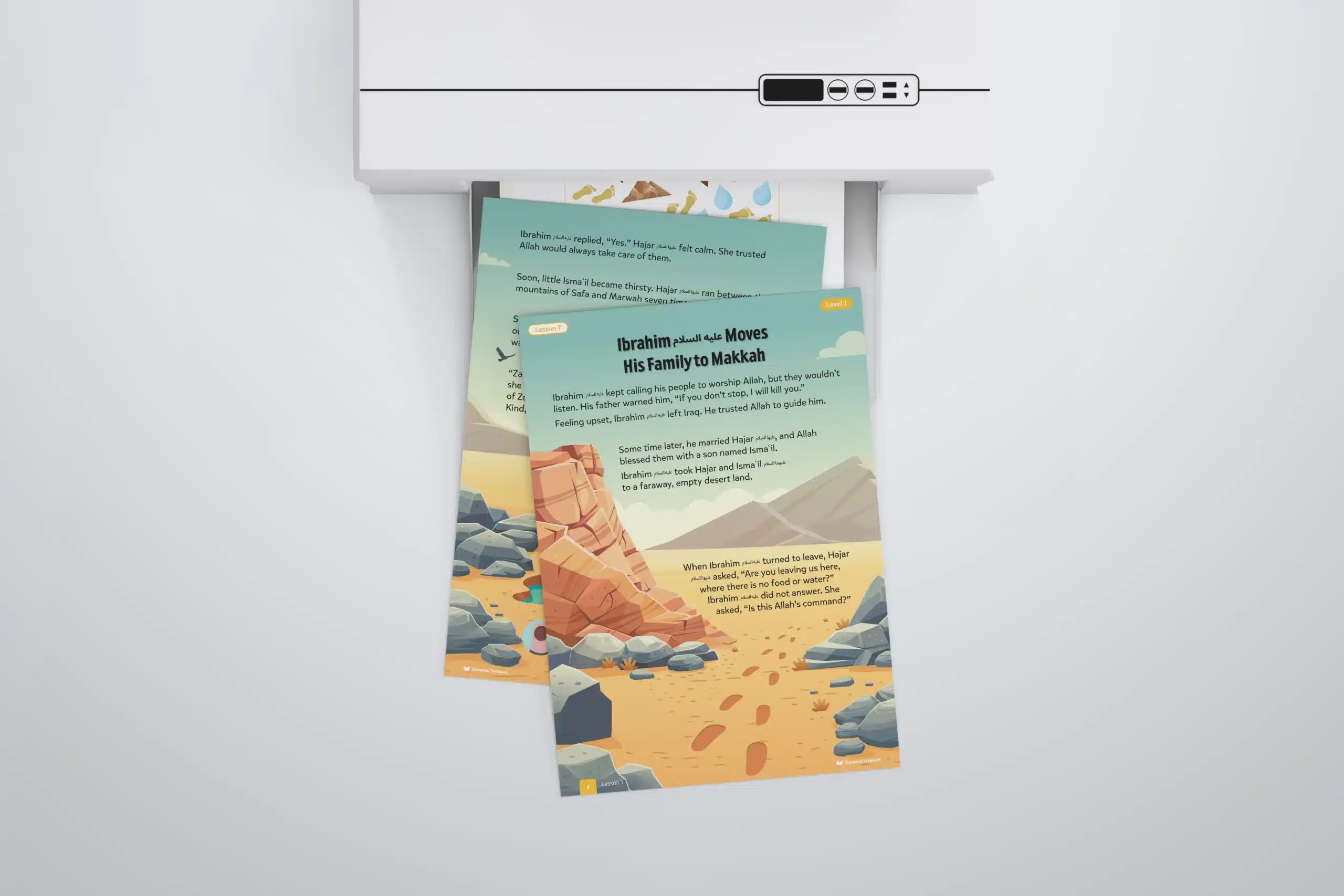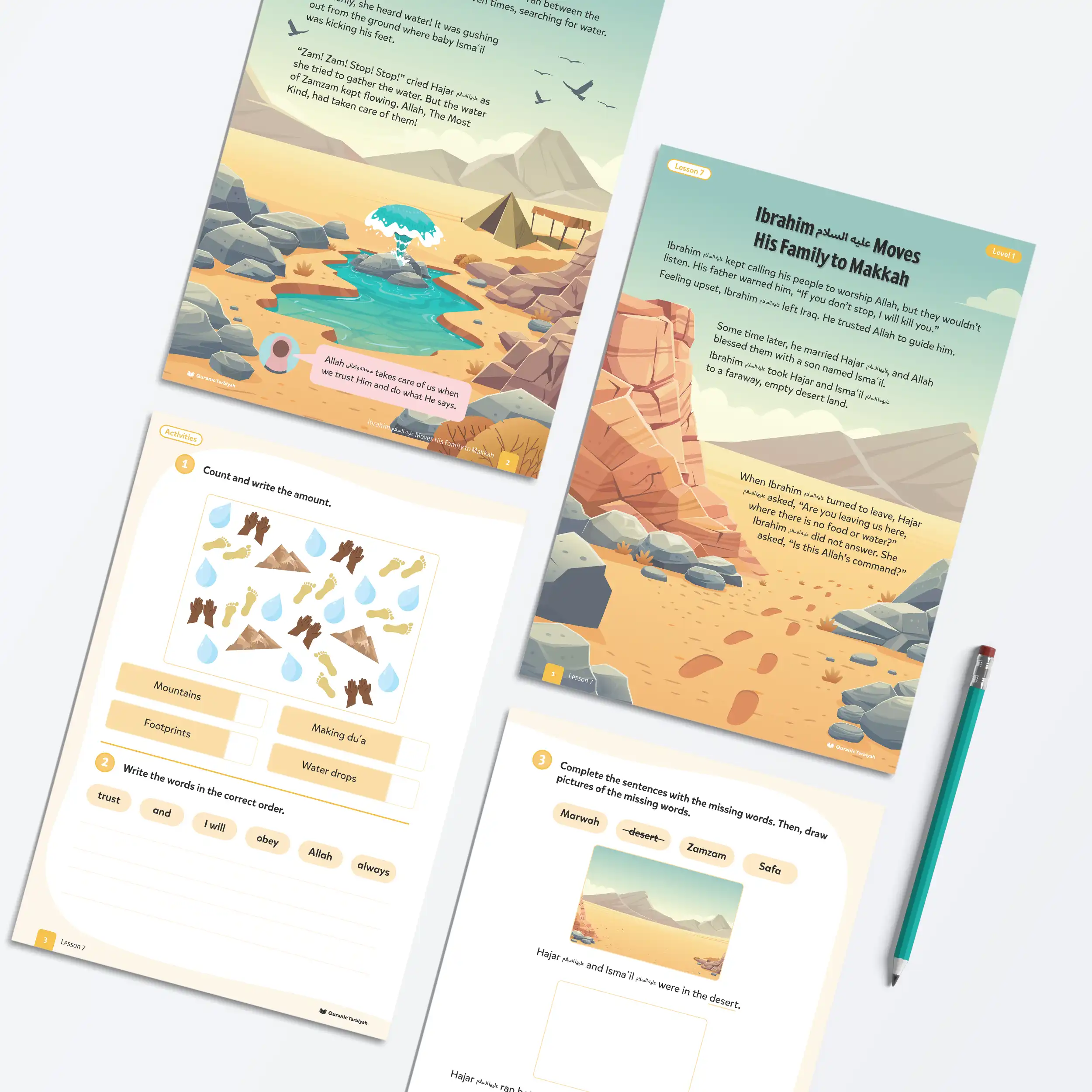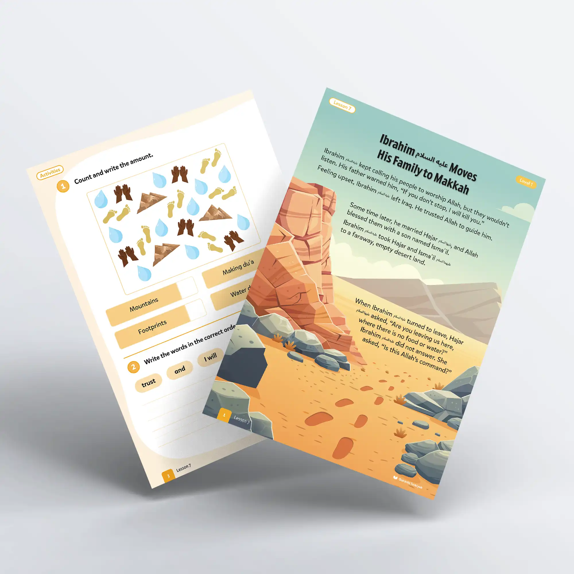 This Sirah lesson tells the story of Prophet Ibrahim عليه السلام and one of the greatest acts of trust in Allah ever recorded, in a way that young learners will remember for years to come. It follows Ibrahim عليه السلام as he leaves Iraq, begins a new family, and carries out Allah’s command to settle Hajar عليها السلام and baby Ismaʿil عليه السلام alone in the empty desert of Makkah.