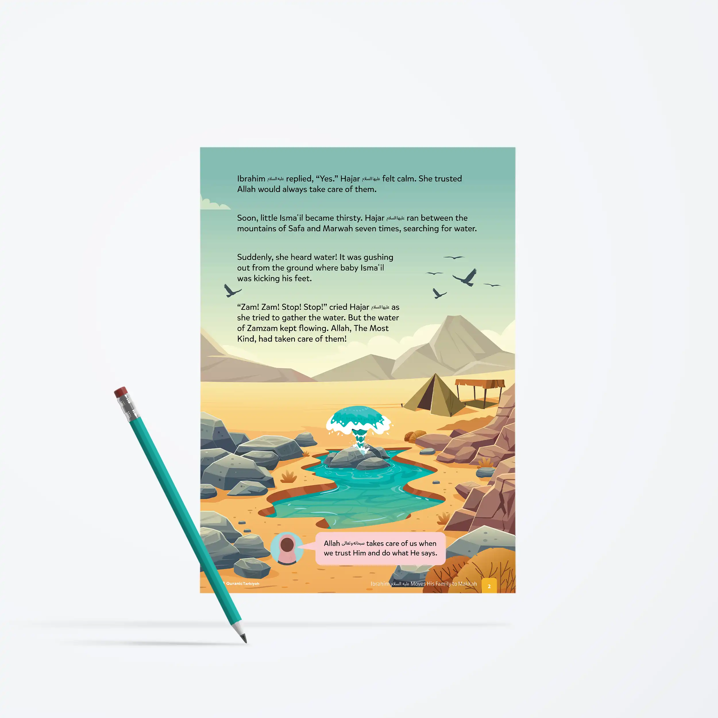 Through full-colour illustrations and gentle storytelling, learners witness Hajar عليها السلام trust in Allah as she runs between the mountains of Safa and Marwah seven times in search of water for her thirsty child. They discover how Allah, the Most Kind, answers her trust by sending the blessed water of Zamzam gushing from the ground. At the heart of the story is a message every child can hold on to: Allah takes care of us when we trust Him and do what He says.