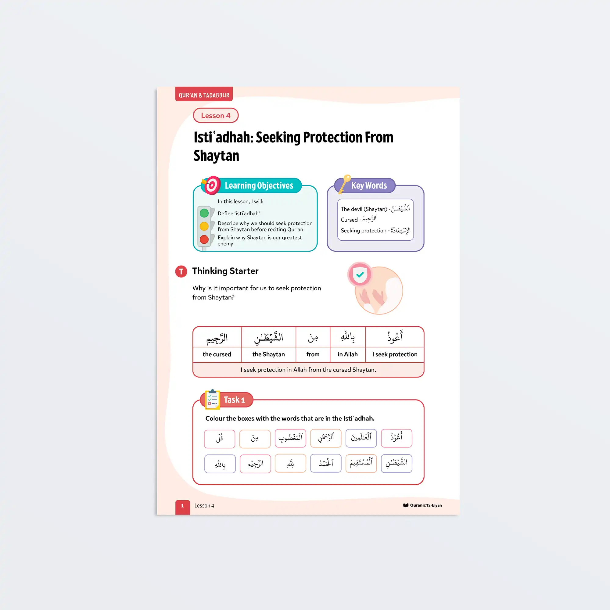 Give young learners practical spiritual tools to protect themselves from negative influences. This engaging lesson provides everything needed for learners to recognise Shaytan’s tricks and seek Allah’s mighty protection through the powerful words of istiʿadhah.