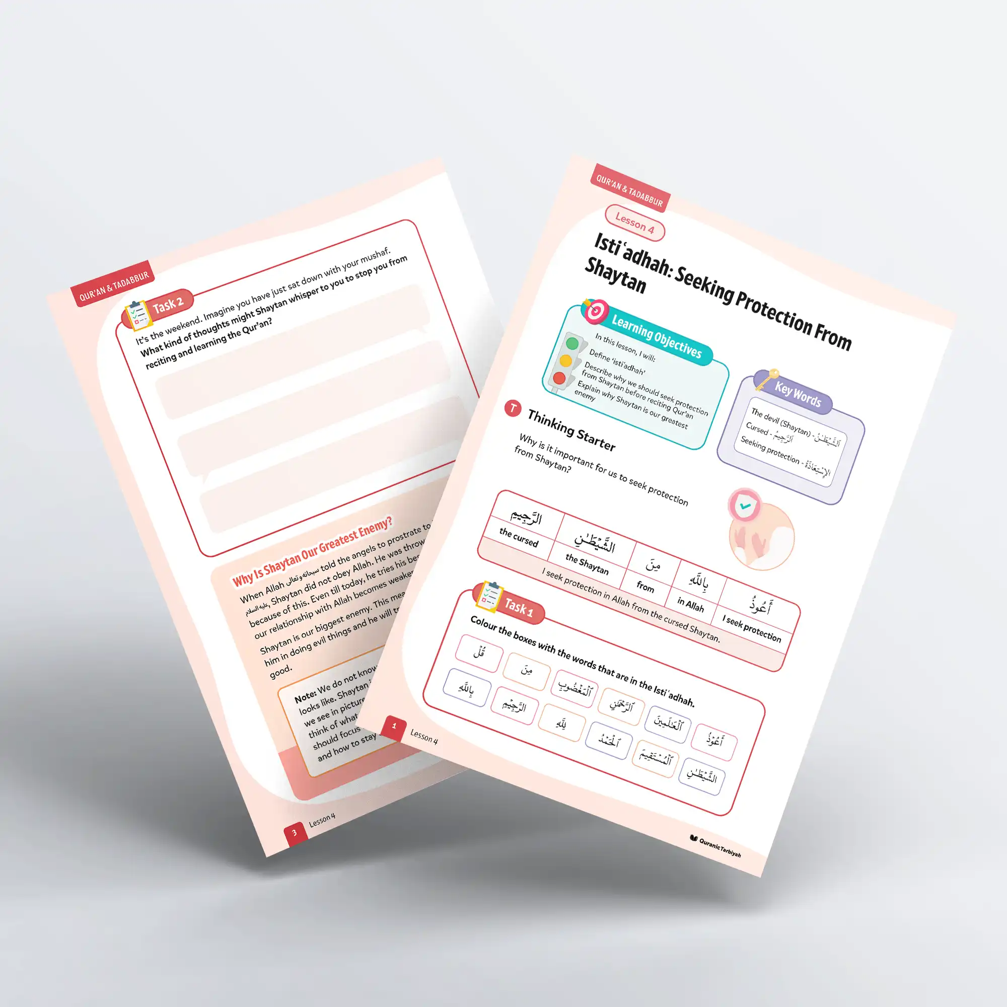 This essential lesson teaches learners that Shaytan’s mission is to distract us from goodness and break our connection with Allah. They will discover practical ways to recognise Shaytan’s whispers, understand his tactics of making us tired, planting evil thoughts, and making other things seem more important, and learn when to say the powerful words of istiʿadhah throughout their day.