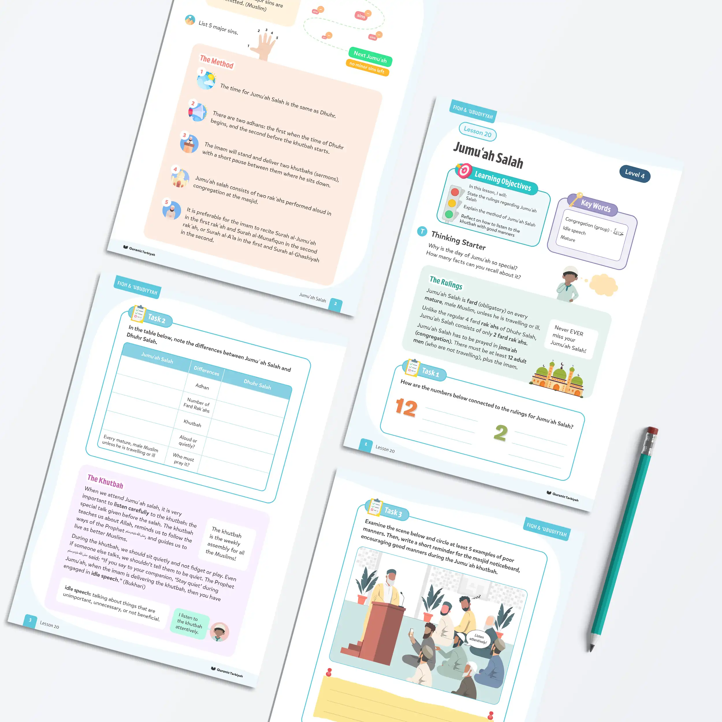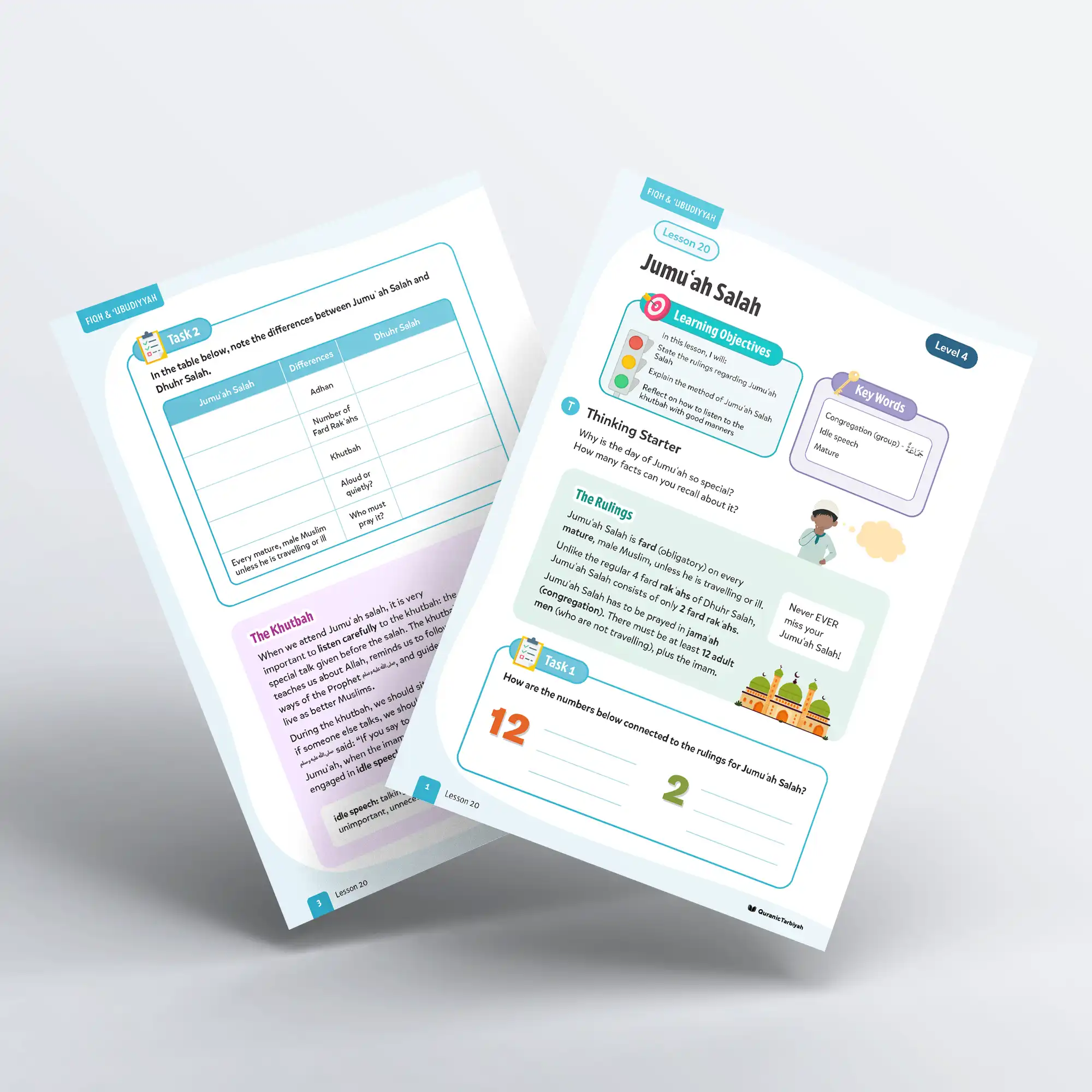 Master the essential rulings and method of Jumuʿah Salah with this comprehensive lesson that teaches young learners everything they need to know about Friday’s obligatory congregational prayer. Building on the blessings of Jumuʿah, this lesson provides practical guidance on how to properly perform and attend the weekly gathering that unites the Muslim community.