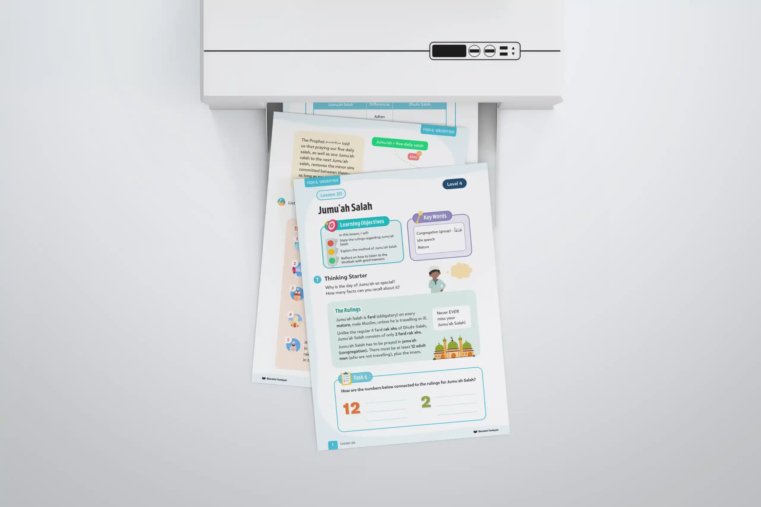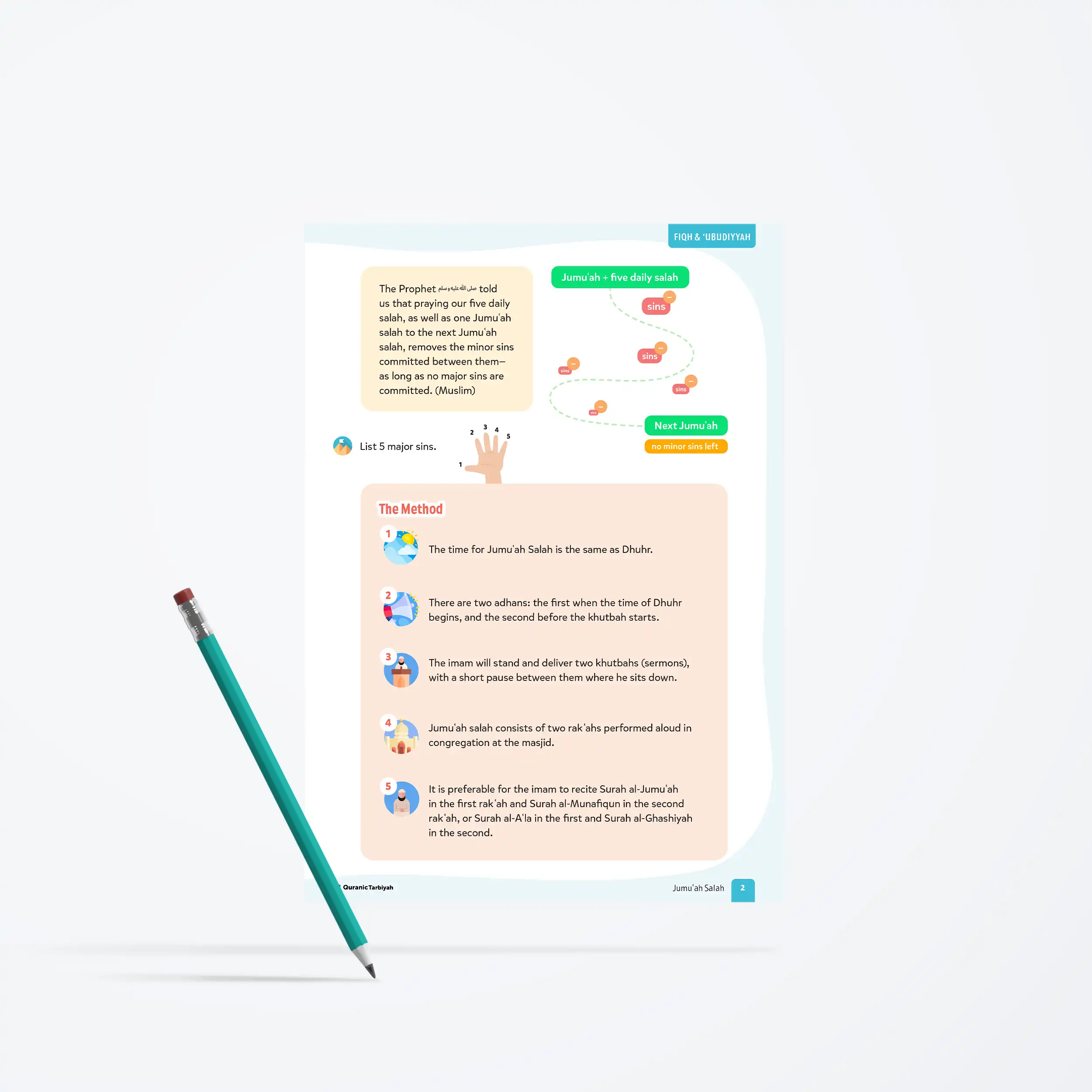 Through clear explanations and engaging activities, children learn the unique rulings that distinguish Jumuʿah Salah from regular Dhuhr prayer. They discover why this special two-rakʿah prayer must be performed in congregation with at least twelve adult men plus the imam, and understand who is obligated to attend this blessed gathering.