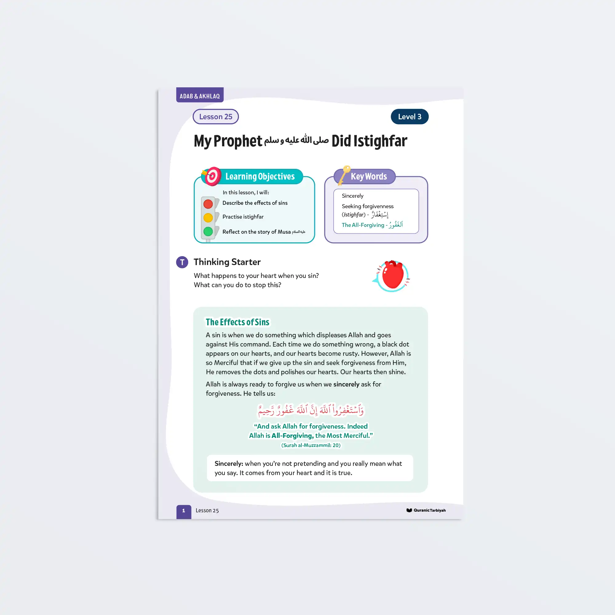 This heartwarming lesson teaches young learners that making mistakes is human but seeking forgiveness is what matters most. Through the touching story of Prophet Musa عَلَيْهِ ٱلسَّلَامُ and the beautiful example of our beloved Prophet ﷺ doing istighfar daily, young learners will understand that Allah’s mercy is always available and that sincere repentance can polish even the rustiest hearts back to their original shine.