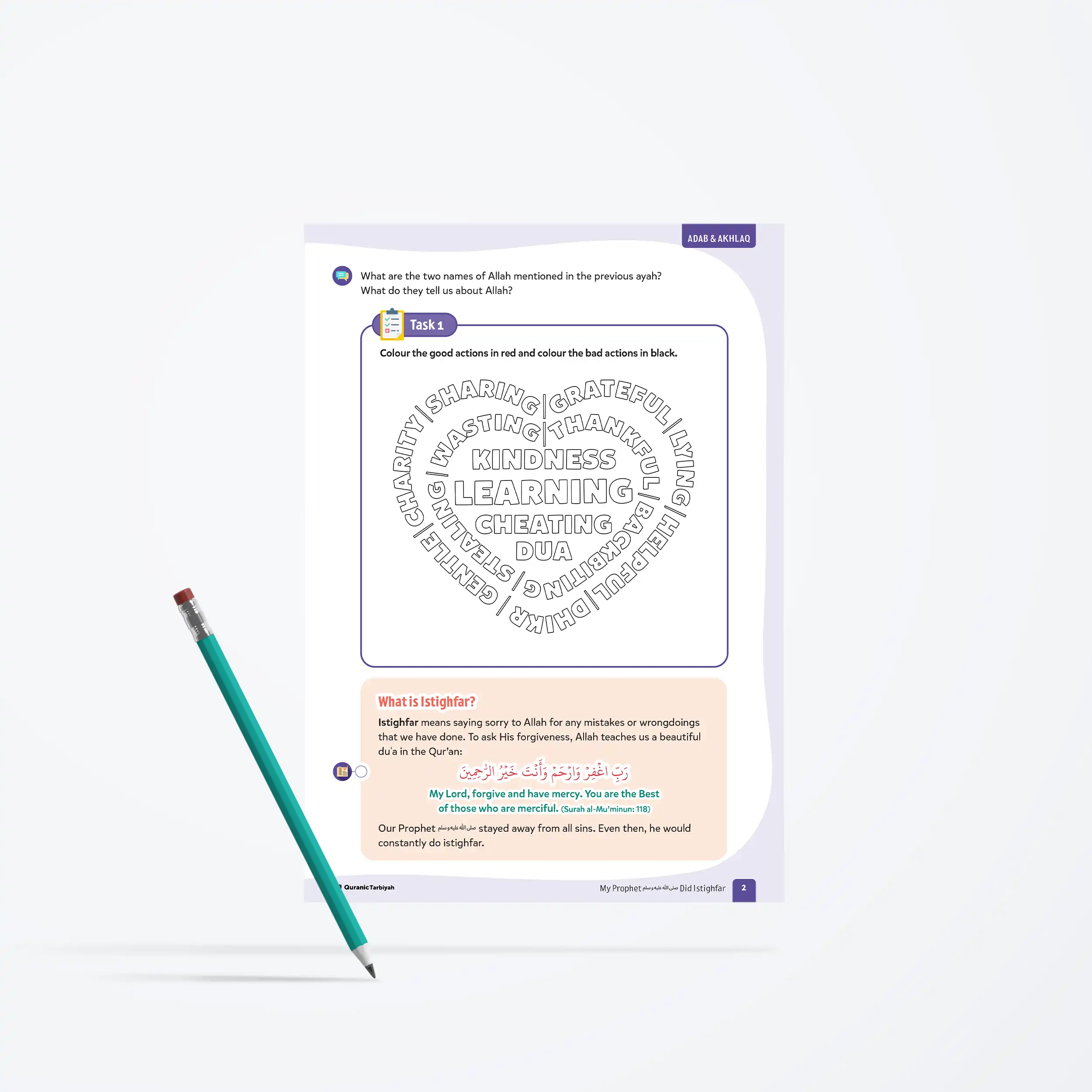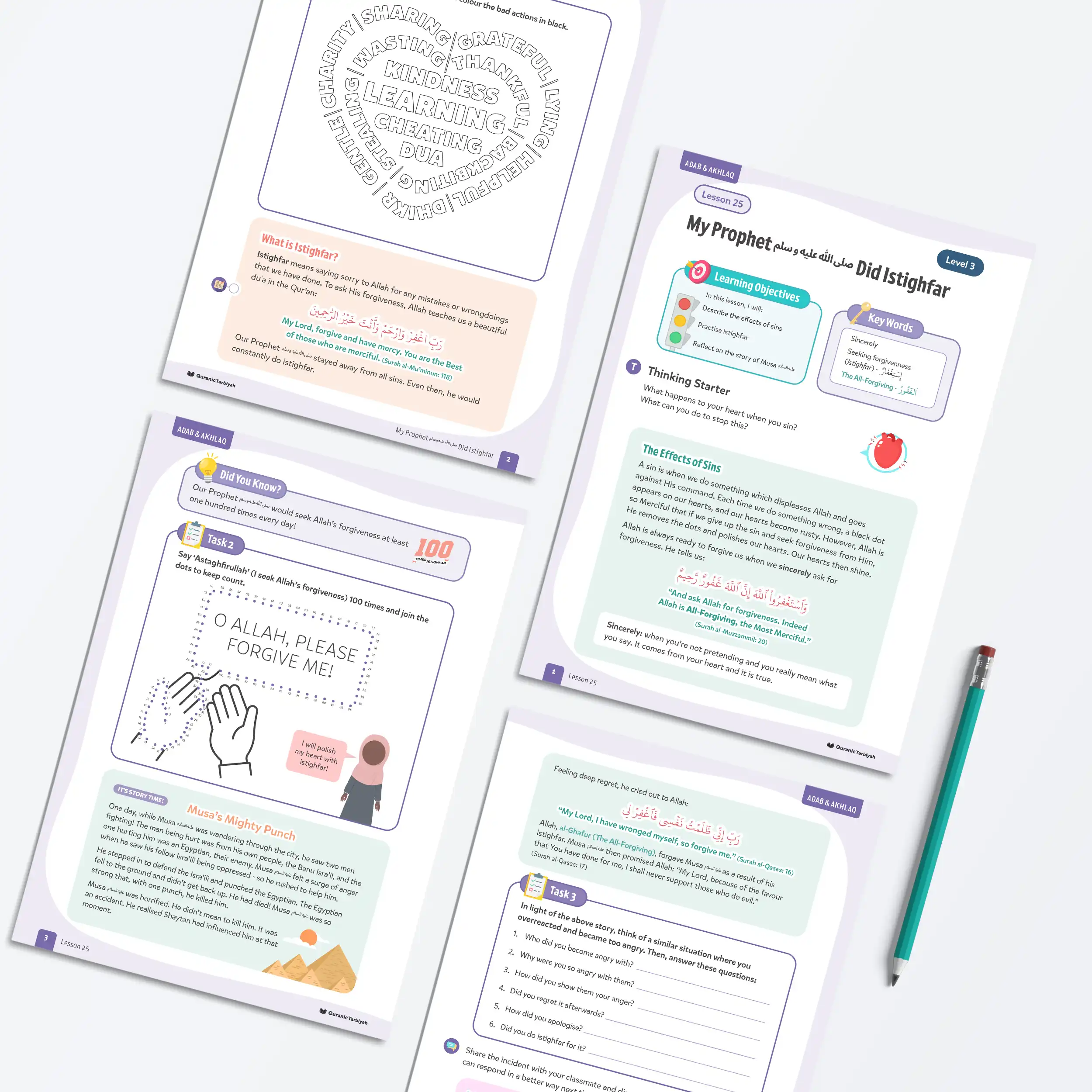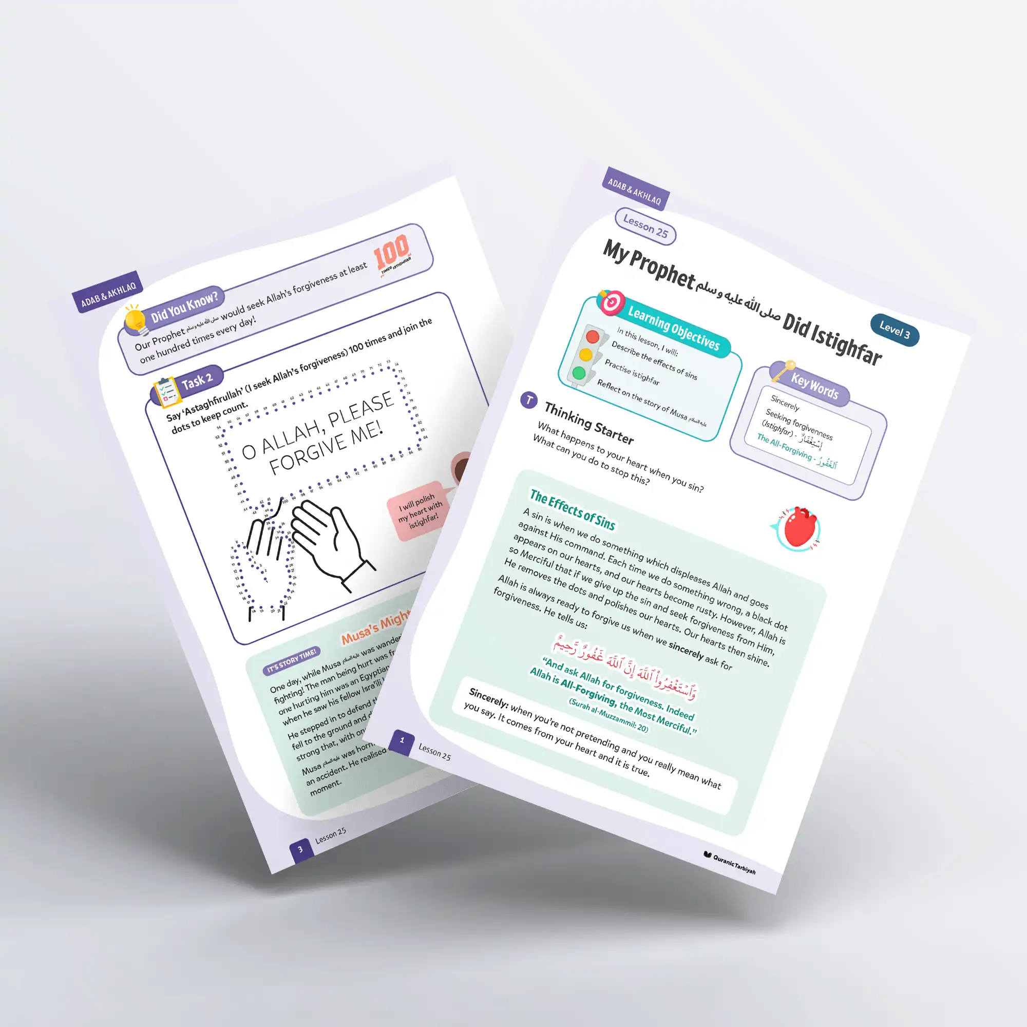 Explore how sins create black dots on our hearts and how istighfar polishes them clean Learn the beautiful Qur’anic duʿa for seeking forgiveness from Surah al-Muʾminun Discover that our beloved Prophet ﷺ sought Allah’s forgiveness at least 100 times daily Complete an engaging dot-to-dot activity whilst saying “Astaghfirullah” 100 times Experience the powerful story of Prophet Musa’s n mighty punch and his immediate istighfar Colour good actions in red and bad actions in black to understand right from wrong