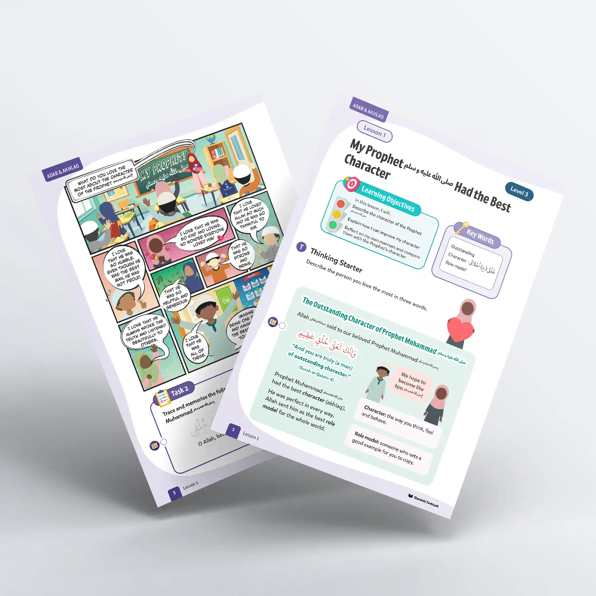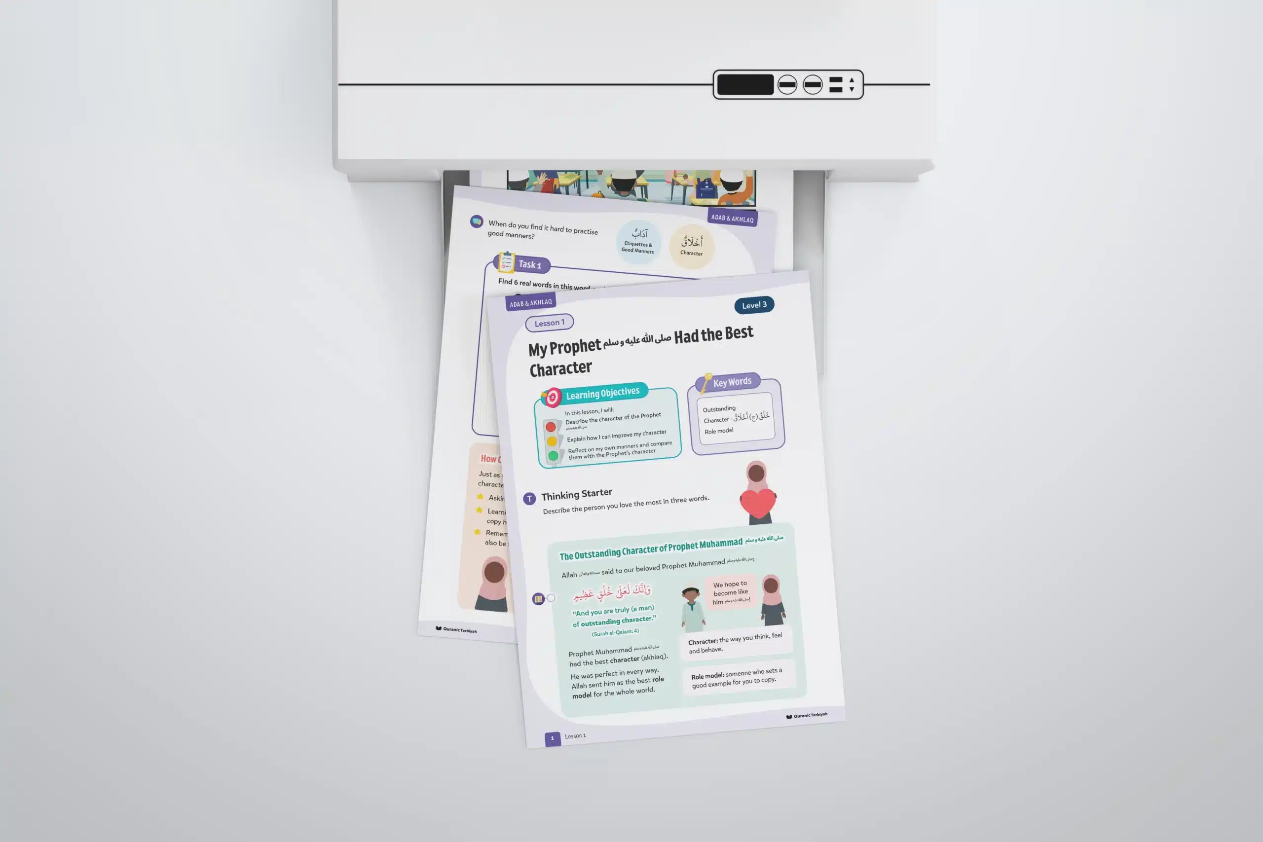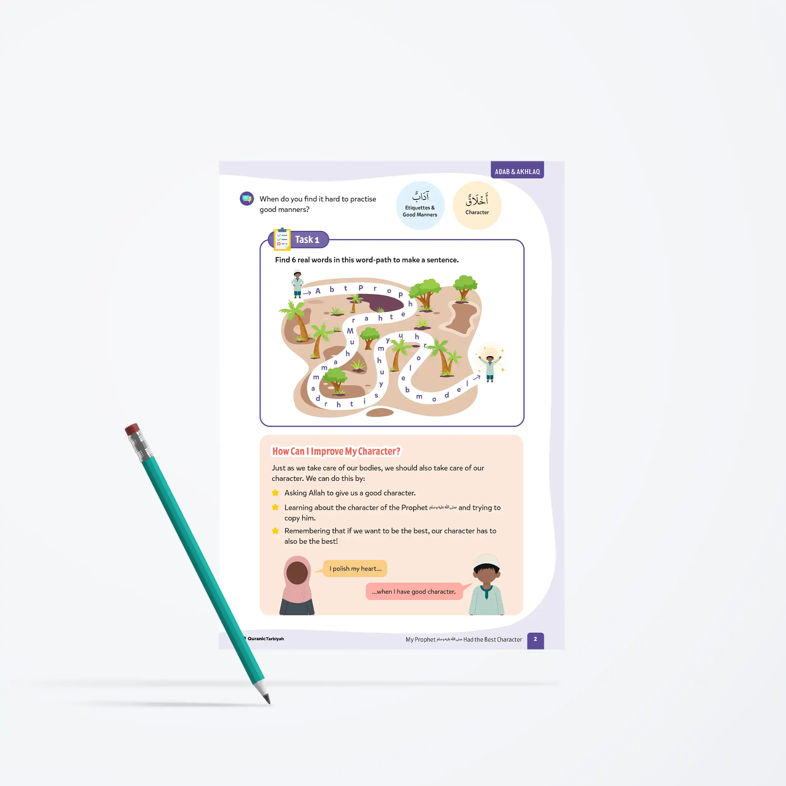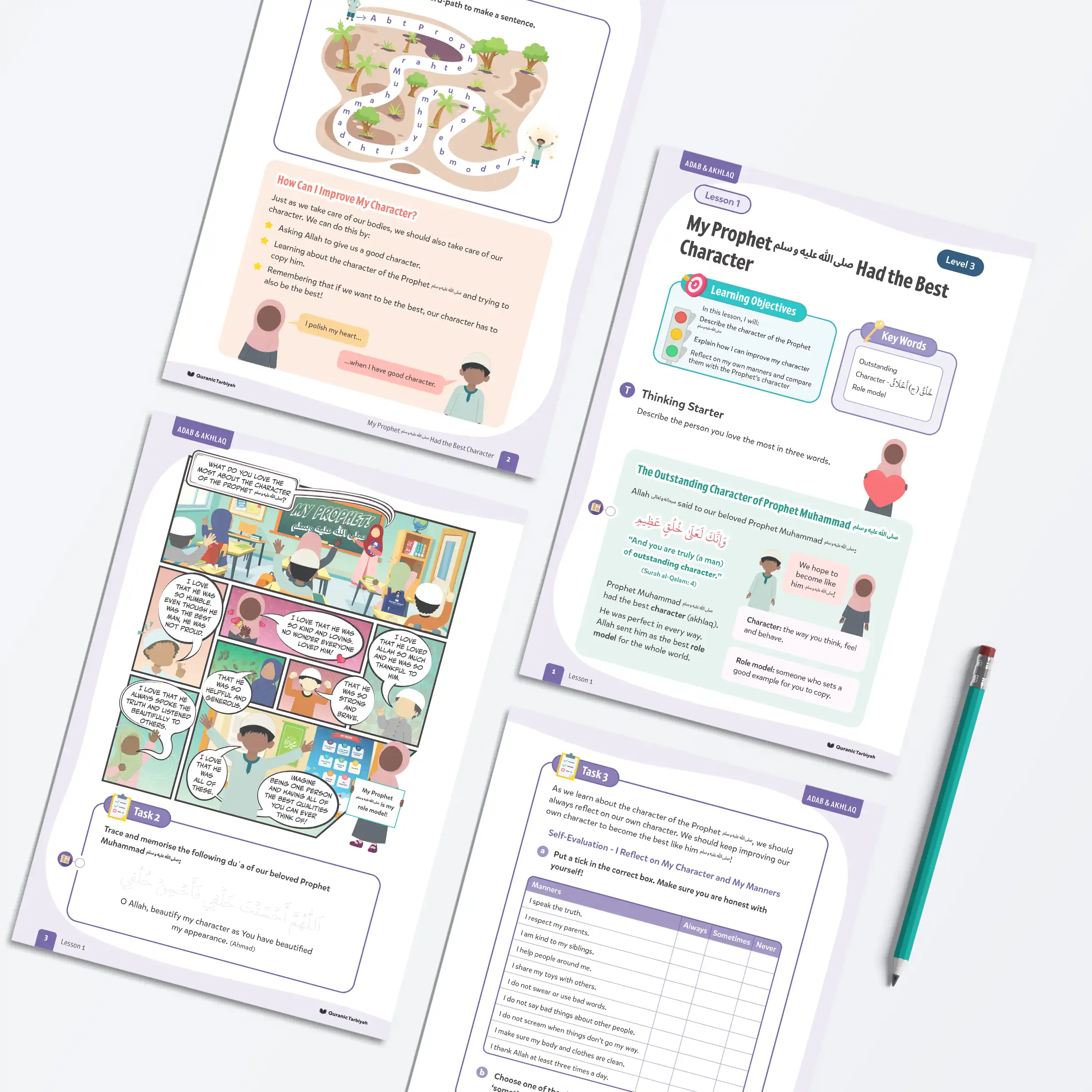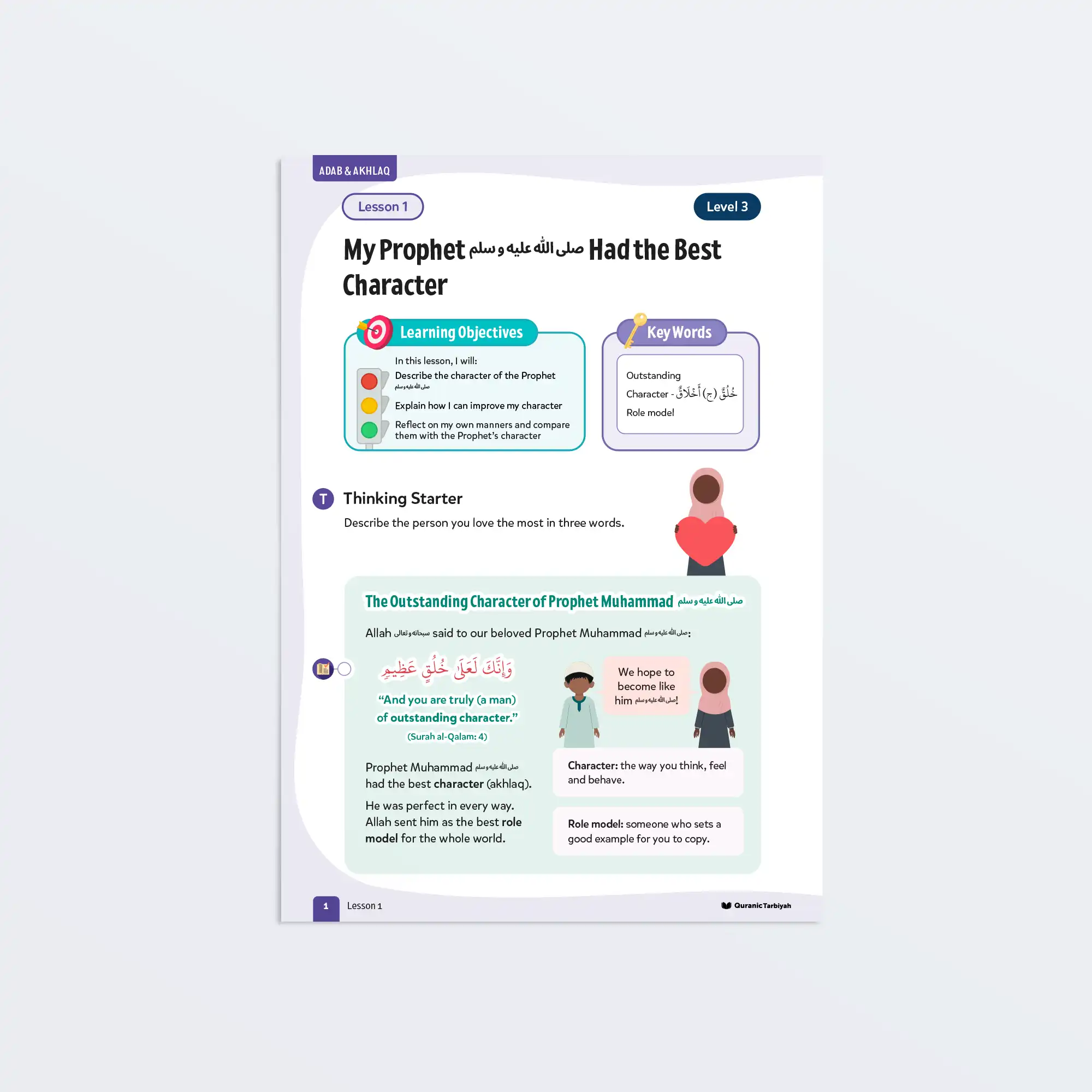 Through interactive activities and thoughtful reflection exercises, learners explore what it means to have good character and how they can follow the example of our beloved Prophet ﷺ in their daily lives. The lesson includes a beautiful duʿa that children can trace and memorise, asking Allah to beautify their character, alongside practical self-evaluation tools to help them reflect on their own manners.