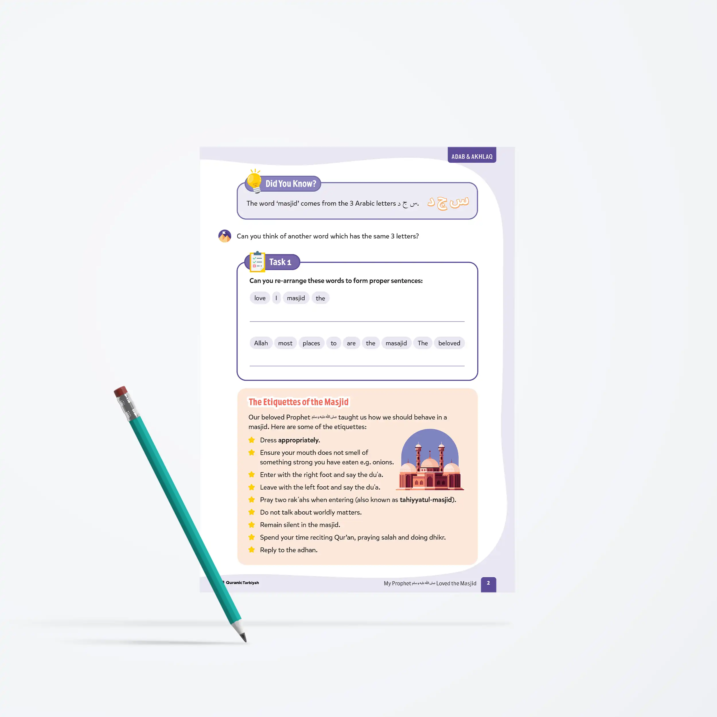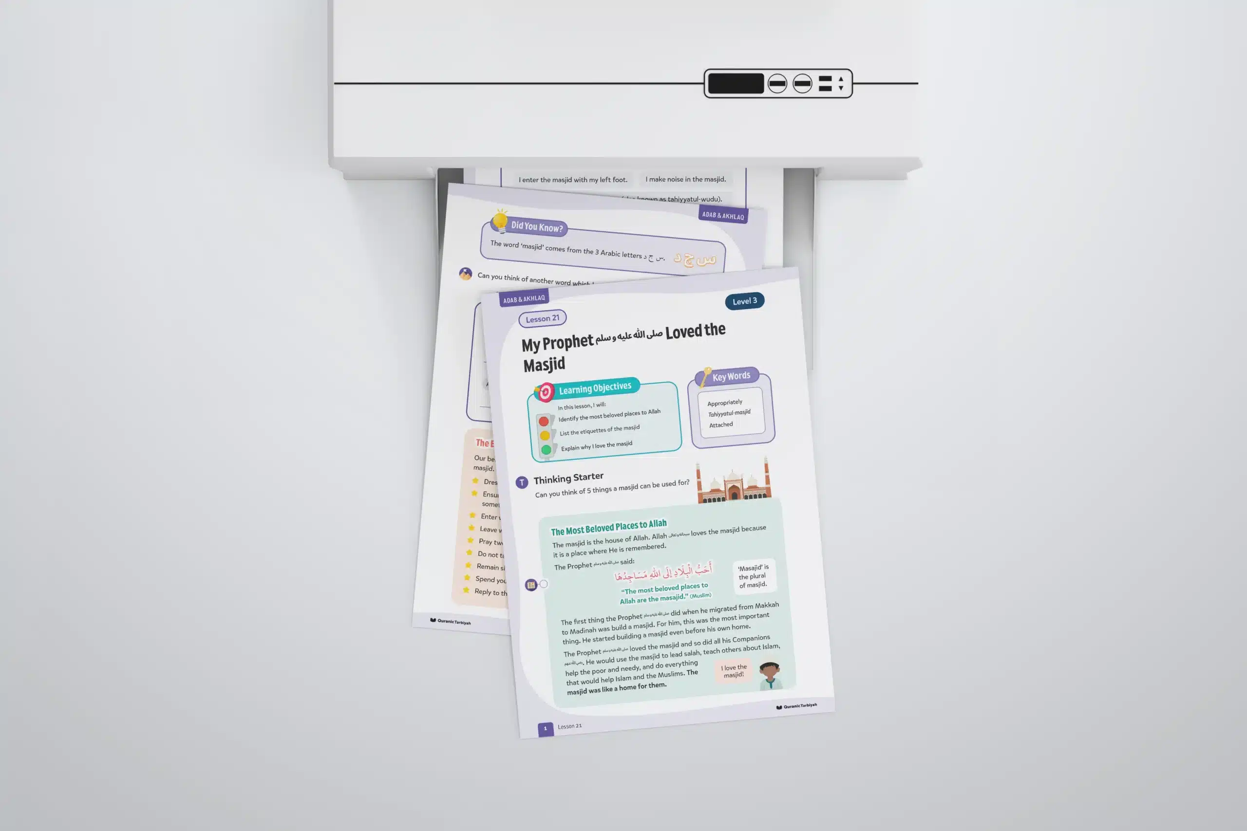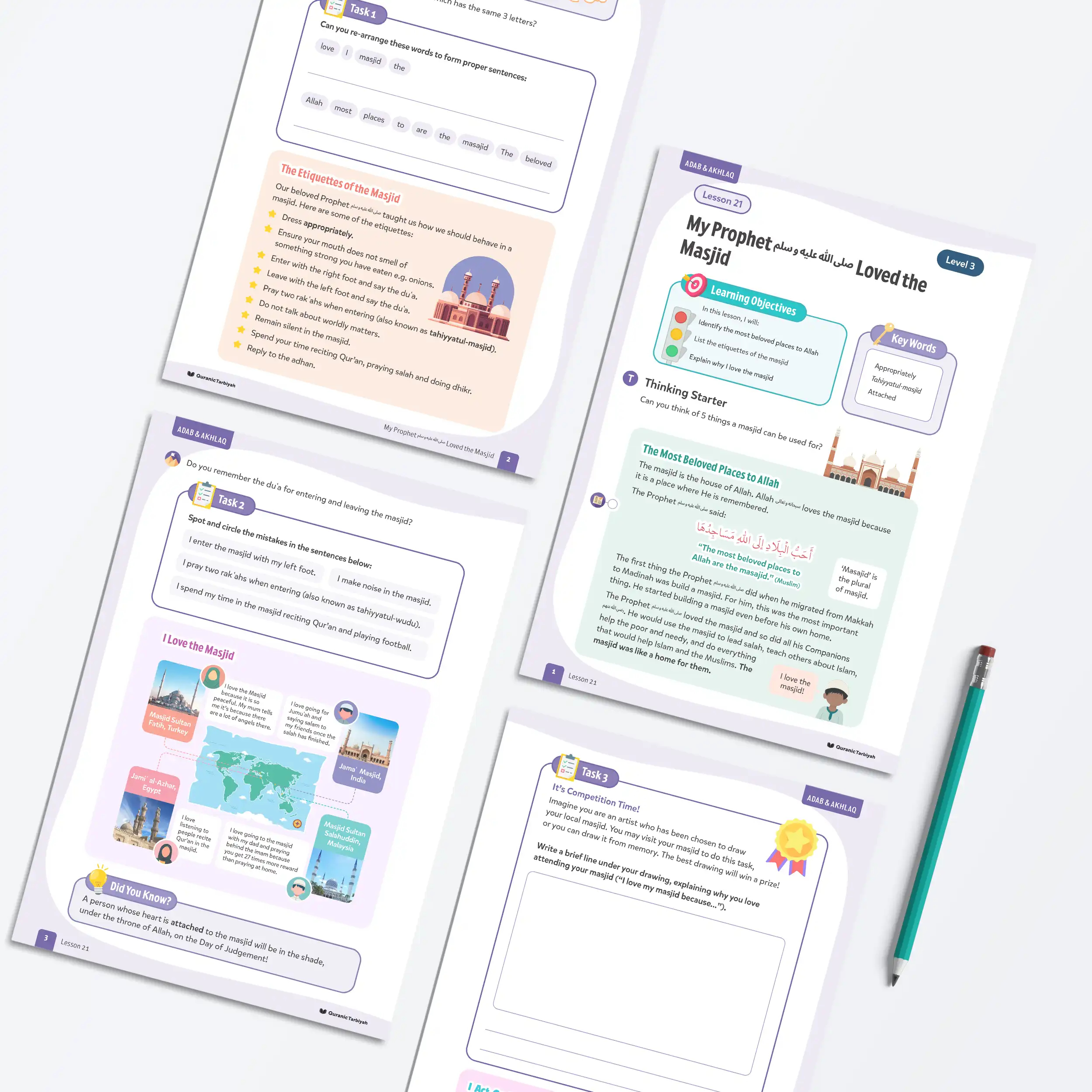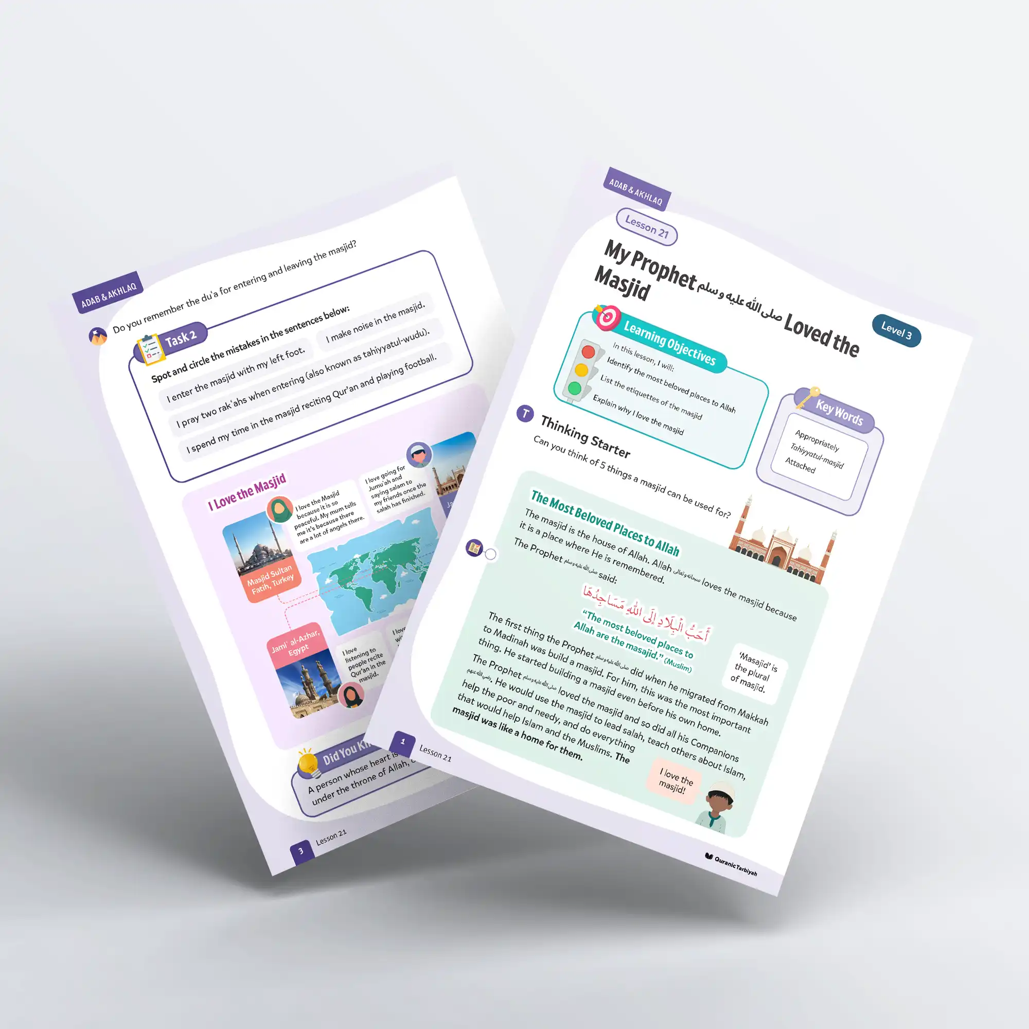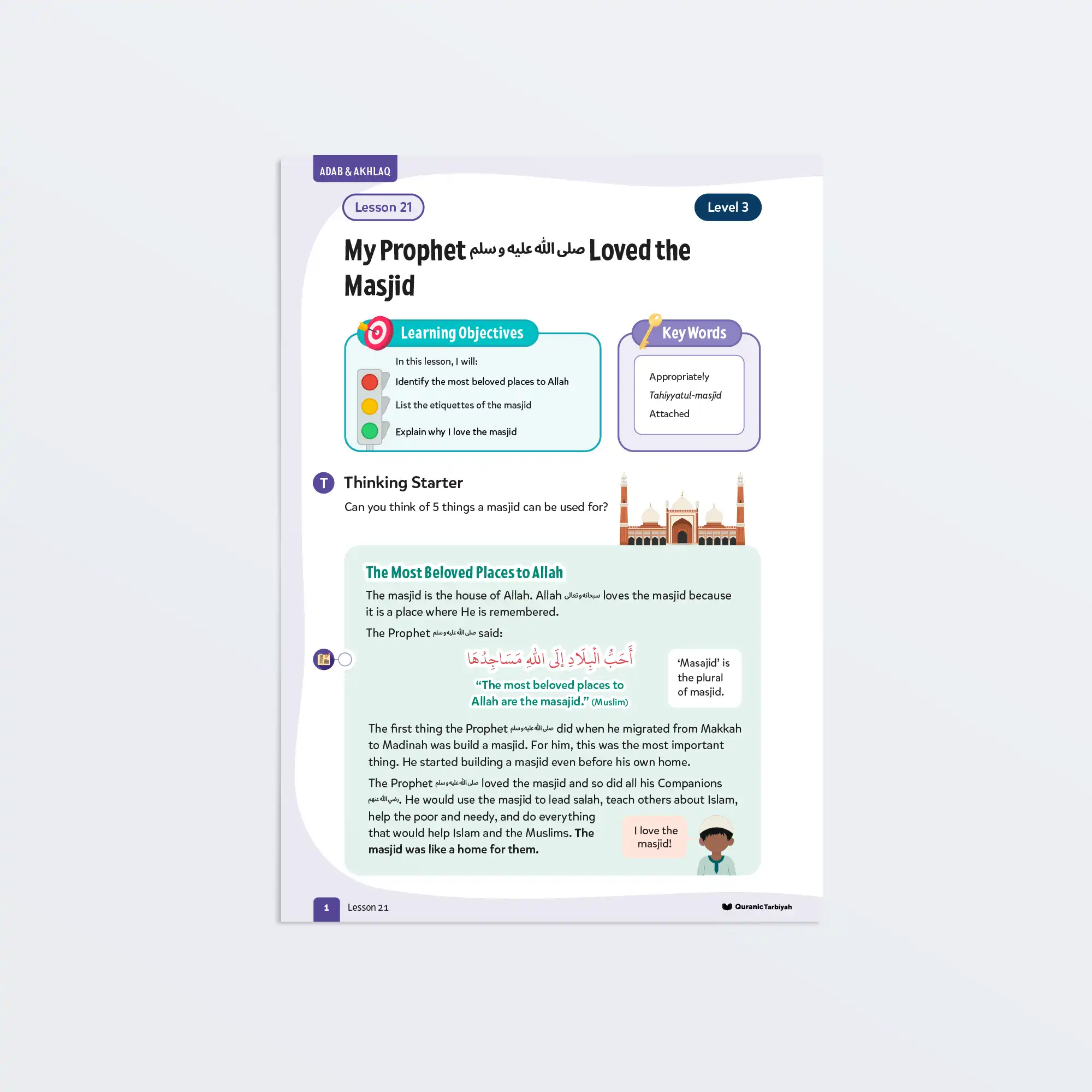 This thoughtfully designed lesson helps children understand that the masjid is the house of Allah, a place where He is remembered and loved. Through reflection and creative activities, learners discover why people love the masjid, from its peacefulness and beautiful Qur’an recitation to the community spirit of Jumuʿah and the multiplied rewards of congregational prayer.