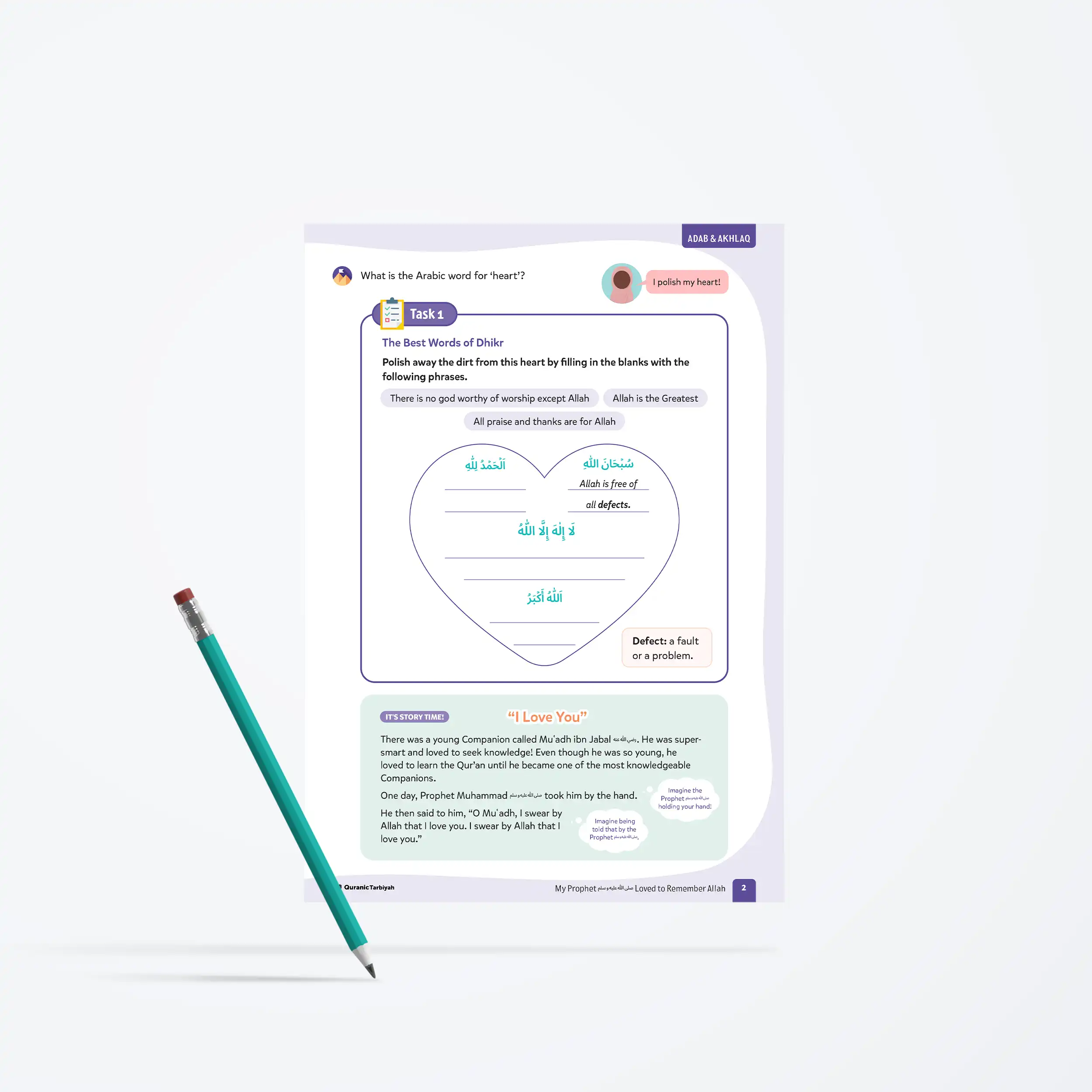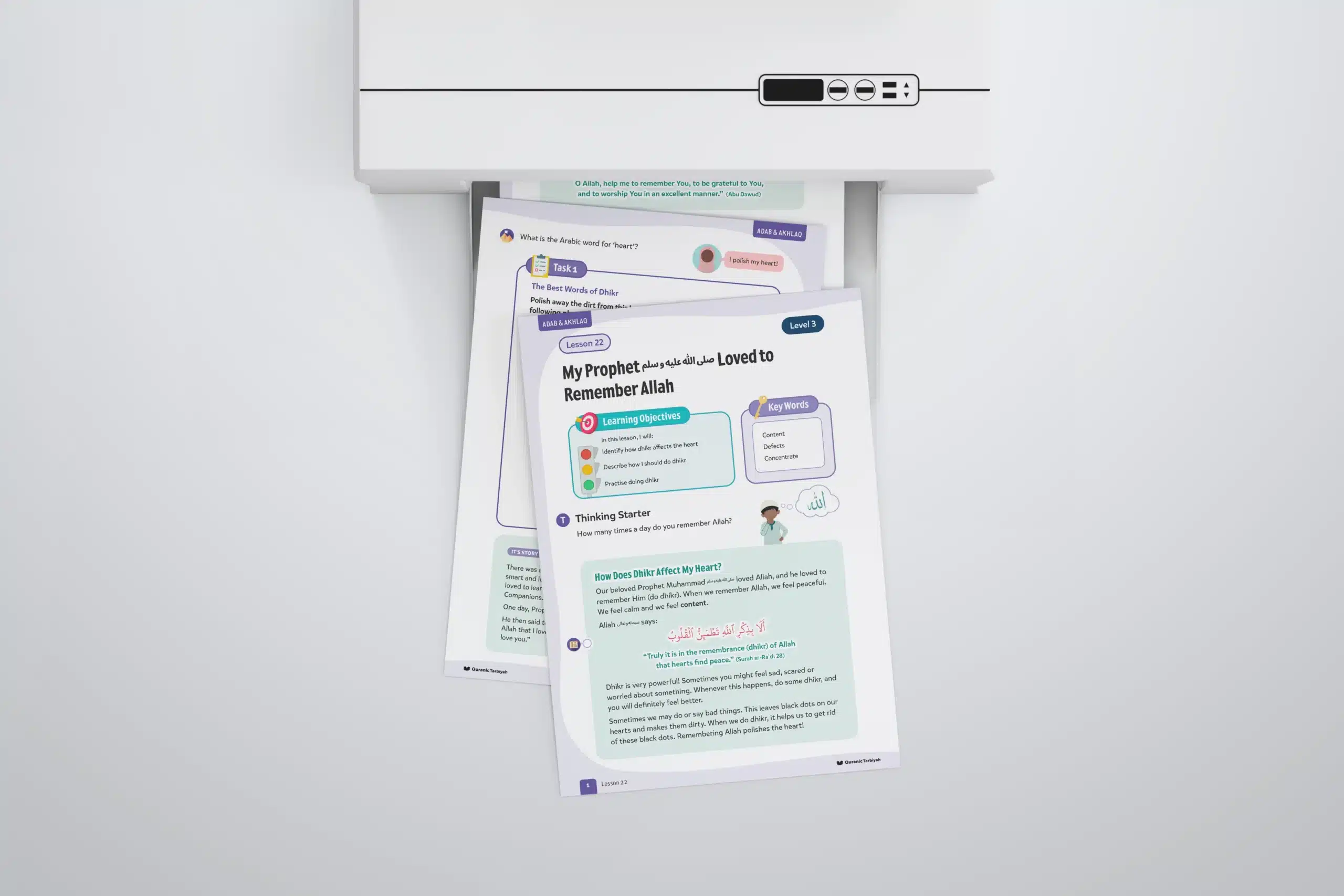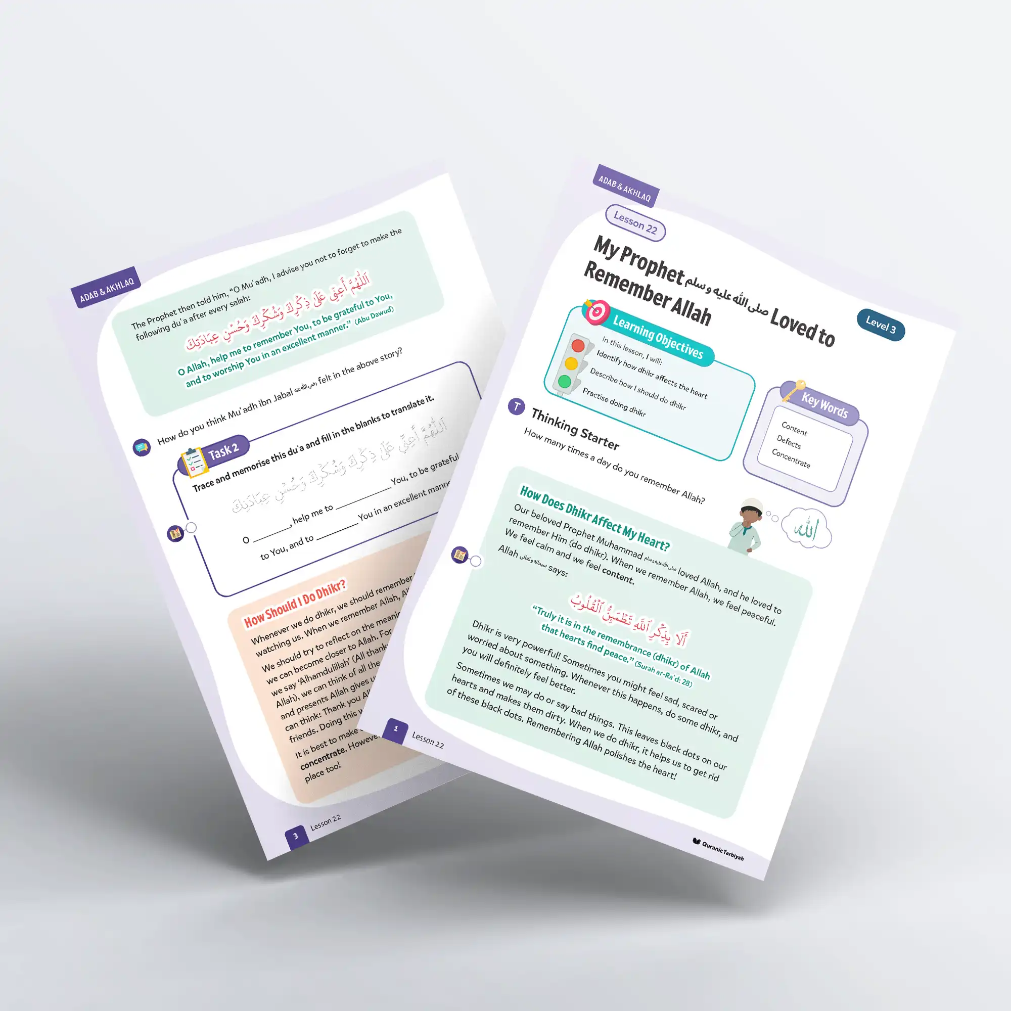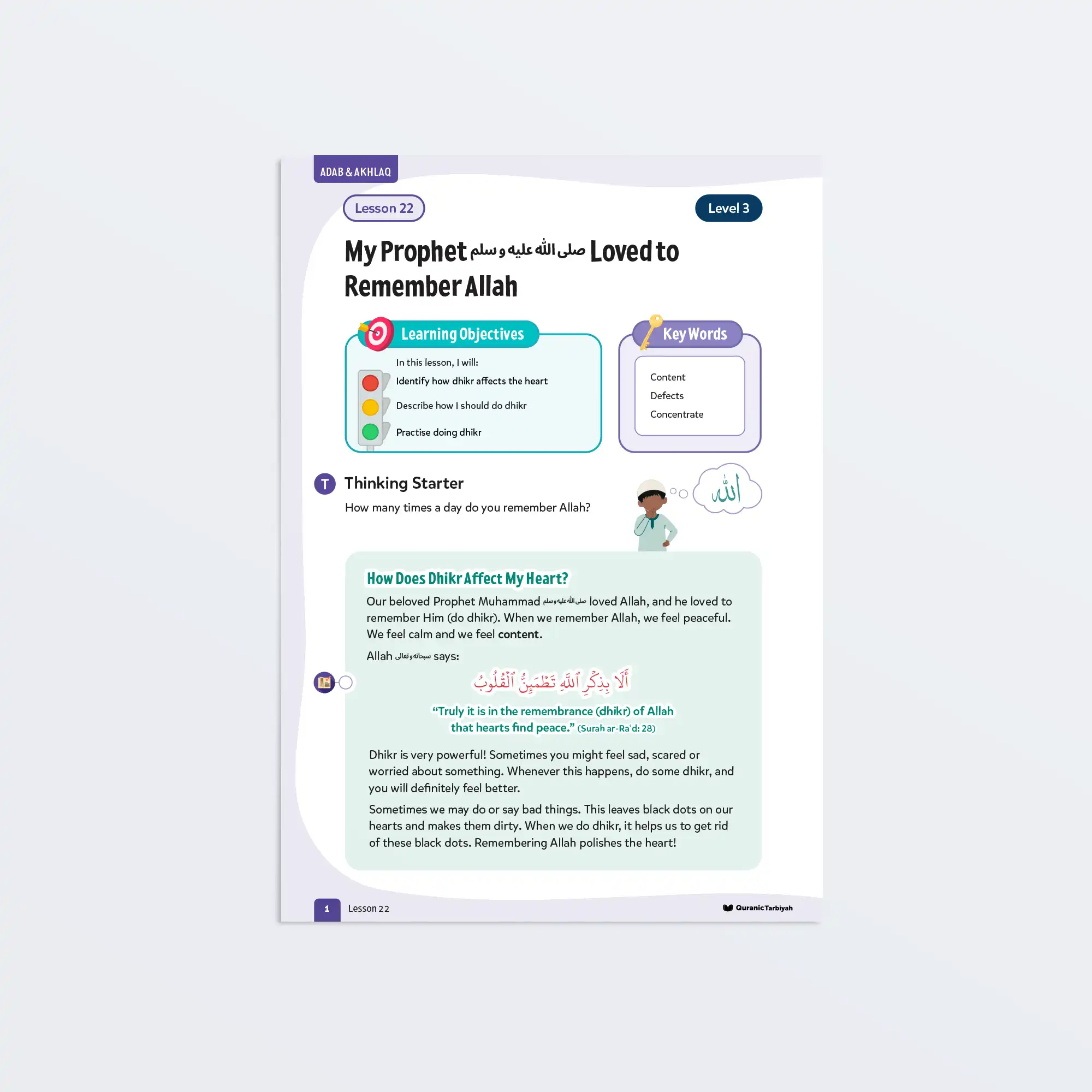 Through the touching story of Muʿadh ibn Jabal and interactive activities, learners discover that dhikr polishes the heart by removing the black dots left by bad deeds. The lesson includes a special duʿa to recite after every salah and practical guidance on how to do dhikr properly, helping children understand that when we remember Allah, He remembers us.