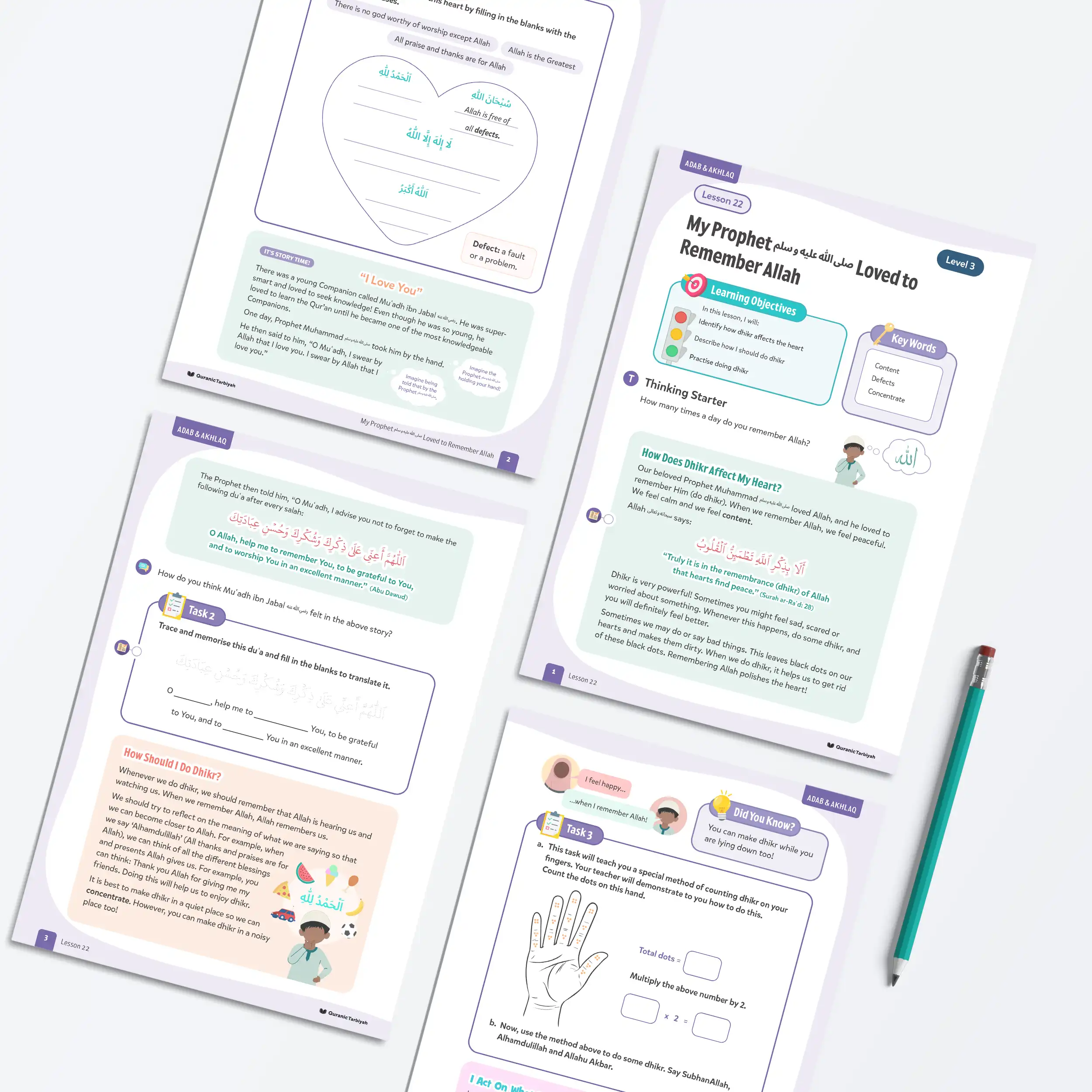 This thoughtfully designed lesson helps children understand that dhikr is very powerful and can help whenever they feel sad, scared, or worried. Through reflection and practical activities, learners discover how to remember Allah while reflecting on His blessings, making dhikr an enjoyable and meaningful practice that brings happiness and polishes their hearts.