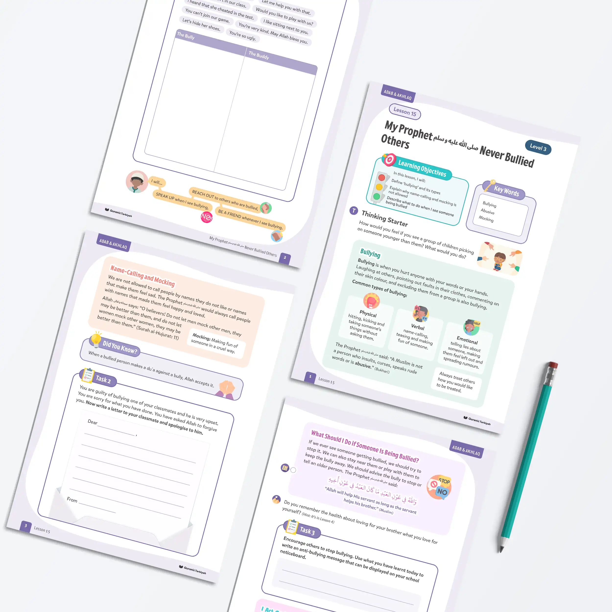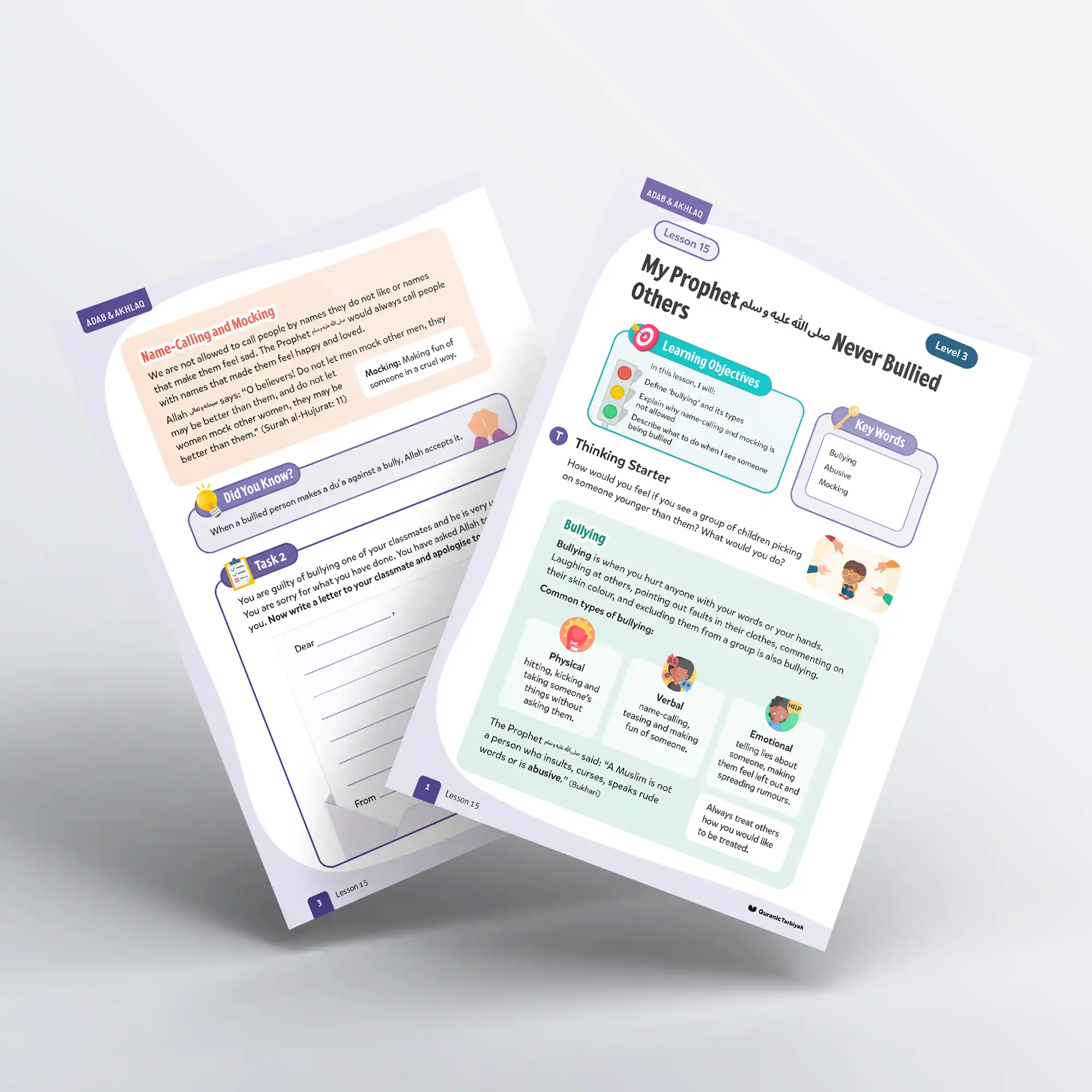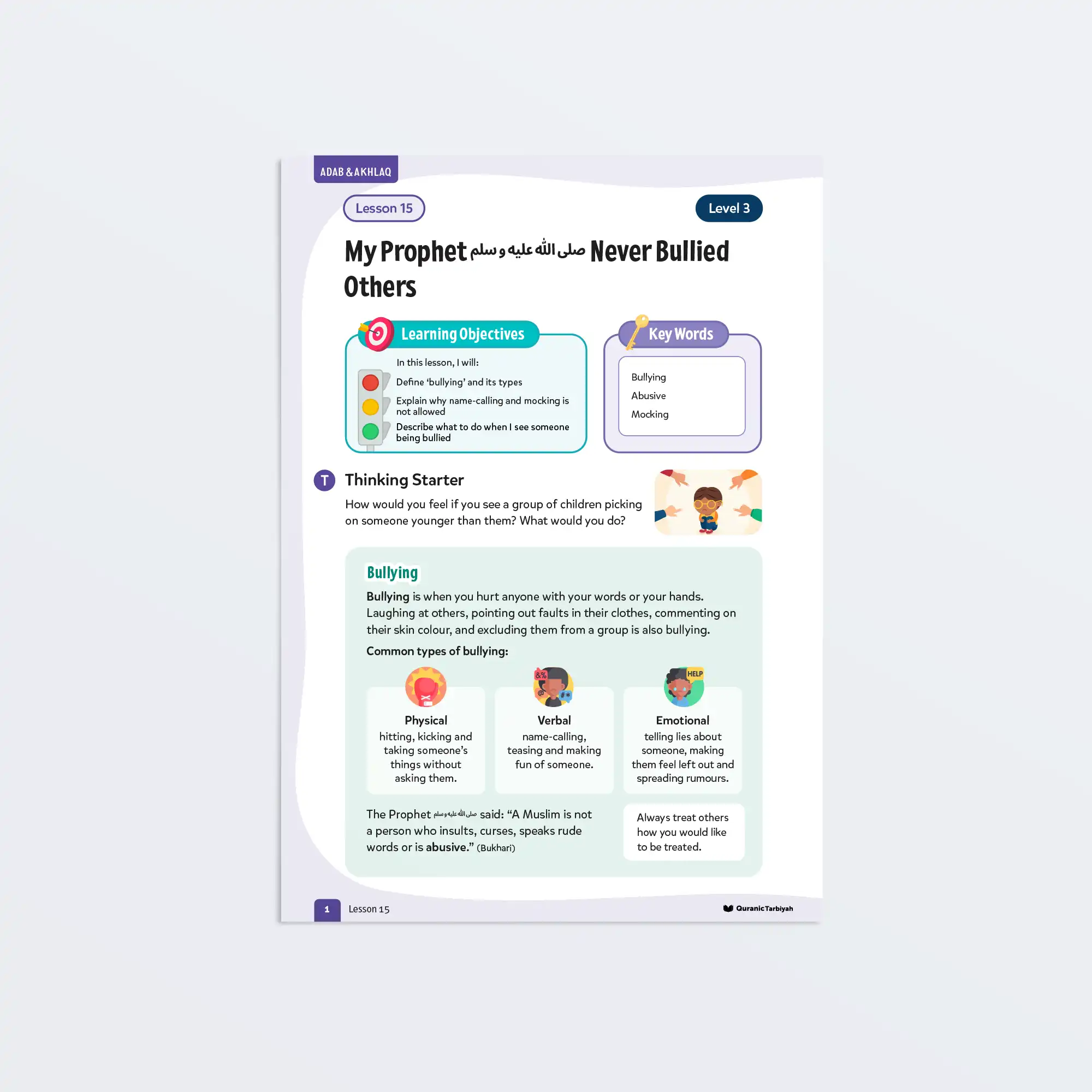 Help young learners understand the serious harm of bullying through the beautiful example of our beloved Prophet Muhammad ﷺ with this engaging lesson. They explore what bullying means and discover why the Prophet ﷺ always treated others with kindness, never insulting, cursing, or being abusive to anyone.