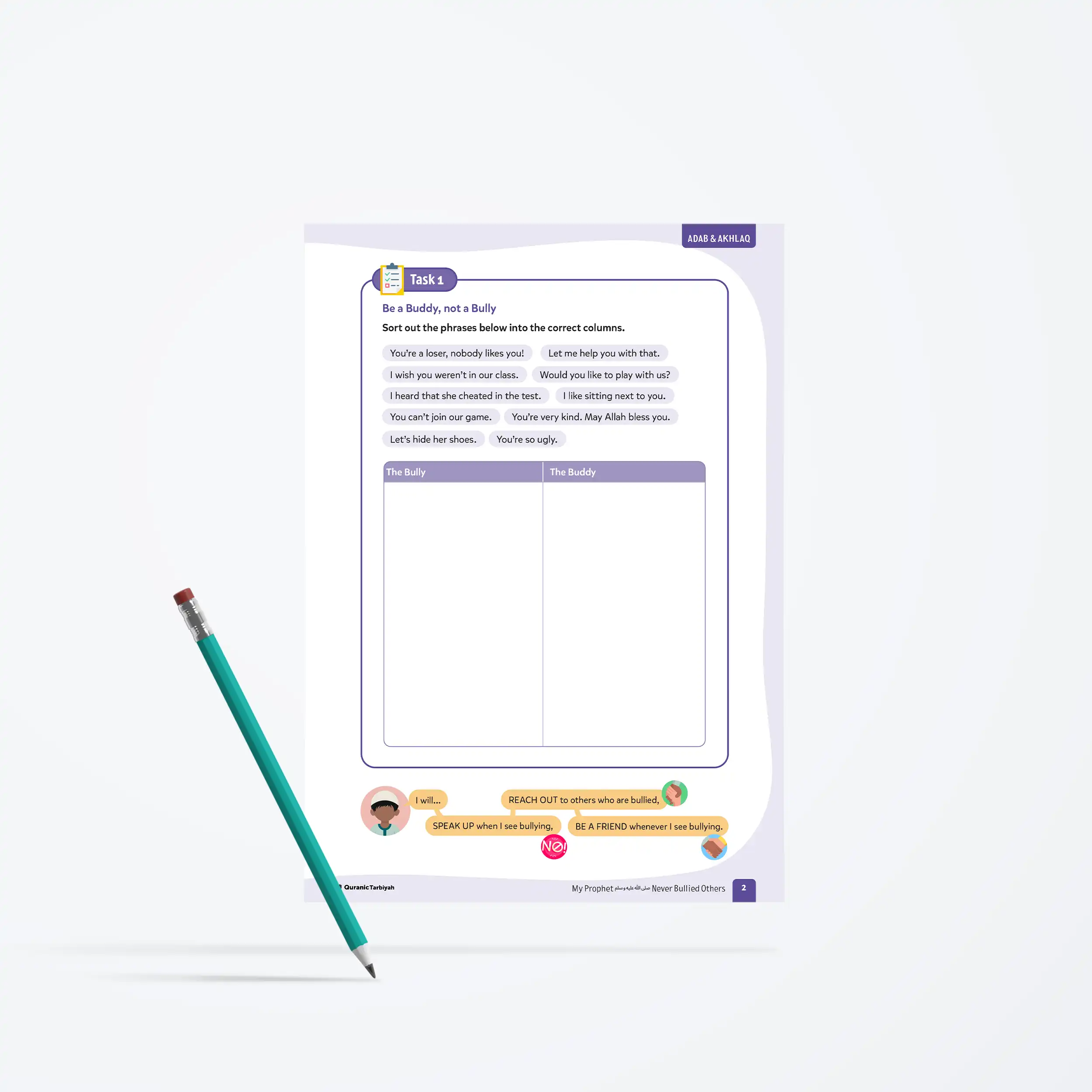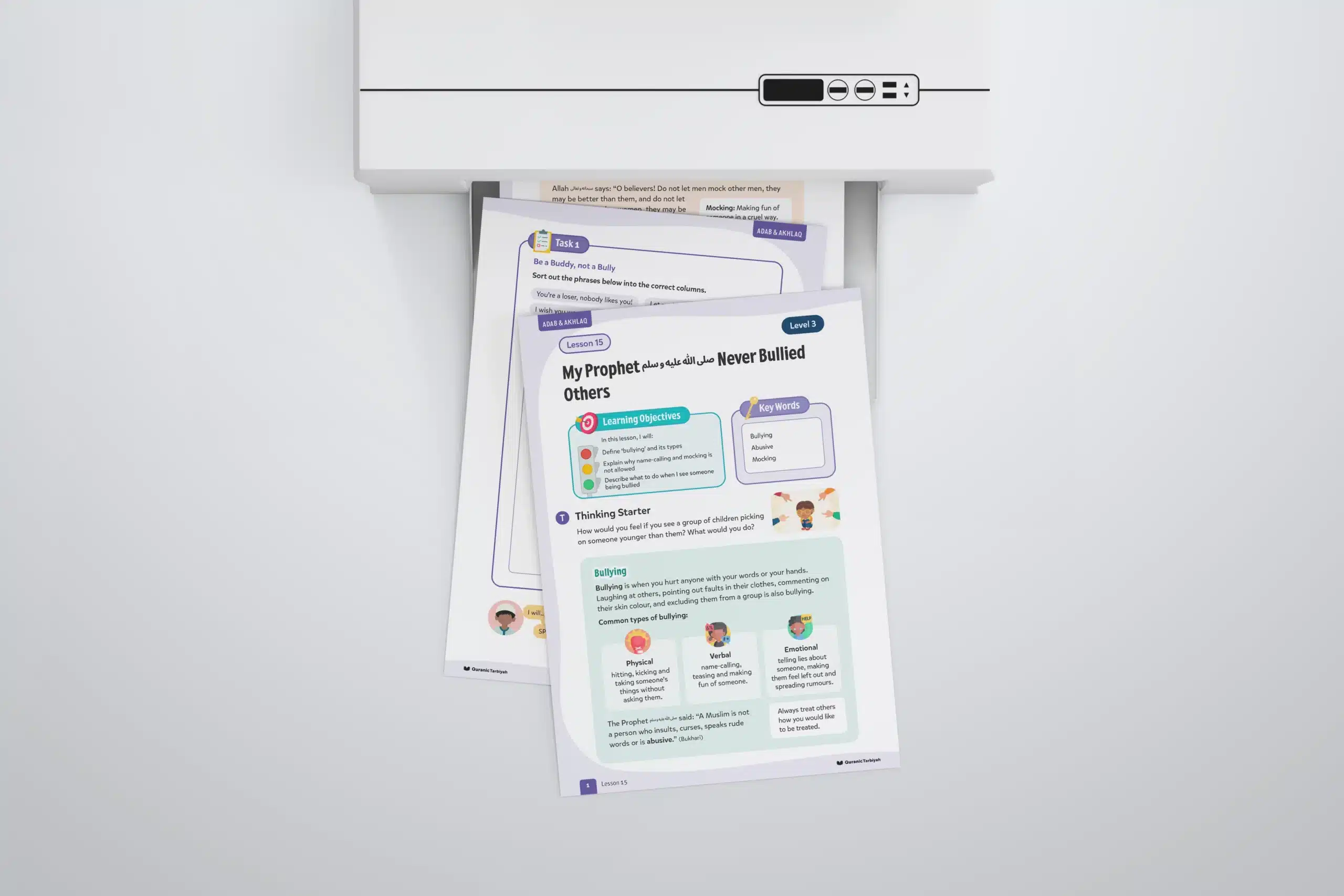 Through interactive activities and clear Qur’anic guidance, learners discover the three common types of bullying: physical, verbal, and emotional. The lesson includes practical guidance on how to respond when witnessing bullying, helping children understand that they should speak up, reach out, and be a friend to those being bullied.