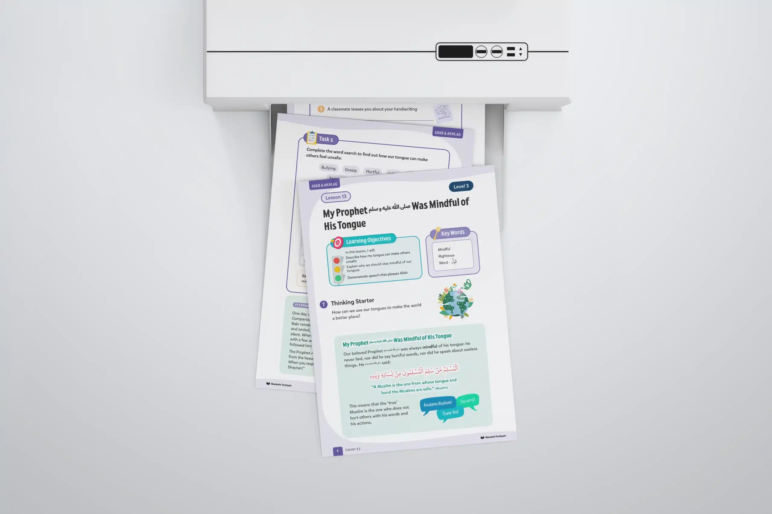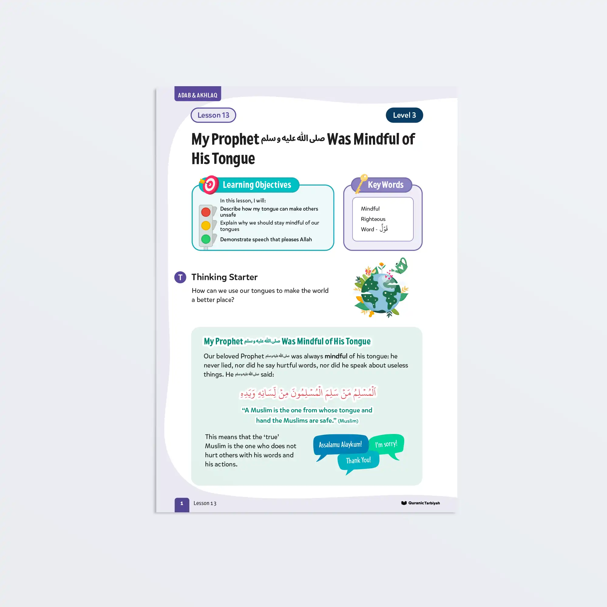 This lesson helps children understand that being mindful means thinking carefully before speaking and choosing words that bring goodness rather than harm. Through reflection and interactive scenarios, learners discover how to respond to rudeness with patience, use their tongues for dhikr, apologising, offering help, reading Qur’an, being thankful, encouraging others, sharing knowledge, complimenting, and speaking kindly.