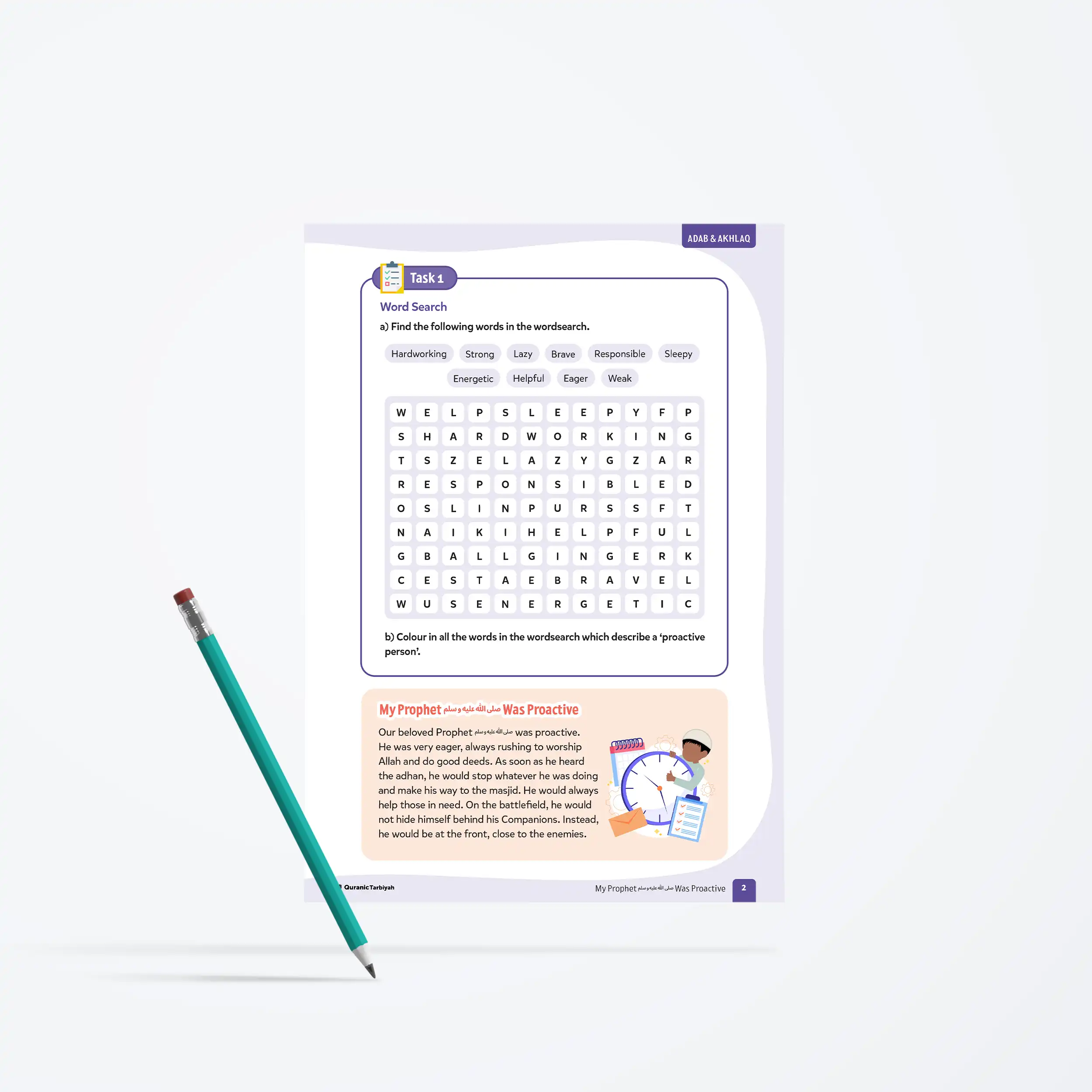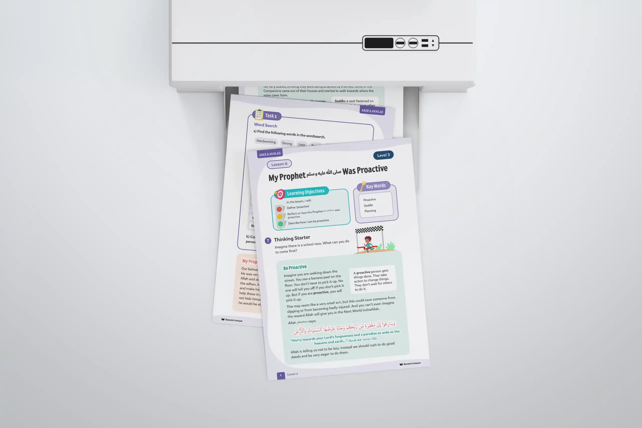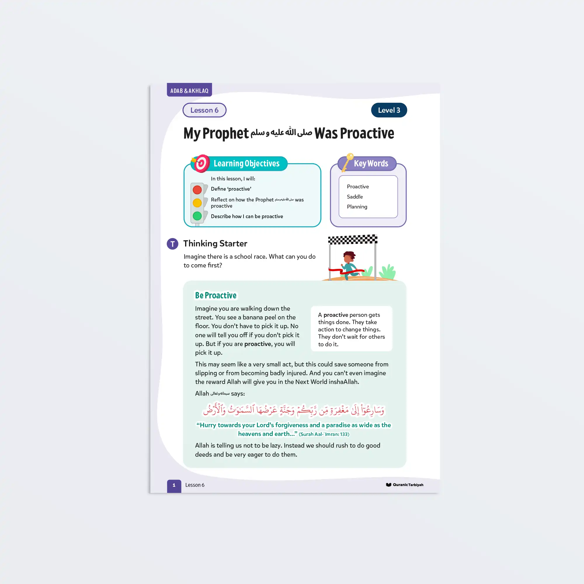 This lesson helps children understand that being proactive means being hardworking, brave, responsible, energetic, helpful and eager. Through reflection and real-world examples, learners discover how to rush towards good deeds, plan wisely, and take action to make Allah happy so they can run to Jannah.