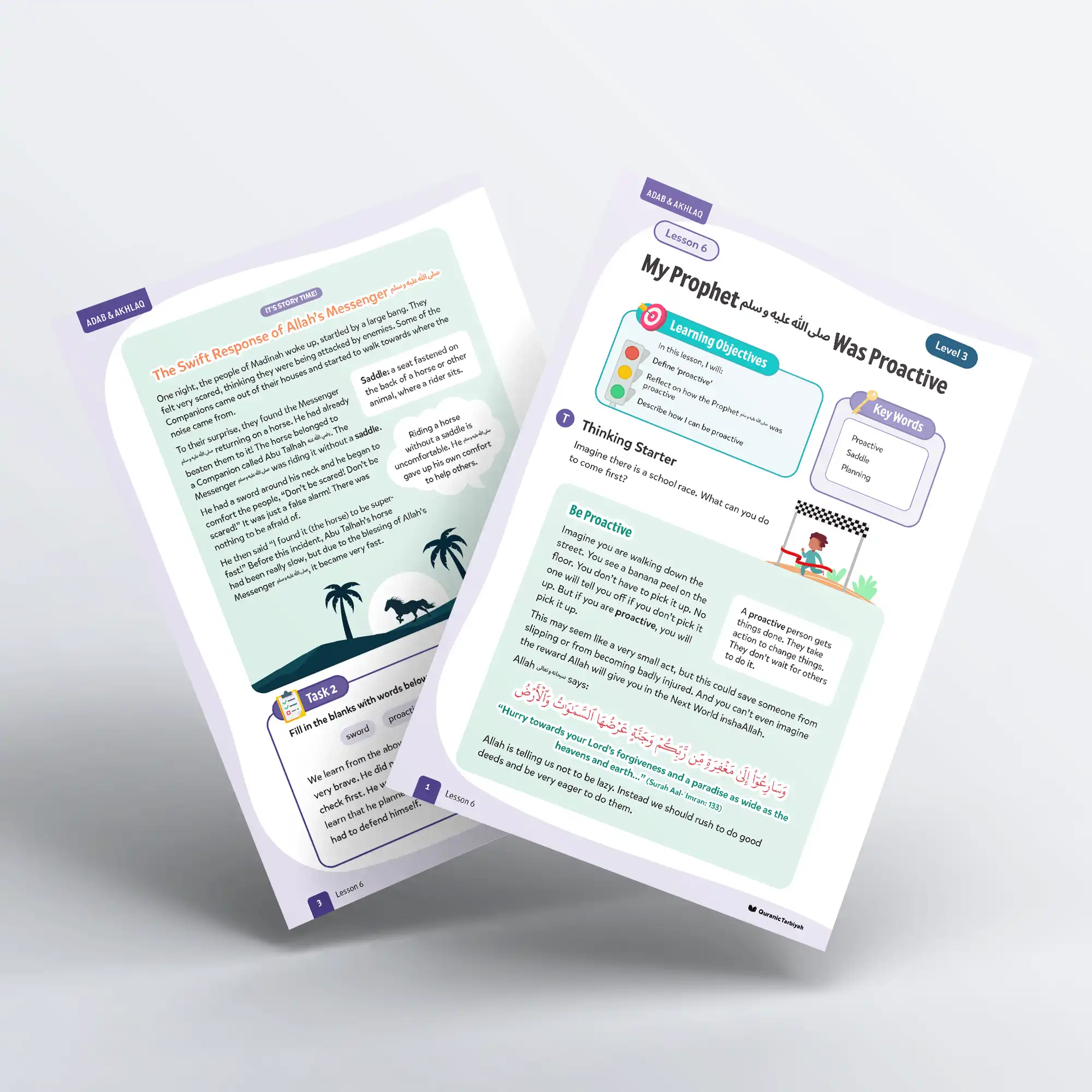 Through the thrilling story of the night alarm in Madinah and interactive activities, learners witness the Prophet’s extraordinary courage and quick response when the people thought they were under attack. The lesson helps children understand that being proactive means not waiting for others to act but taking responsibility and making things happen ourselves.