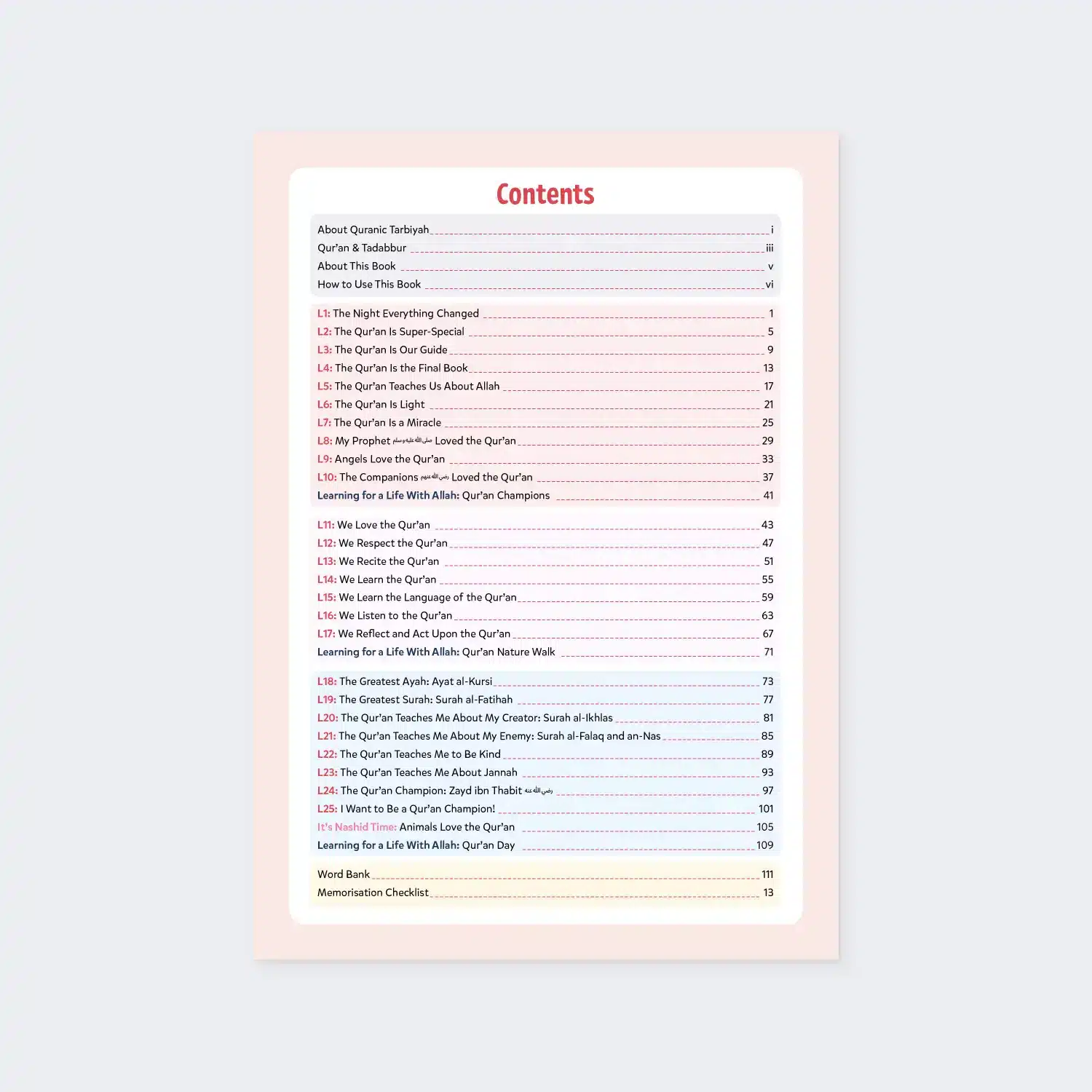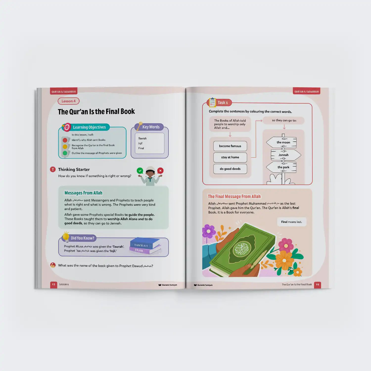 Practical lessons from each Surah, memorisation of key Quranic vocabulary, and stories to help young learners connect to the Qur’an
