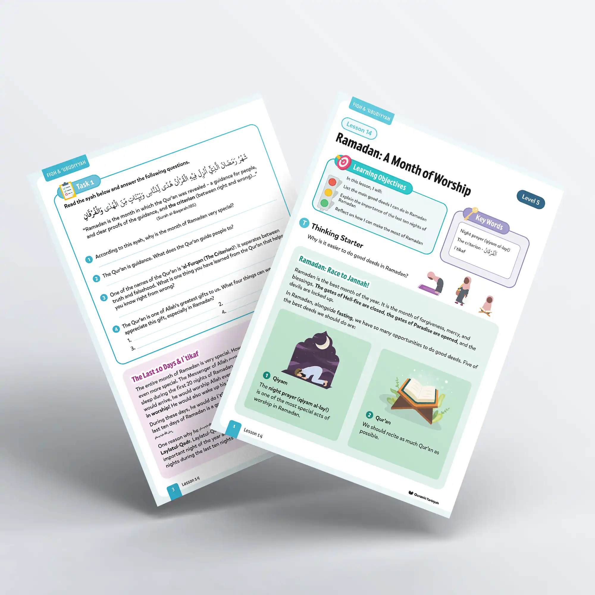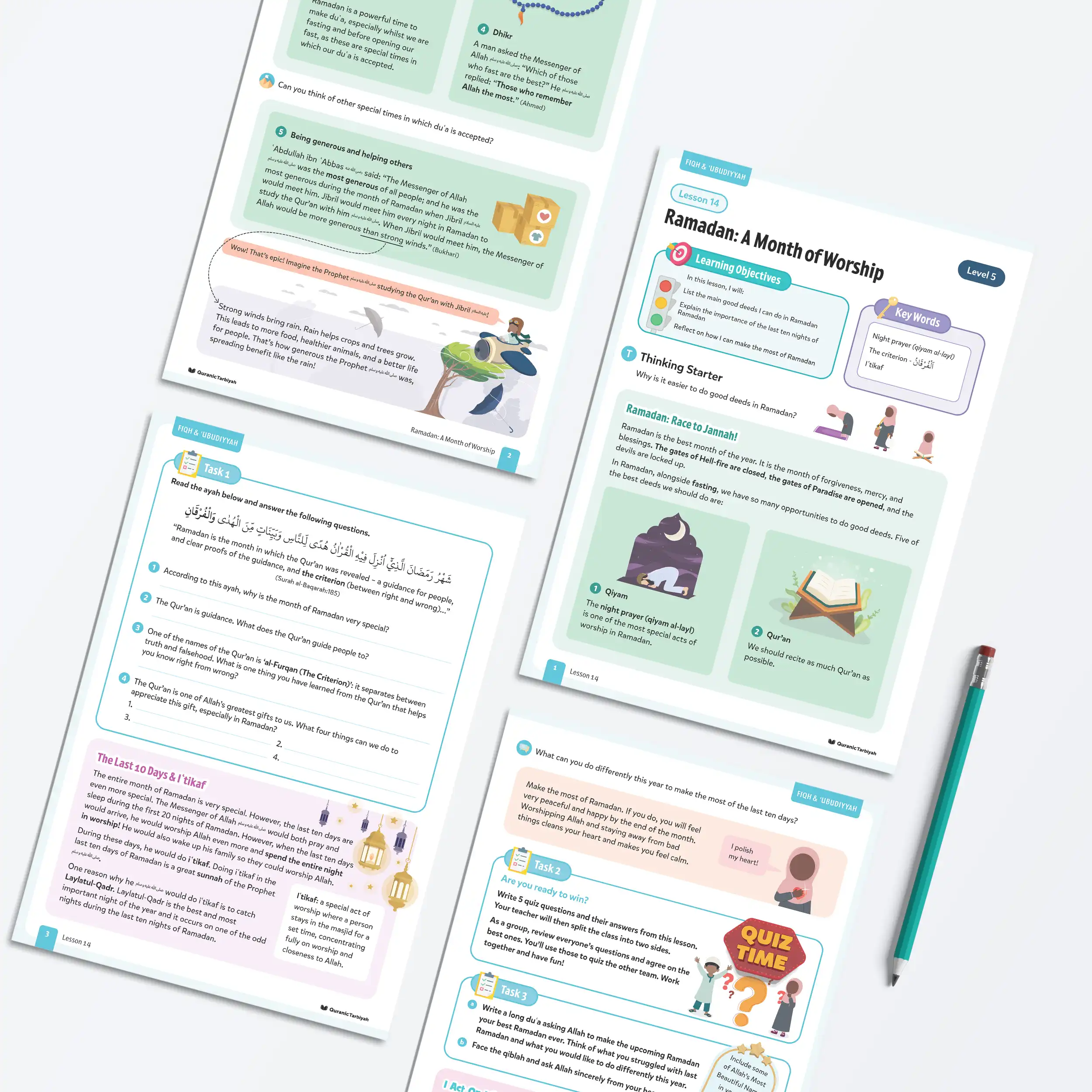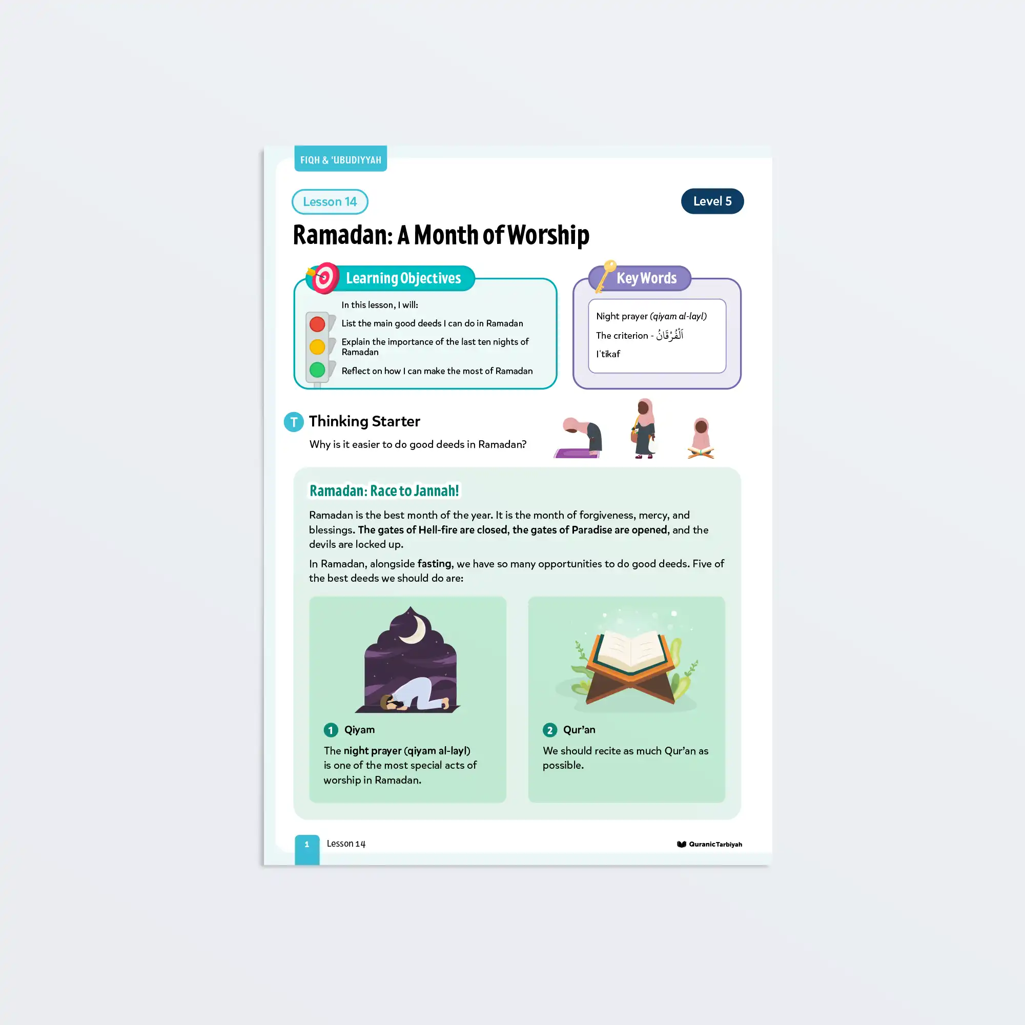 This lesson guides young Muslims to make the most of Ramadan by discovering the main good deeds to focus on, understanding the special significance of the last ten nights, and learning how our beloved Prophet ﷺ maximized this blessed month. Through Qur’anic reflection and practical planning, learners prepare to race towards Jannah through meaningful worship.