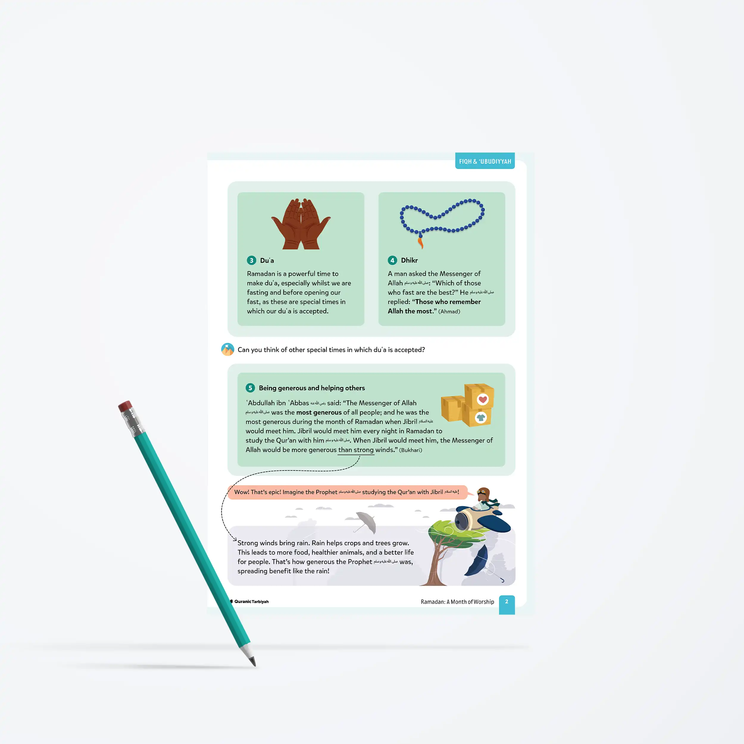 Through beautiful Hadith, learners discover how our beloved Prophet ﷺ was the most generous of all people, especially during Ramadan when Angel Jibril would meet him every night to study the Qur’an together. Young learners learn that the Prophet’s ﷺ generosity was like strong winds bringing rain, spreading benefit and goodness to everyone.