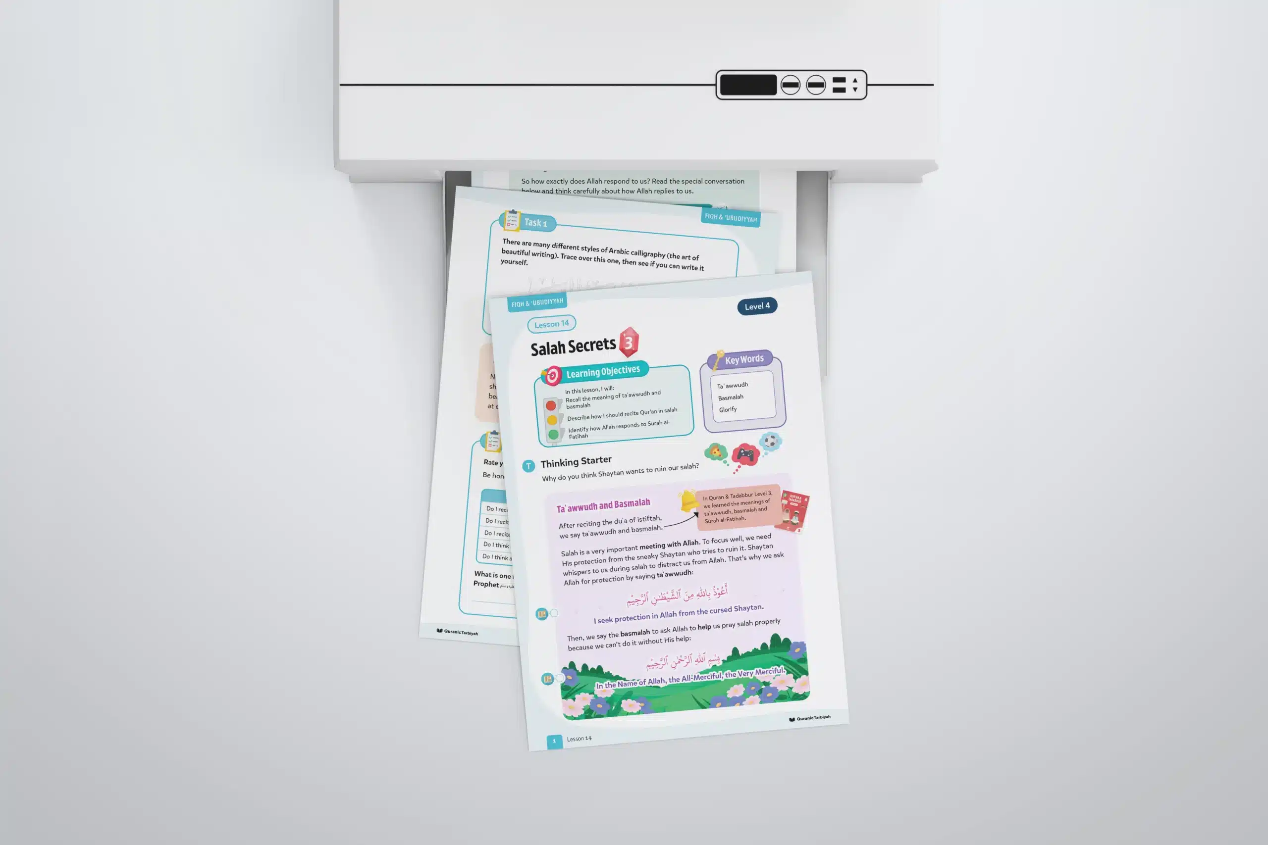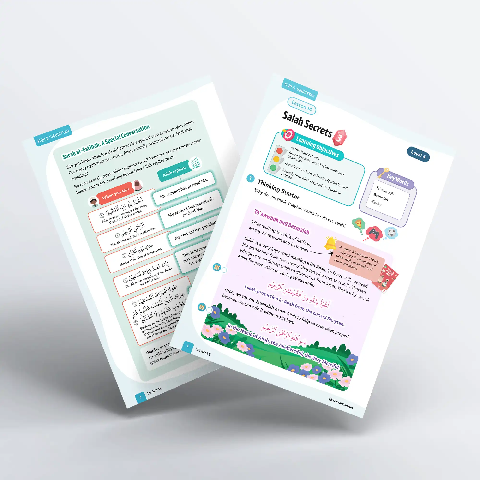 This thoughtfully designed lesson helps young learners understand why Shaytan wants to ruin our salah and how seeking Allah’s protection keeps us focused. Through reflection and partner practice, learners discover the profound reality that Surah al-Fatihah is not just recitation but an actual conversation with Allah, where He responds to each ayah and promises to grant what we ask for.