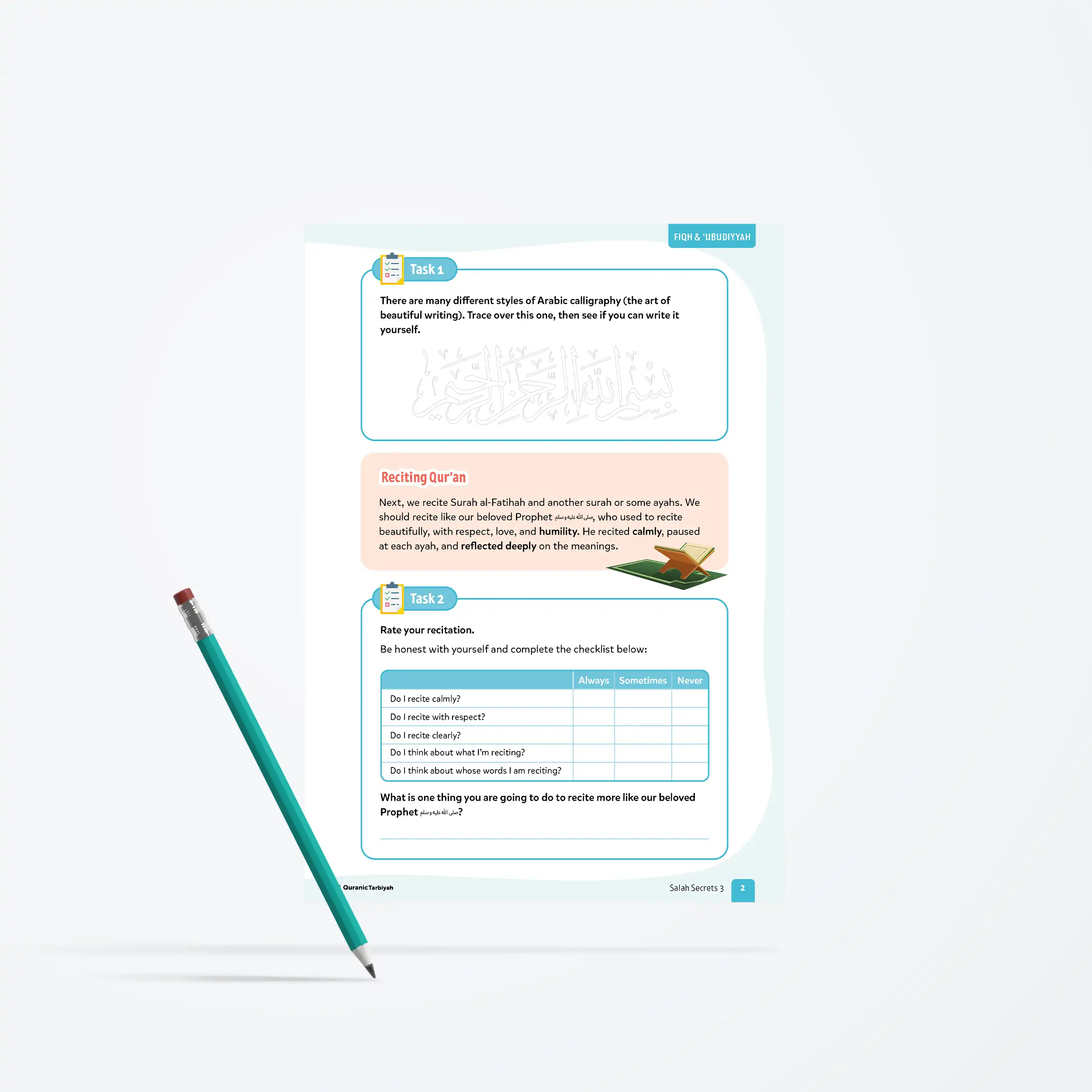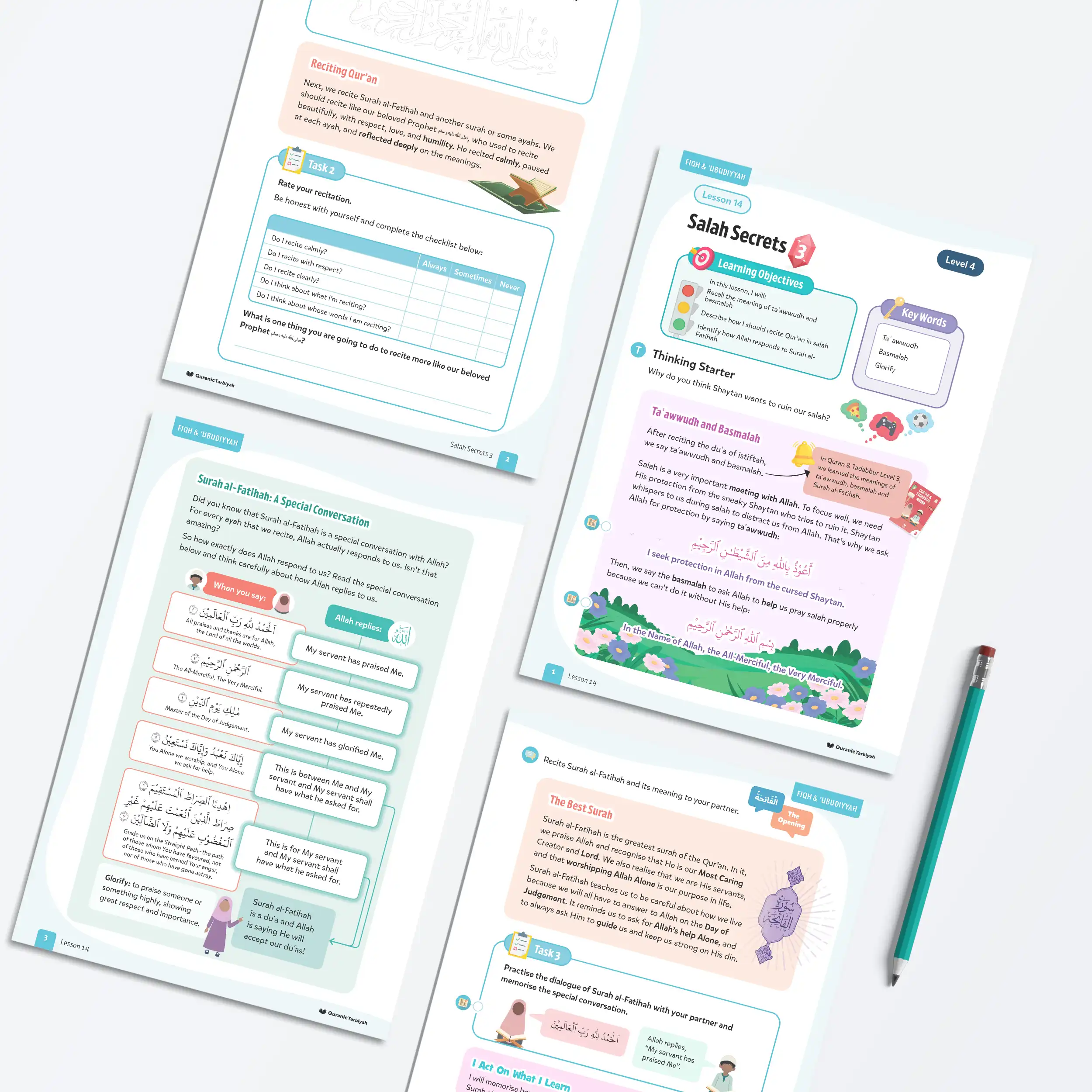 Through the amazing revelation of how Allah responds to each ayah of Surah al-Fatihah and interactive activities, learners discover that this greatest surah is a special conversation where Allah actually replies to us. The lesson includes beautiful Arabic calligraphy practice and practical guidance on reciting Qur’an with respect, love, and humility, just as the Prophet ﷺ did.
