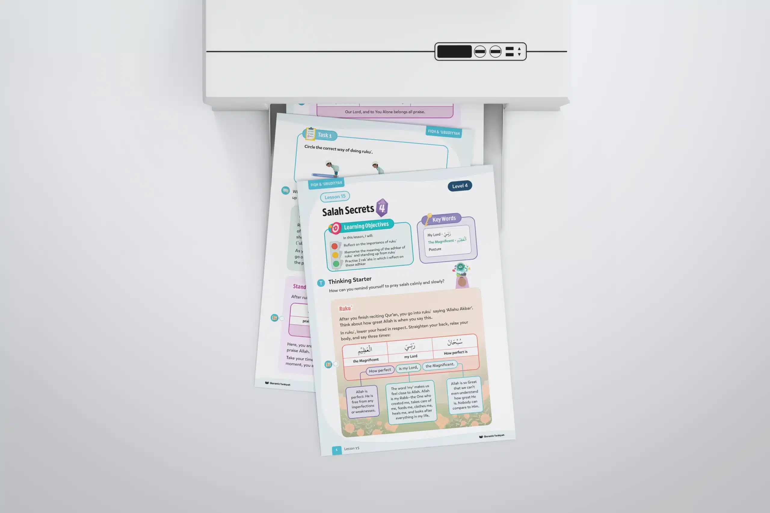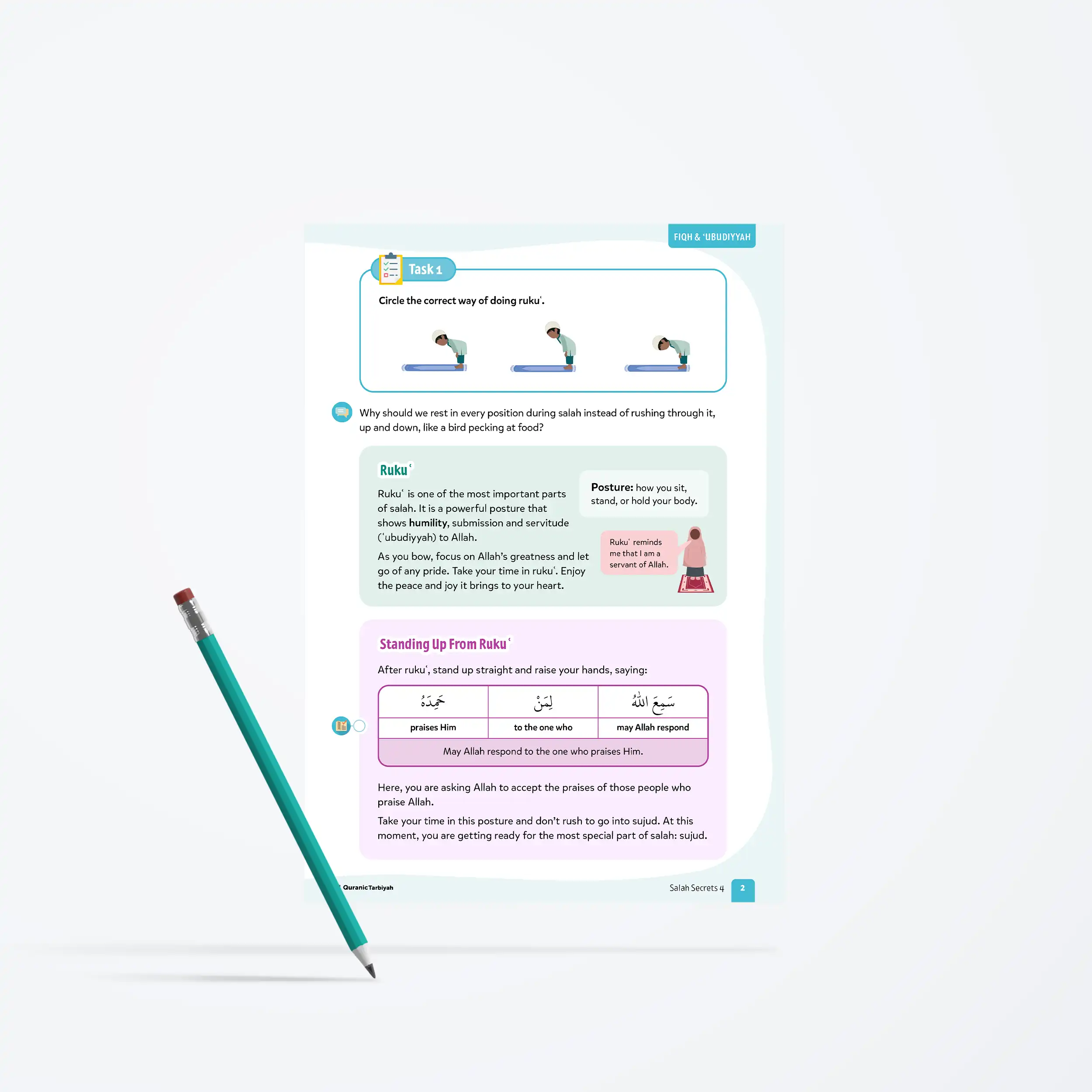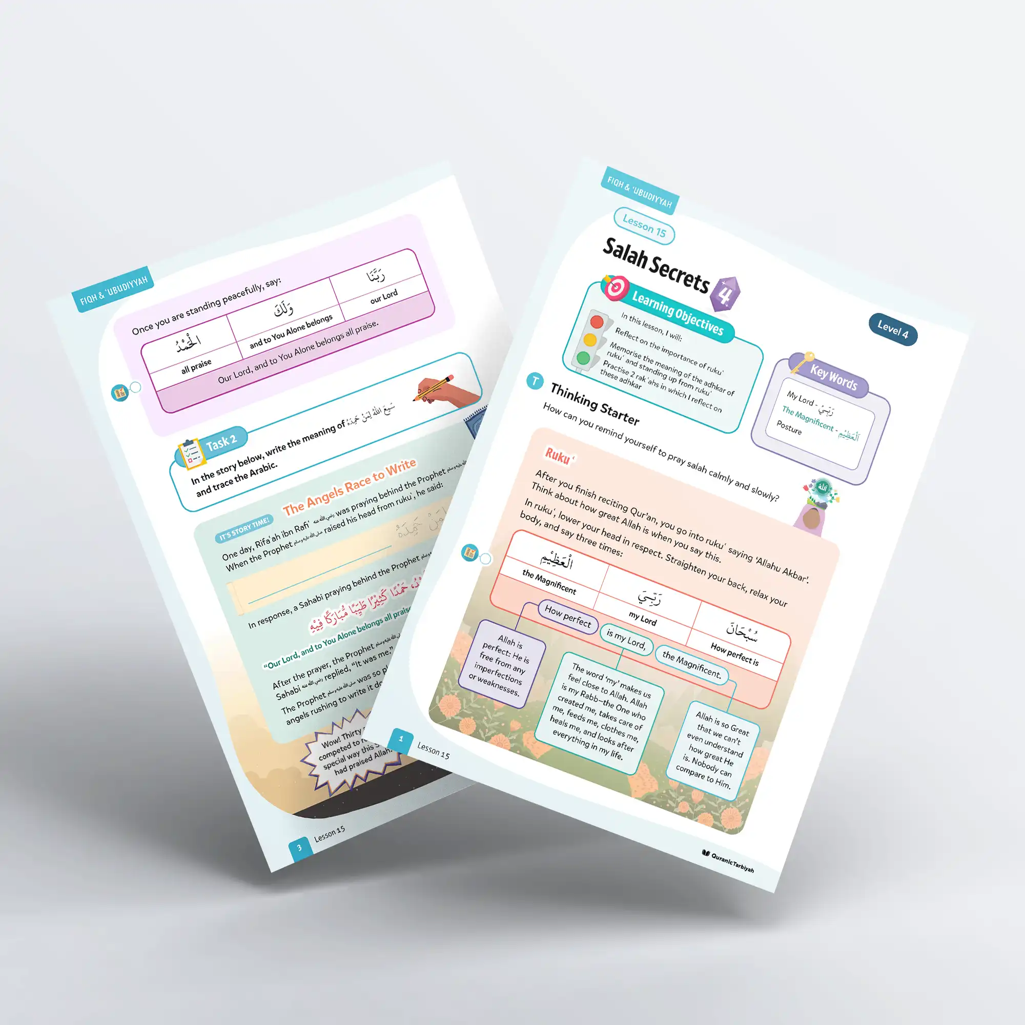 This thoughtfully designed lesson helps children understand that rukuʿ is not just a physical movement but a powerful expression of servitude to Allah. Through reflection and practical prayer, learners discover how to pray calmly and slowly, thinking about Allah’s greatness, feeling close to their Rabb, and experiencing the peace that comes from true humility before the Magnificent Lord.