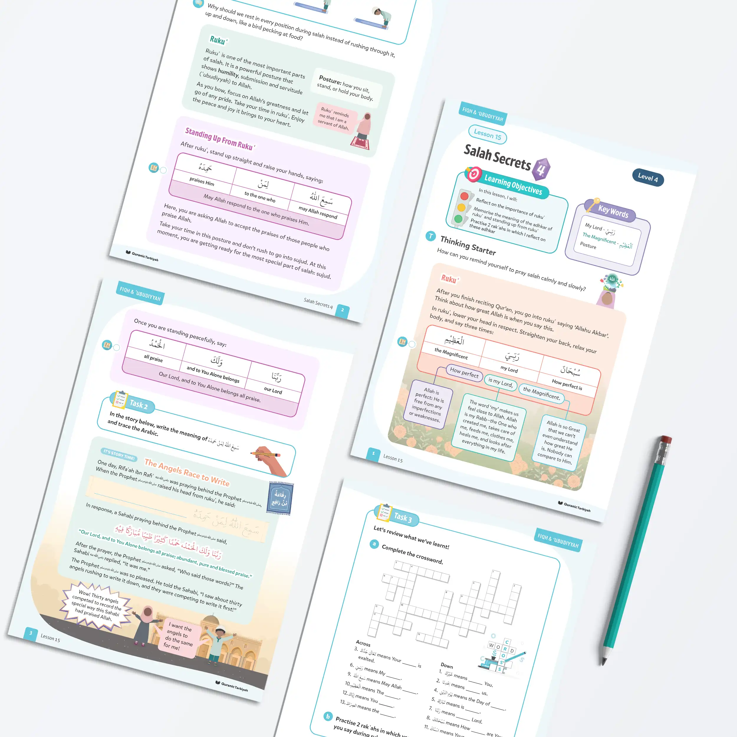 Through the inspiring story of Rifaʿah ibn Rafiʿ and interactive activities, learners discover that thirty angels raced to record a Sahabi’s beautiful praise of Allah after rukuʿ. The lesson includes practical guidance on proper rukuʿ posture and taking time in each position, helping children understand that rukuʿ is a powerful posture showing humility, submission, and servitude (ʿubudiyyah) to Allah.