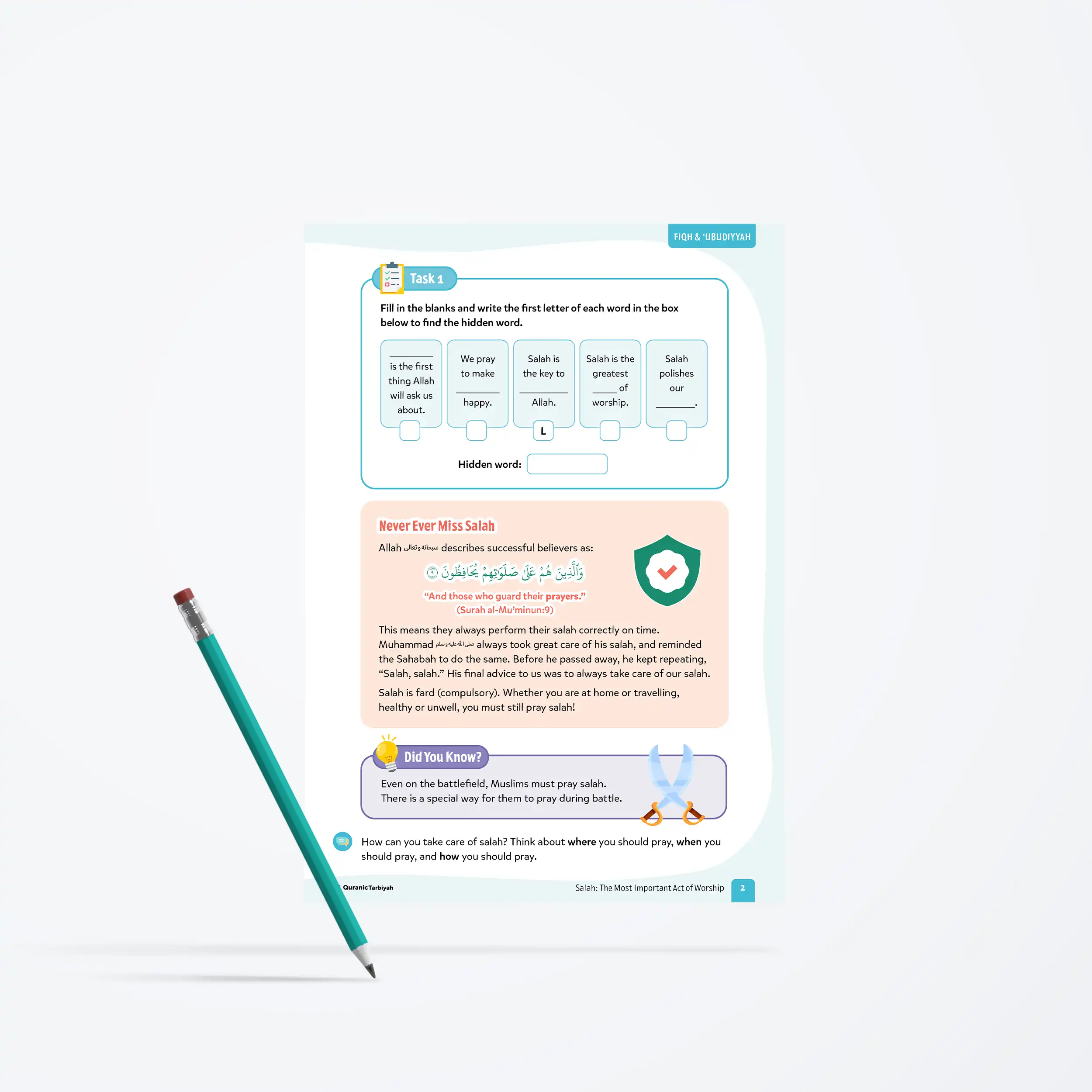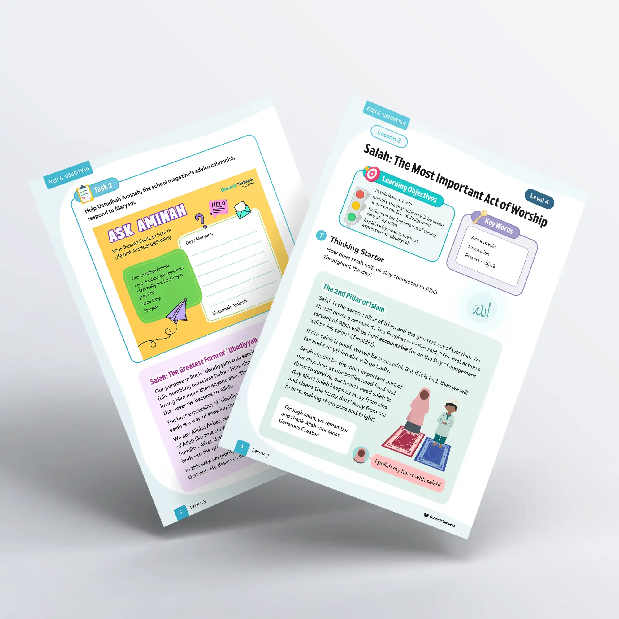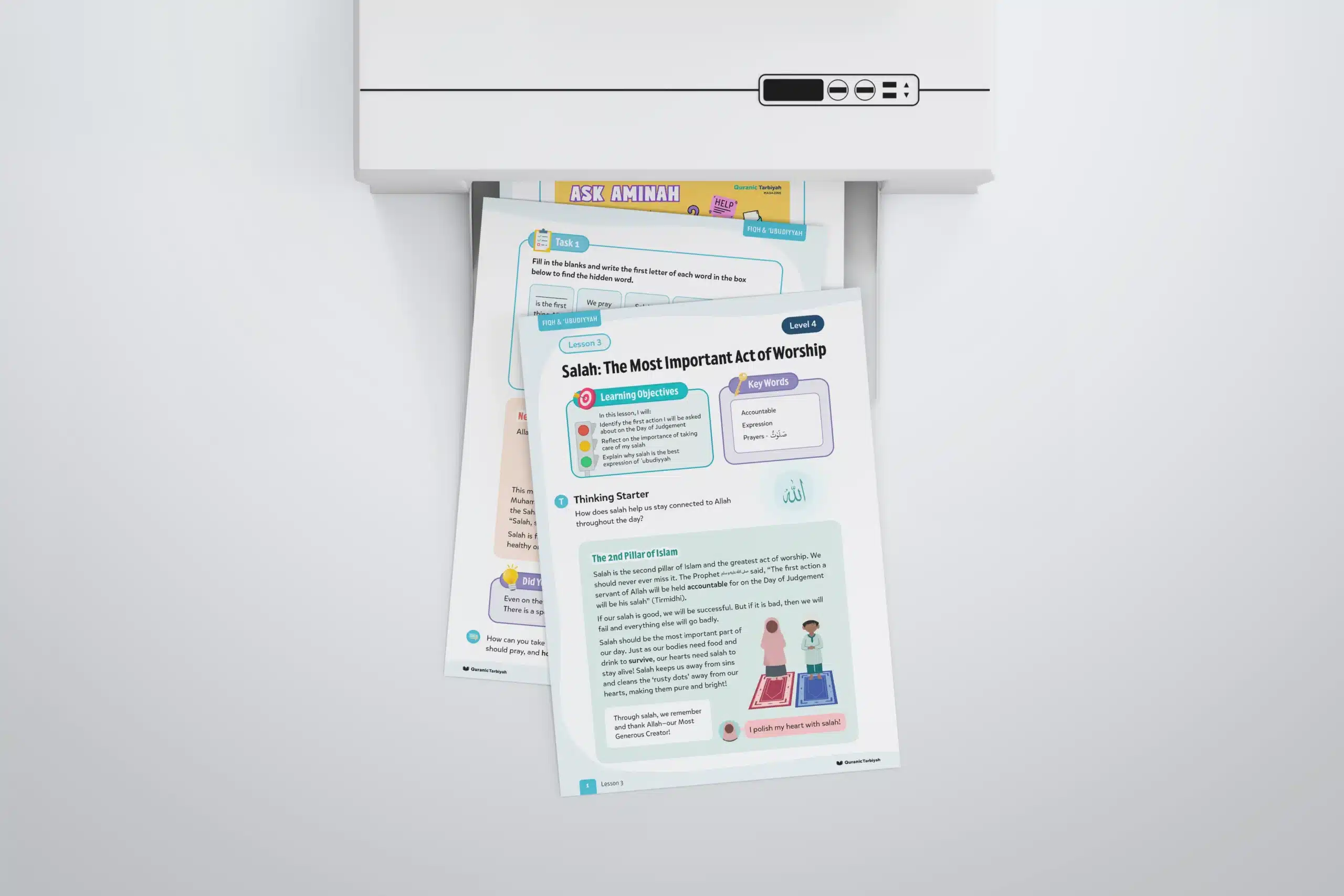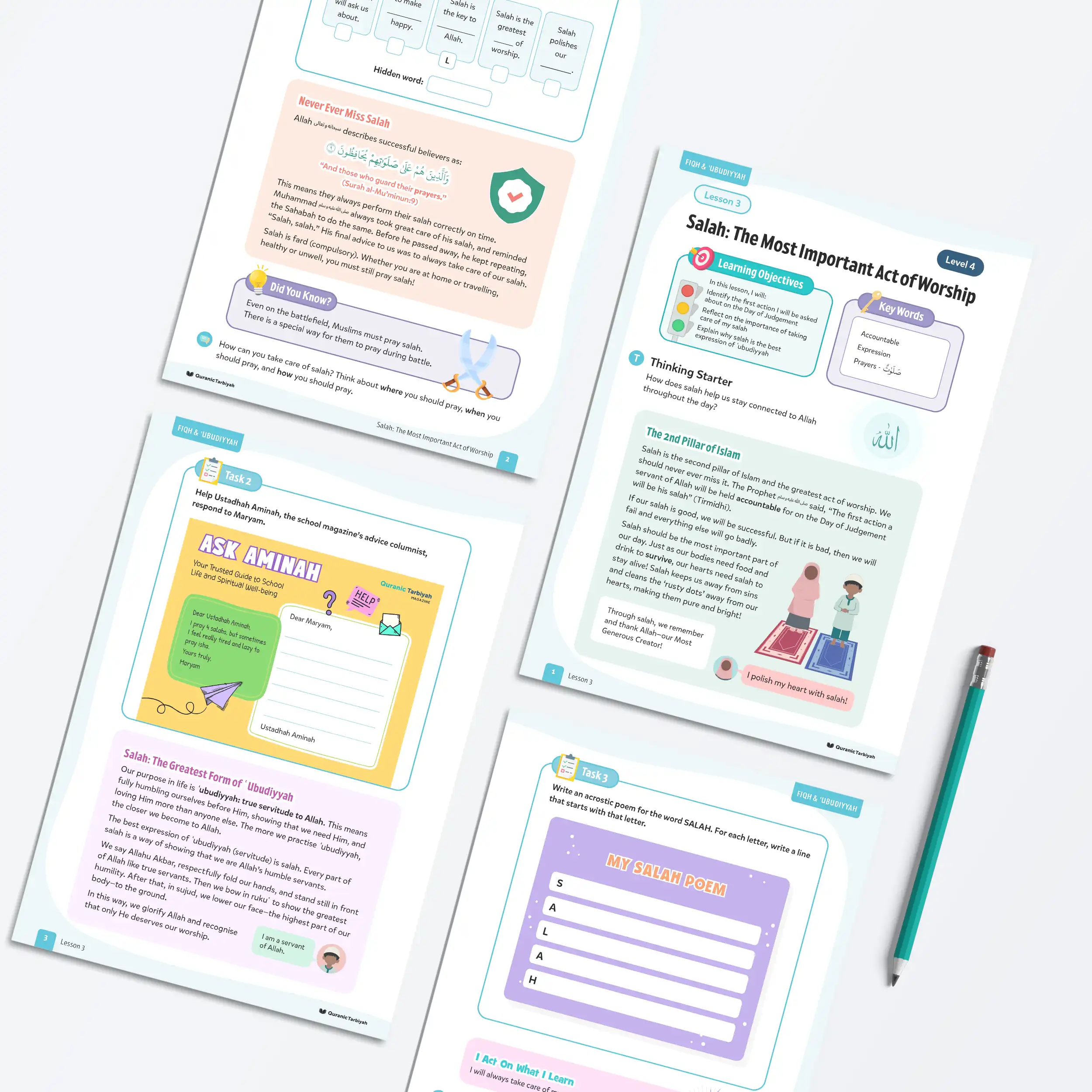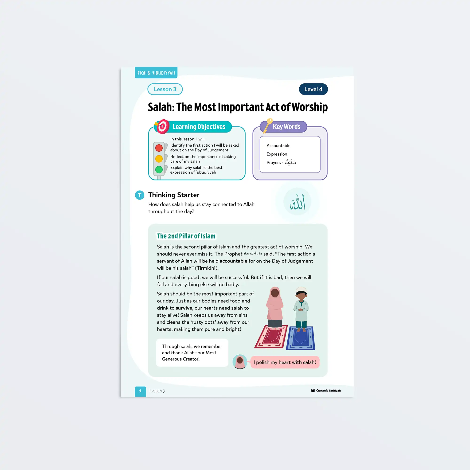 This thoughtfully designed lesson helps learners understand that salah should be the most important part of their day, as it keeps them connected to Allah throughout daily life. Through reflection and creative activities, learners discover that salah is not just about physical movements but about fully humbling ourselves before Allah, showing that we need Him, and loving Him more than anyone else.