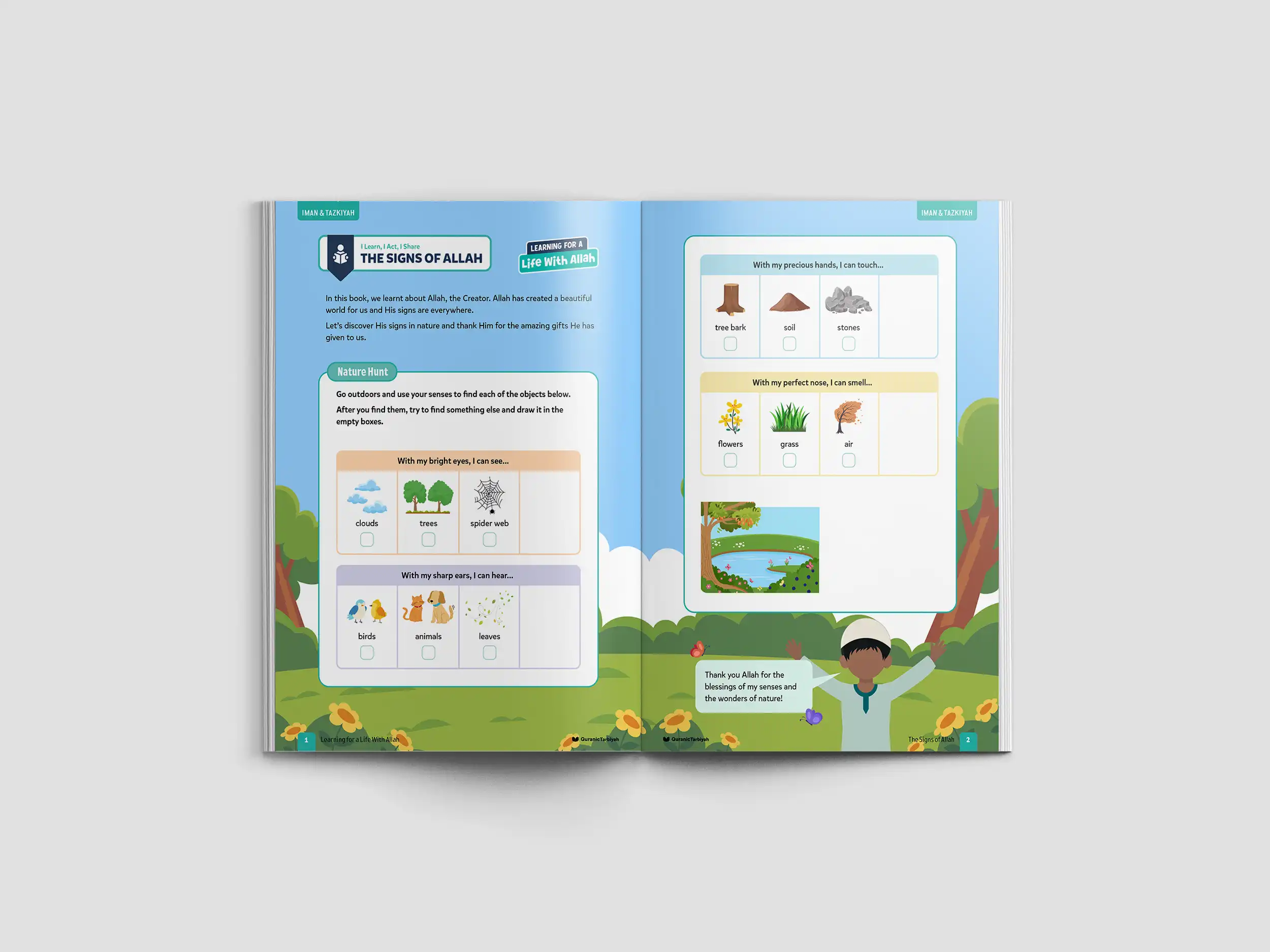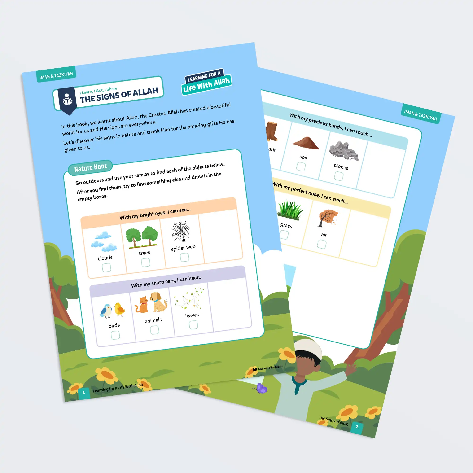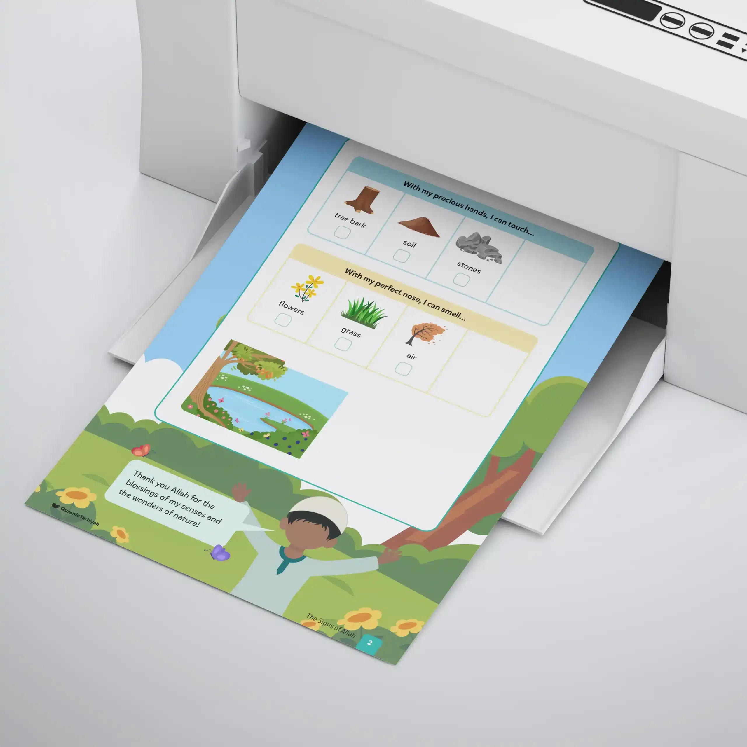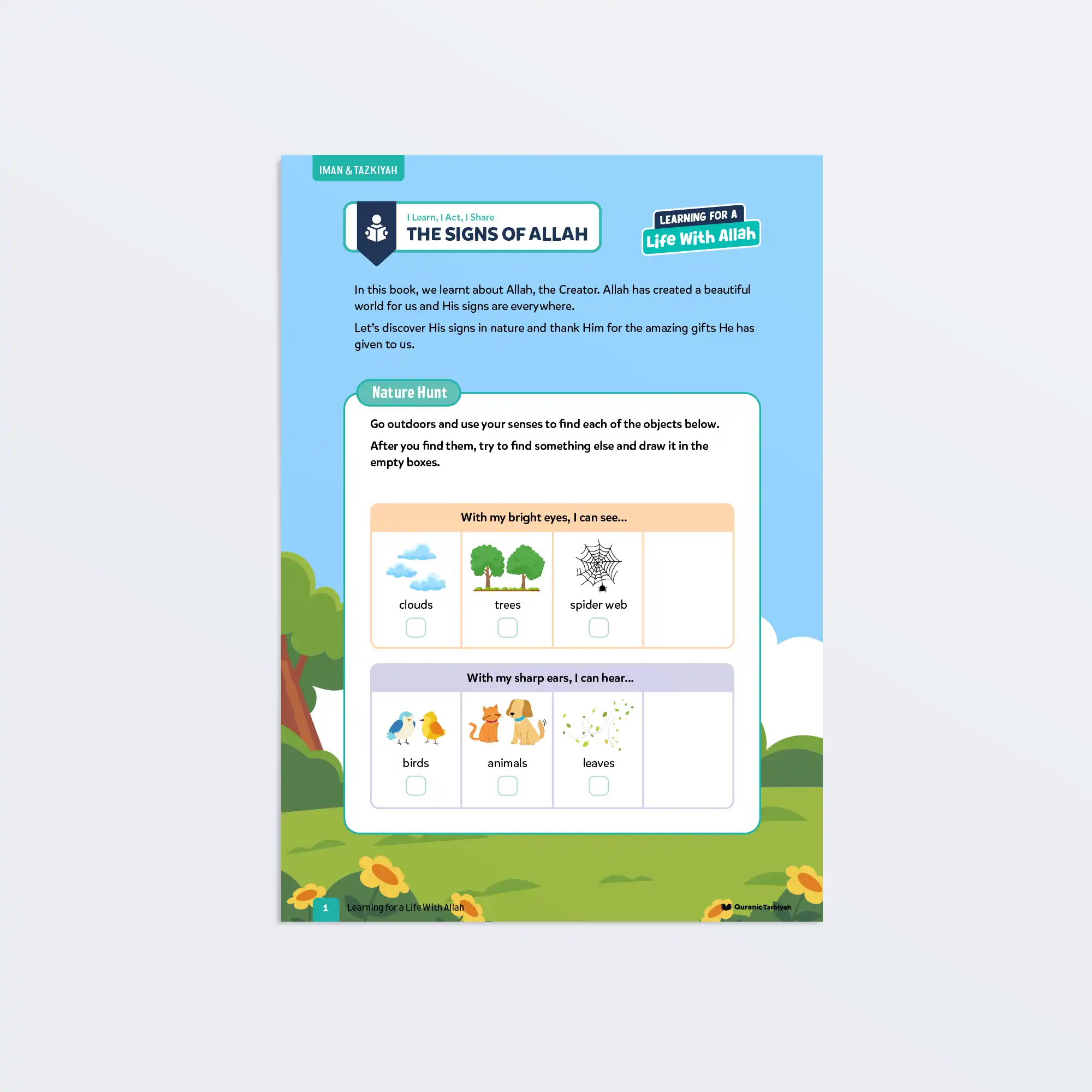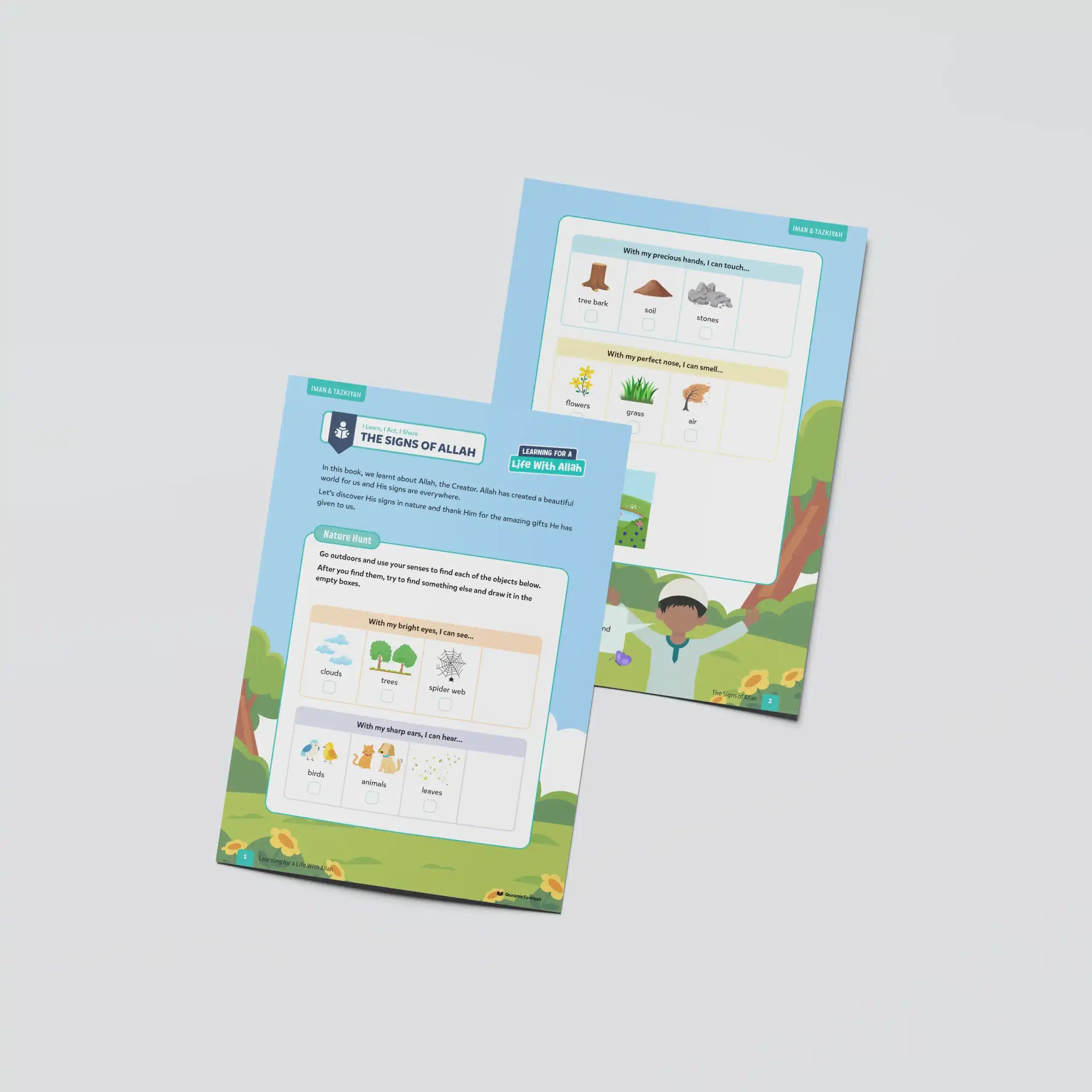 Help young learners aged 6+ discover the signs of Allah in nature through this engaging Level 2 activity. They explore outdoors using their senses to find clouds, birds, leaves, flowers, and more, learning to recognise Allah’s creation with gratitude and wonder. The gentle exploration nurtures love for the Creator and thankfulness for His blessings.