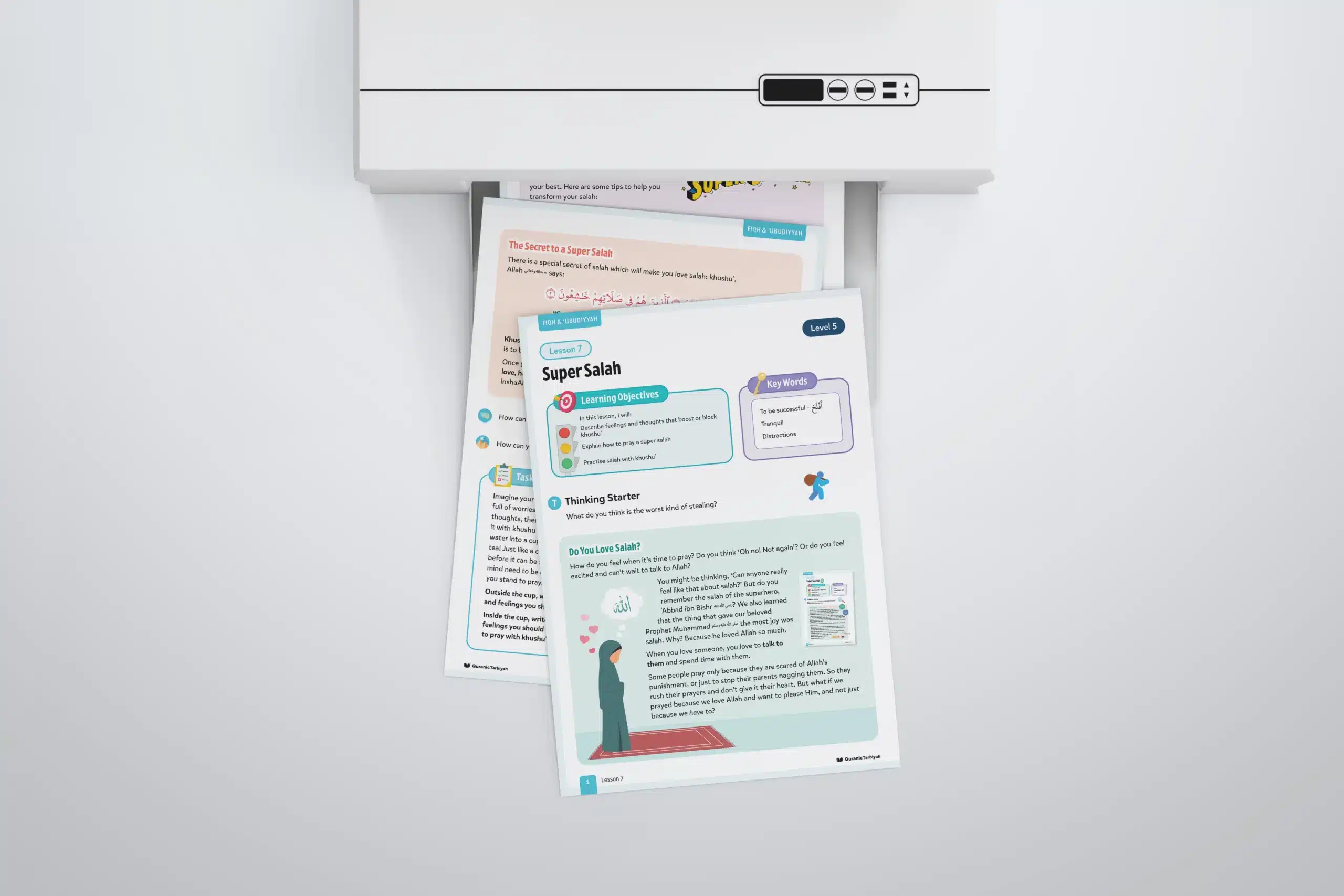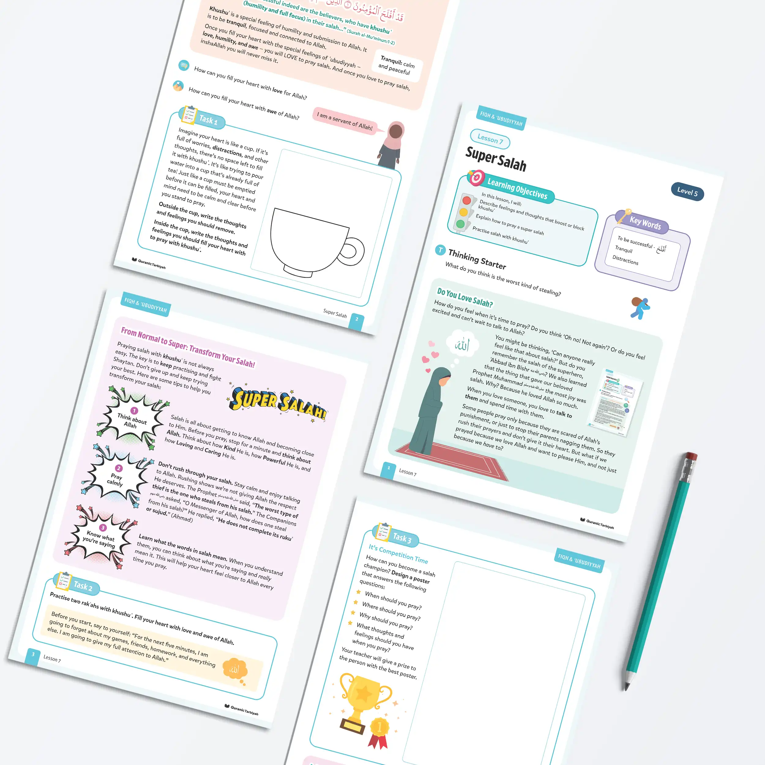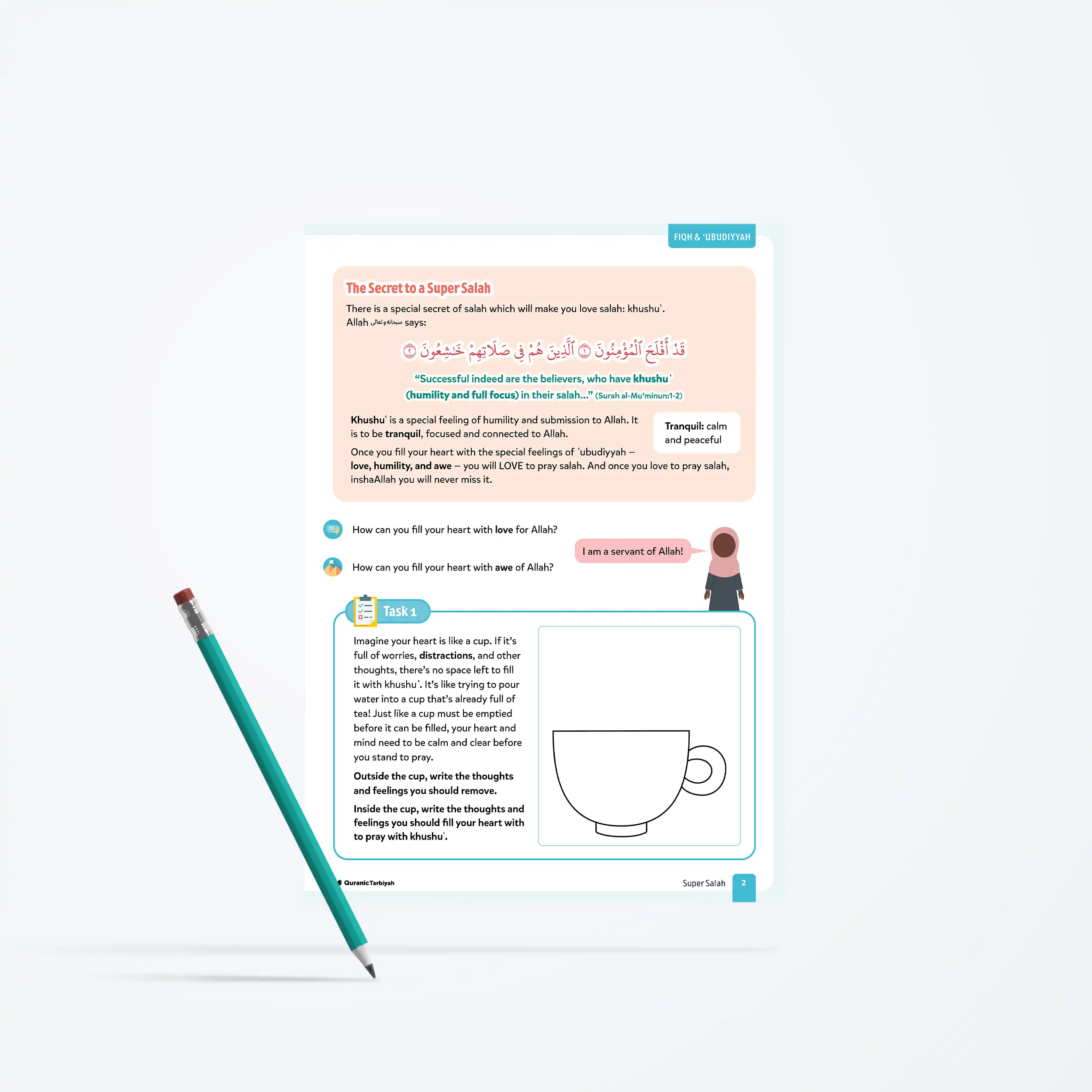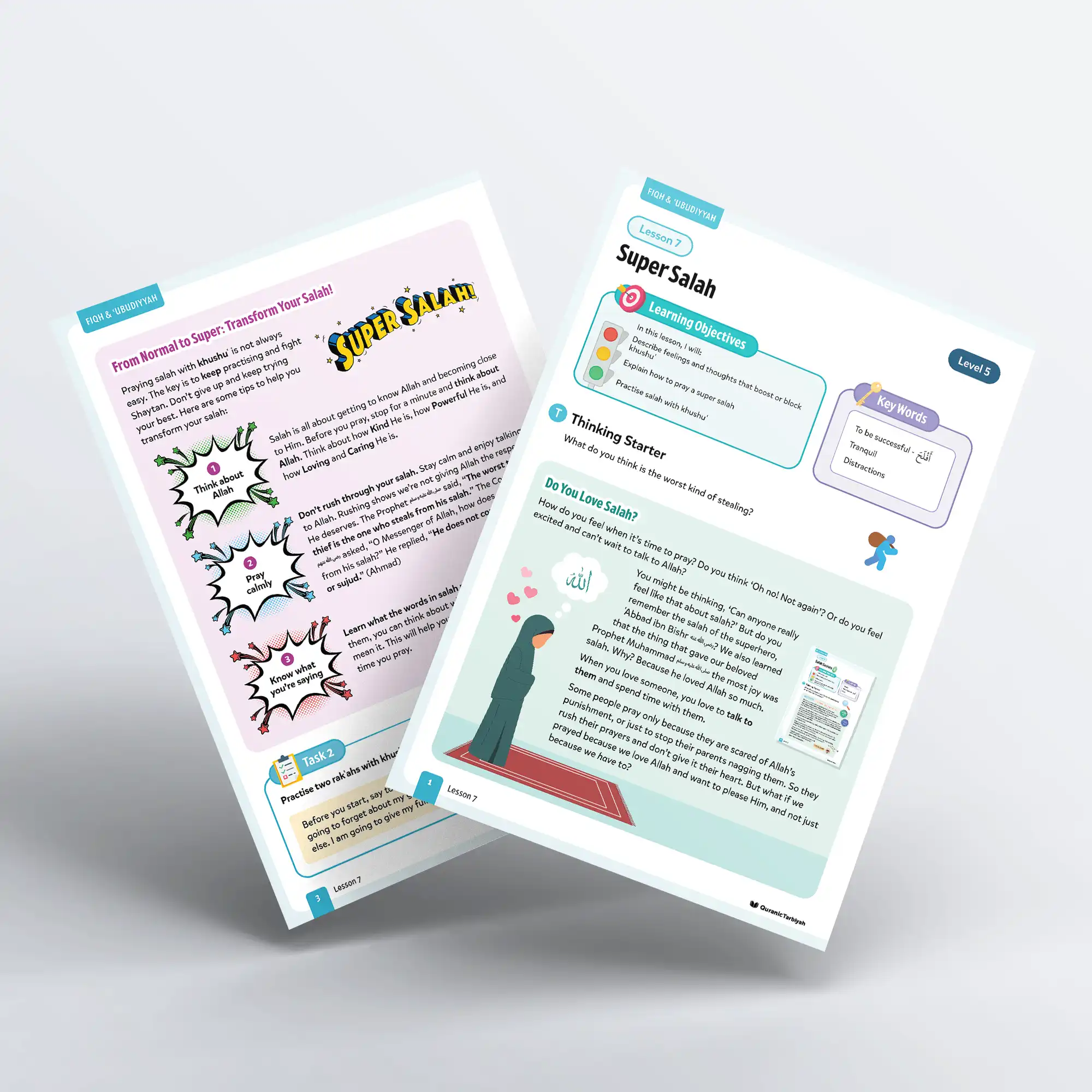 This lesson nurtures ʿubūdiyyah (servitude to Allah) by teaching learners that khushuʿ is a special feeling of humility and submission to Allah, being tranquil, focused and connected to Him. Young Muslims learn that when they fill their hearts with love, humility, and awe, they will love to pray salah and never miss it.