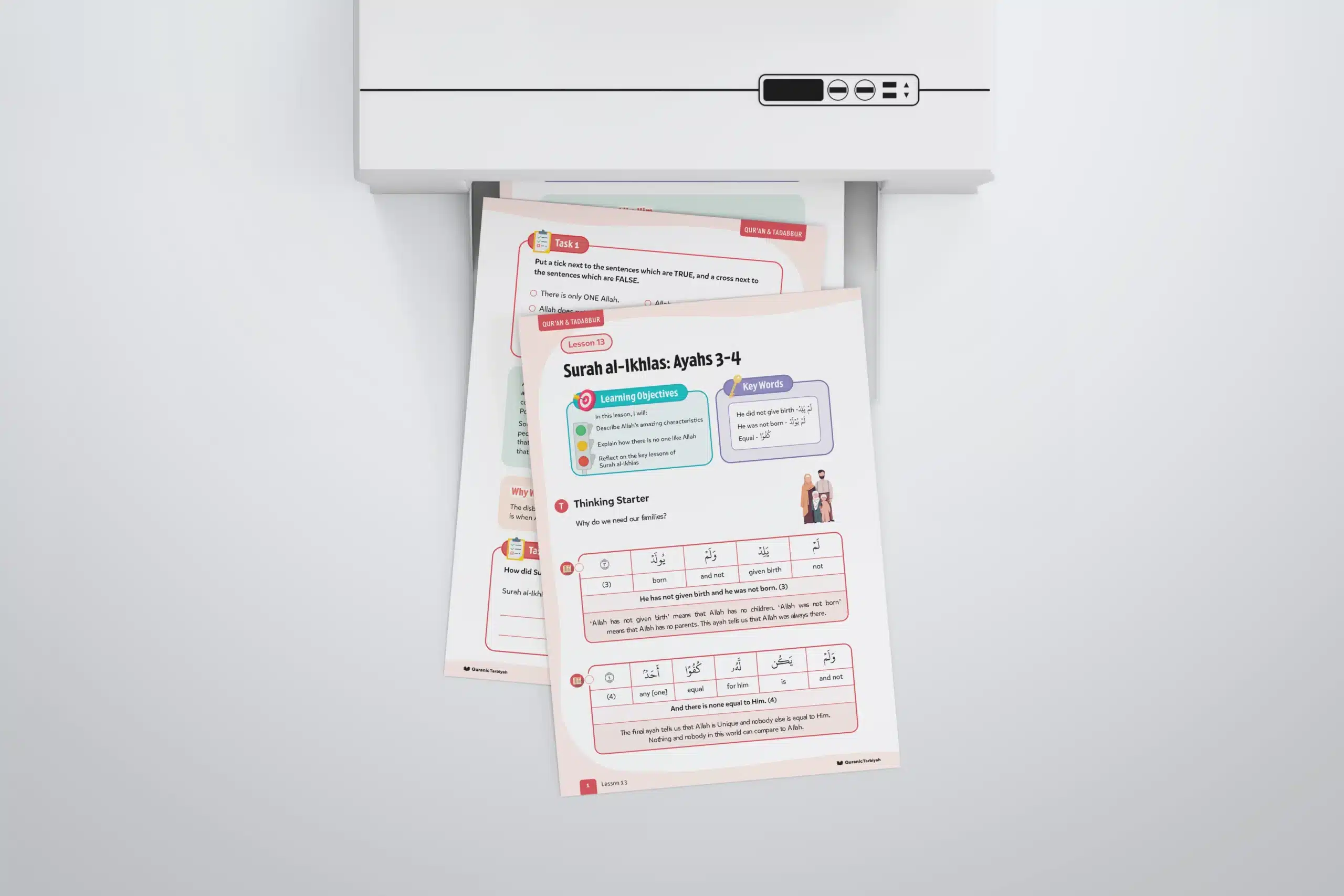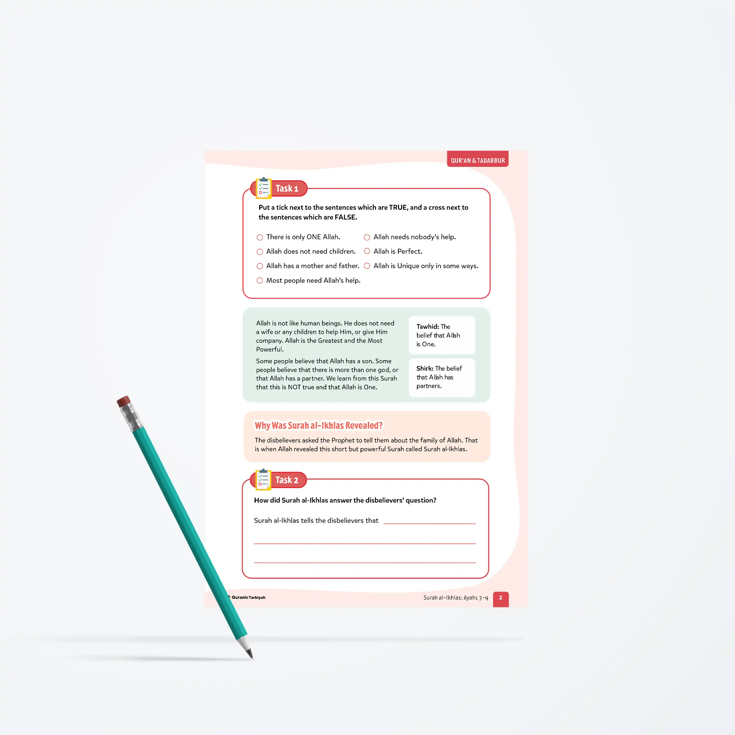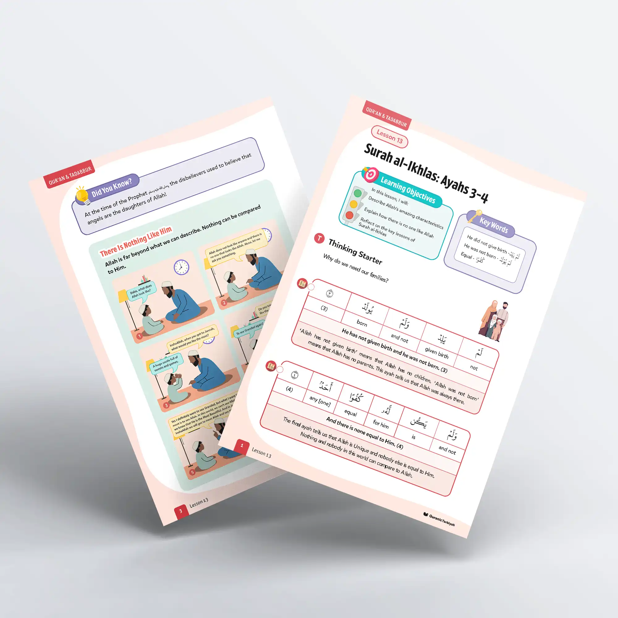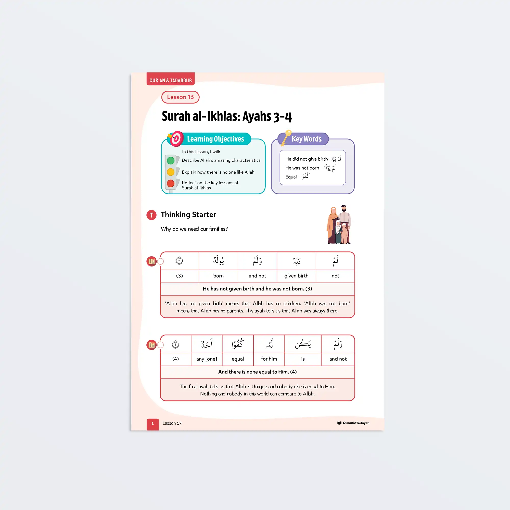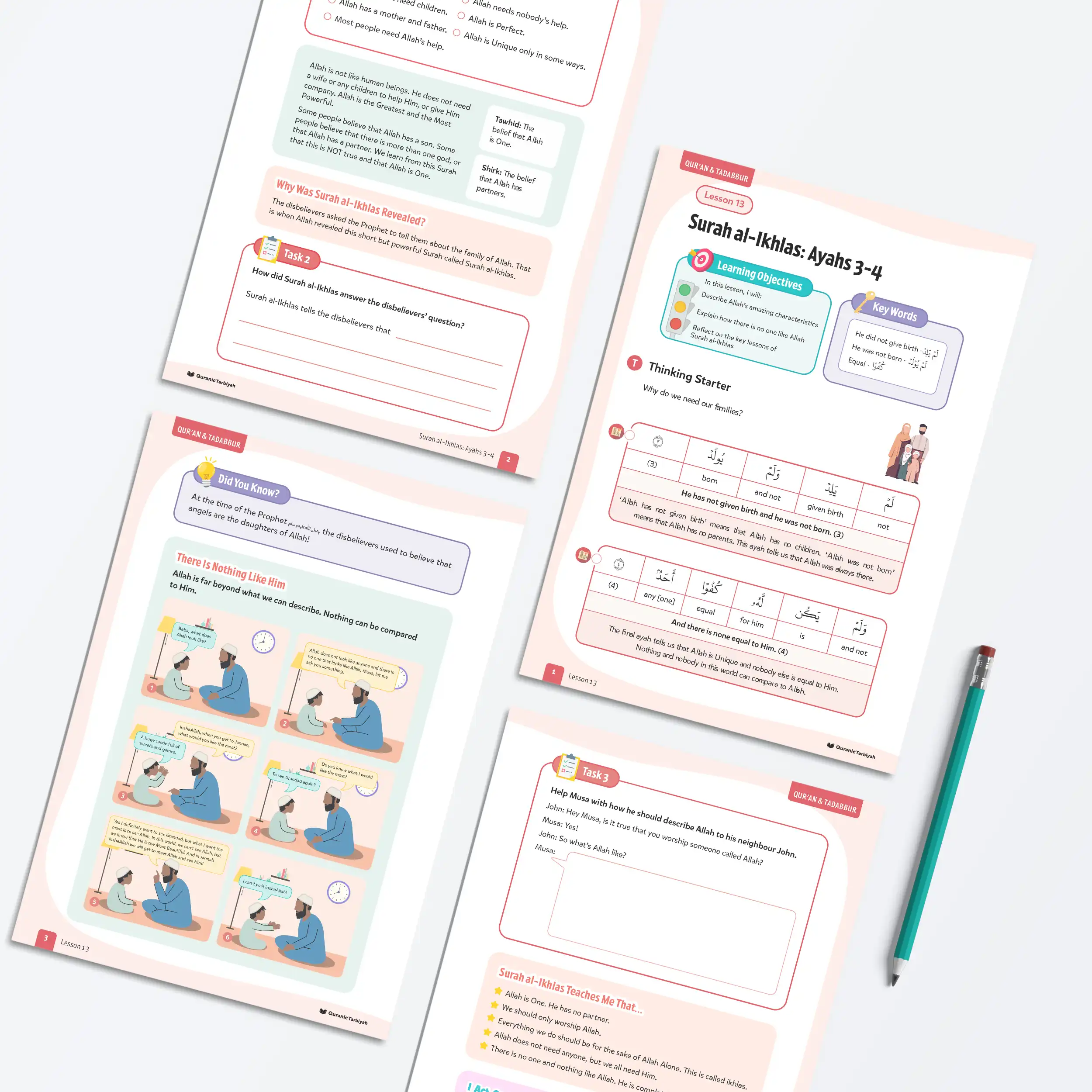 Help young learners complete Surah al-Ikhlas by exploring ayahs 3-4, understanding Allah’s uniqueness and perfection with this engaging lesson featuring tawhid, touching dialogue, and daสฟwah practice activities.