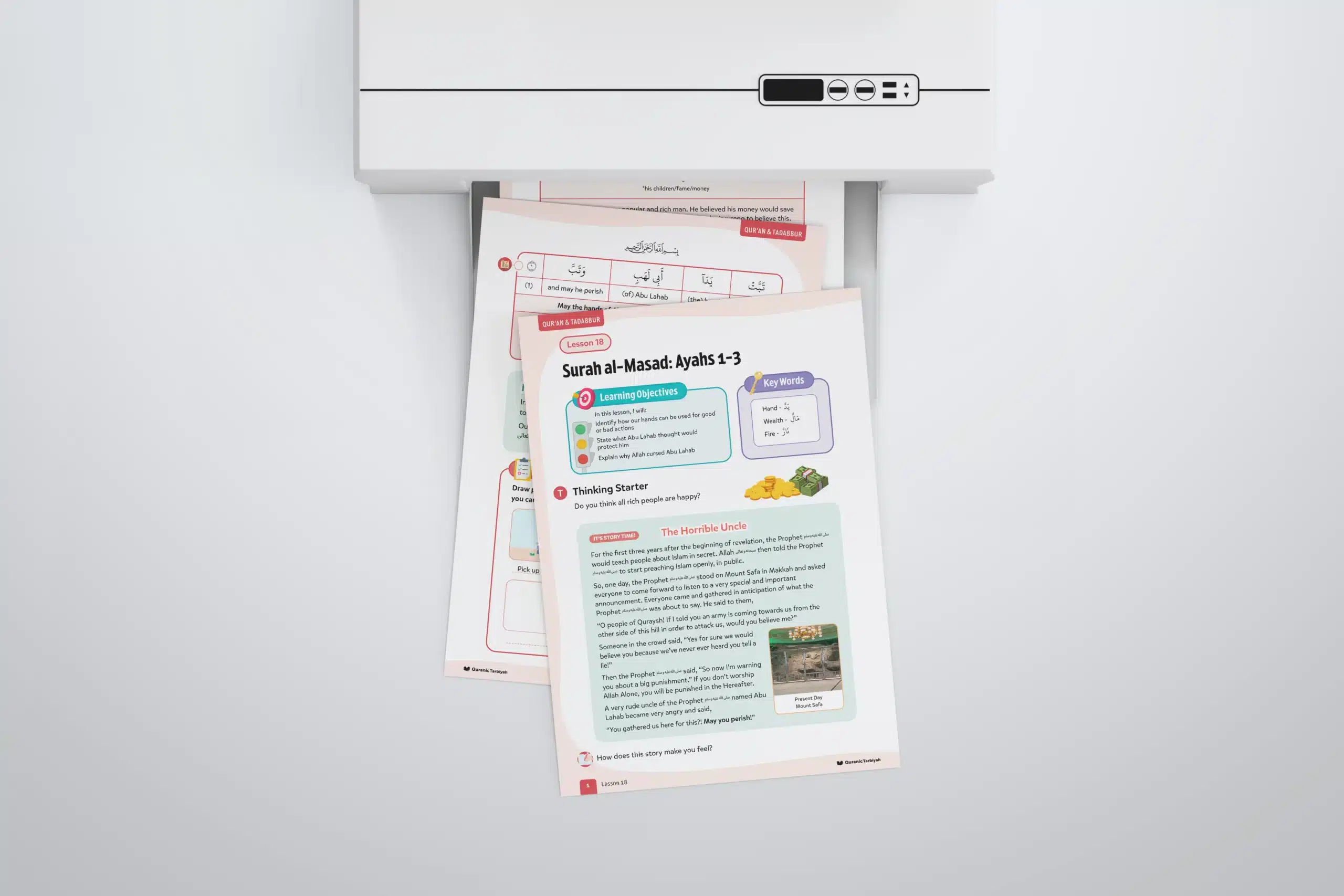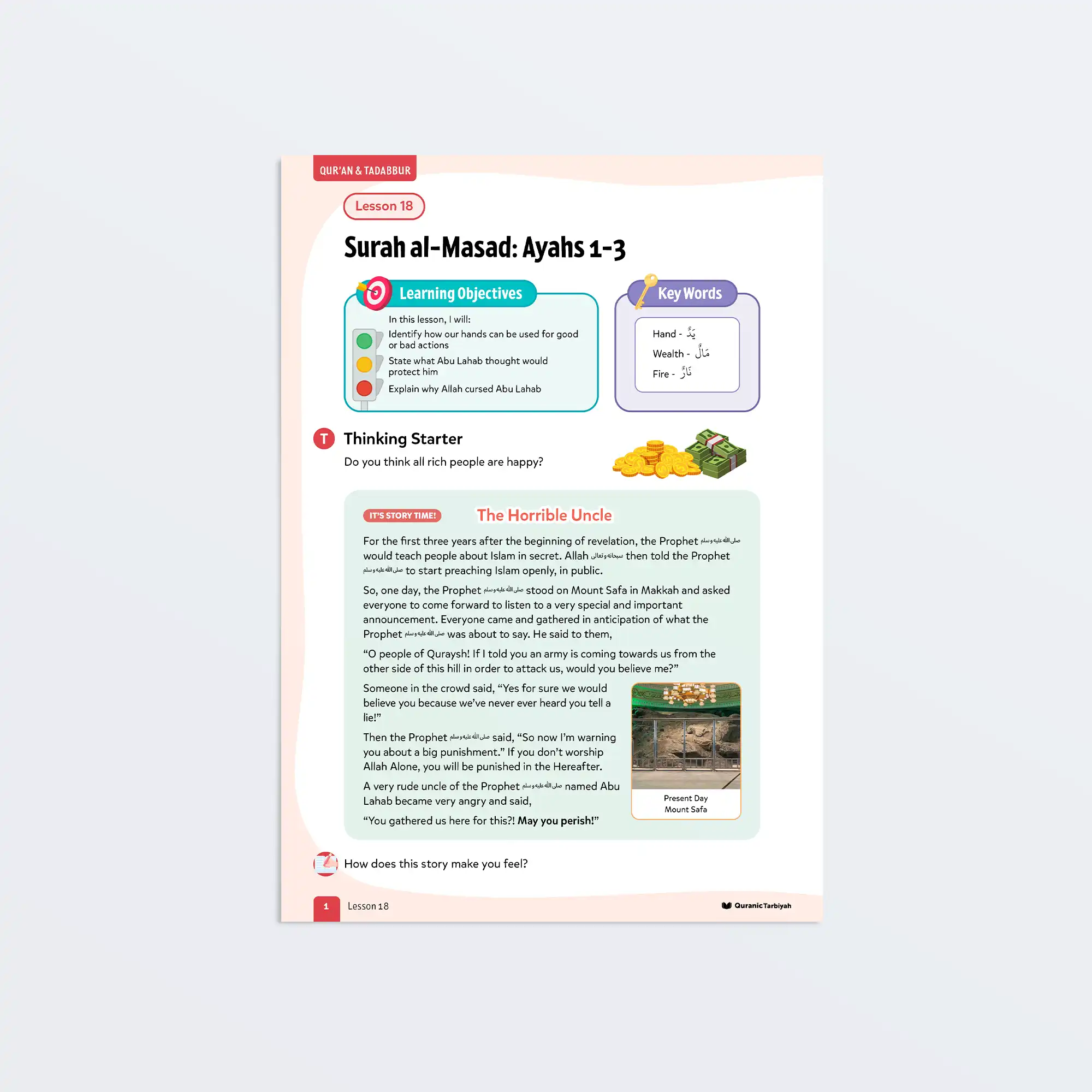 Help young learners explore Surah al-Masad ayahs 1-3, learning about Abu Lahab’s curse and understand that wealth cannot protect from Allah’s punishment, and learn to use their abilities for righteous actions. Through captivating storytelling and interactive activities, learners develop strong Islamic character whilst exploring fundamental concepts of faith and justice.
