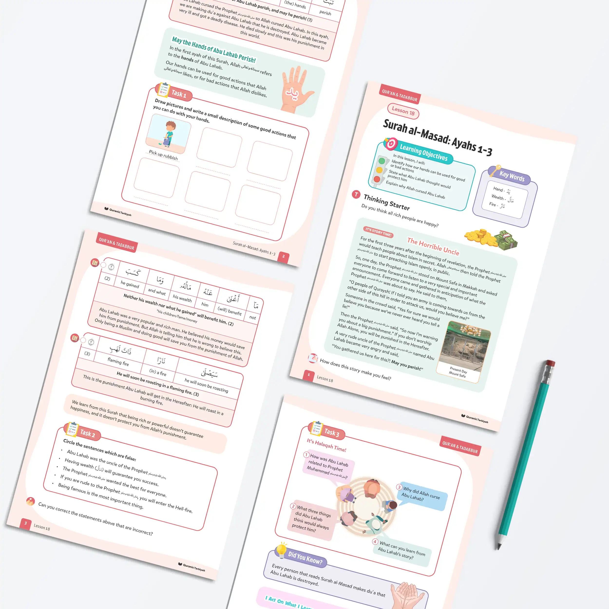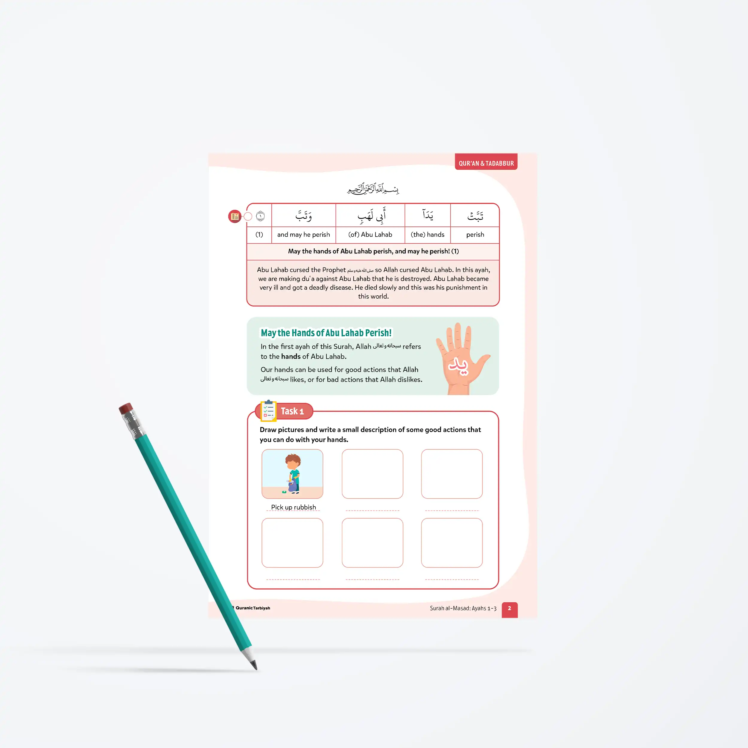 Help young learners understand the consequences of opposing Allah’s message and discover the true value of good actions with this comprehensive lesson covering the opening Surah al-Masad: Ayahs 1-3. This engaging lesson teaches them about Abu Lahab’s punishment whilst empowering them to use their hands for righteous deeds and understand that wealth cannot protect against divine justice.