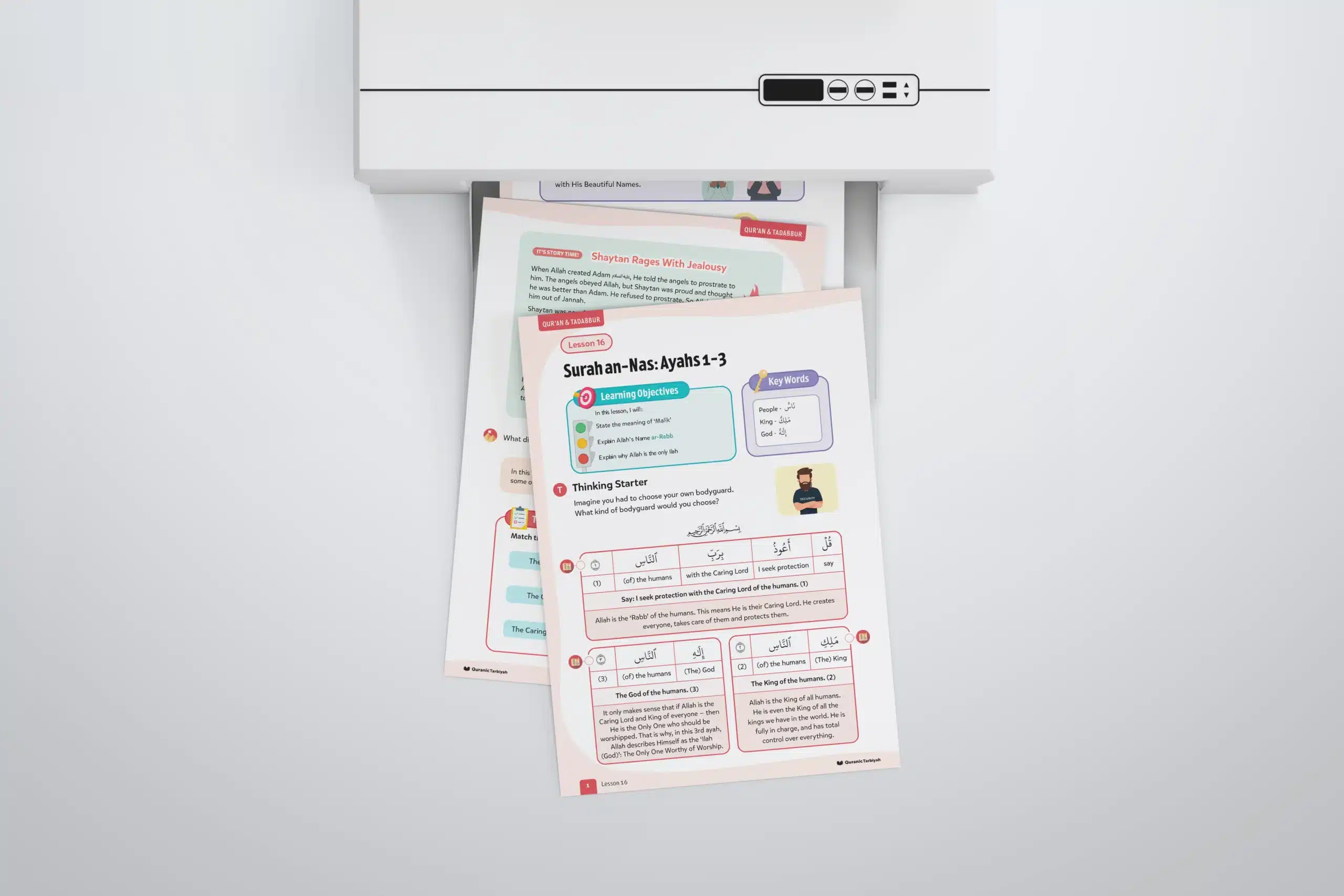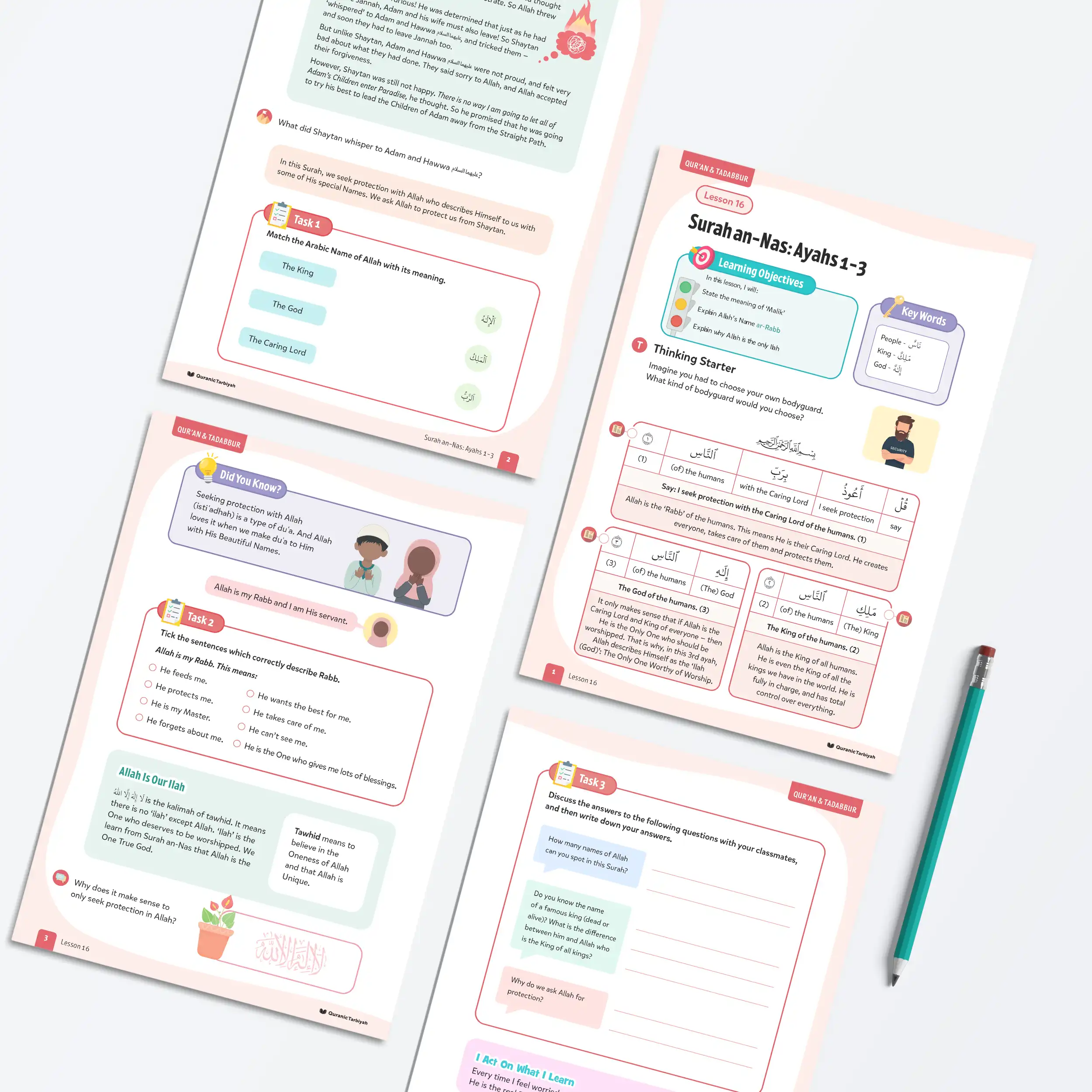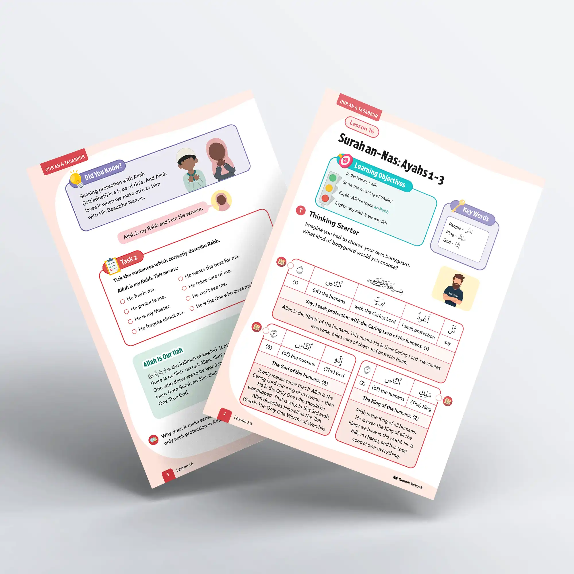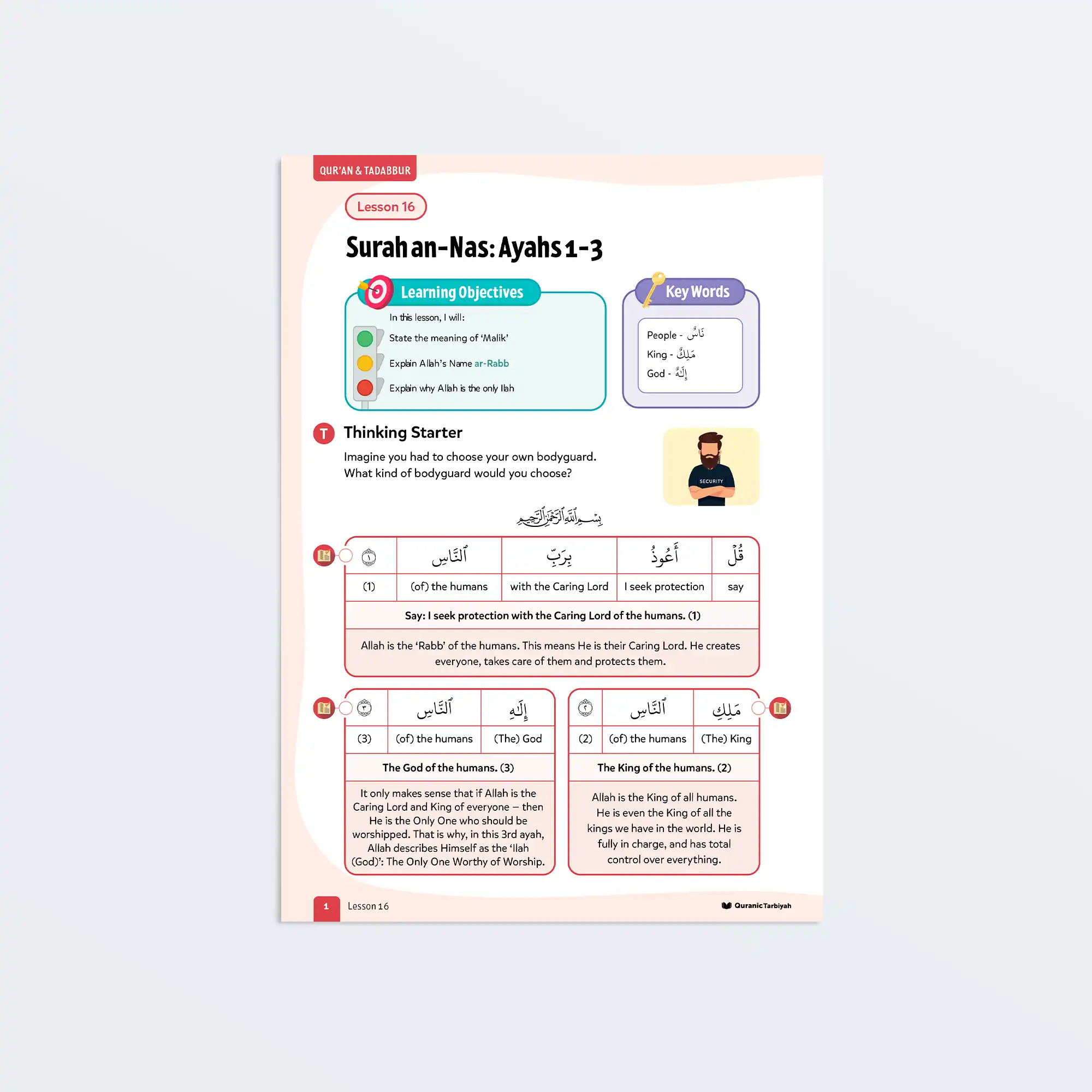 Begin your journey through Surah an-Nas with this engaging Surah an-Nas: Ayahs 1-3 lesson exploring the first three verses that reveal Allah’s magnificent Names: ar-Rabb (the Nurturing Lord), al-Malik (the King), and al-Ilah (the Only God). Young learners will discover why Allah is the perfect protector through understanding these beautiful attributes whilst learning the powerful concept of tawhid (the Oneness of Allah).