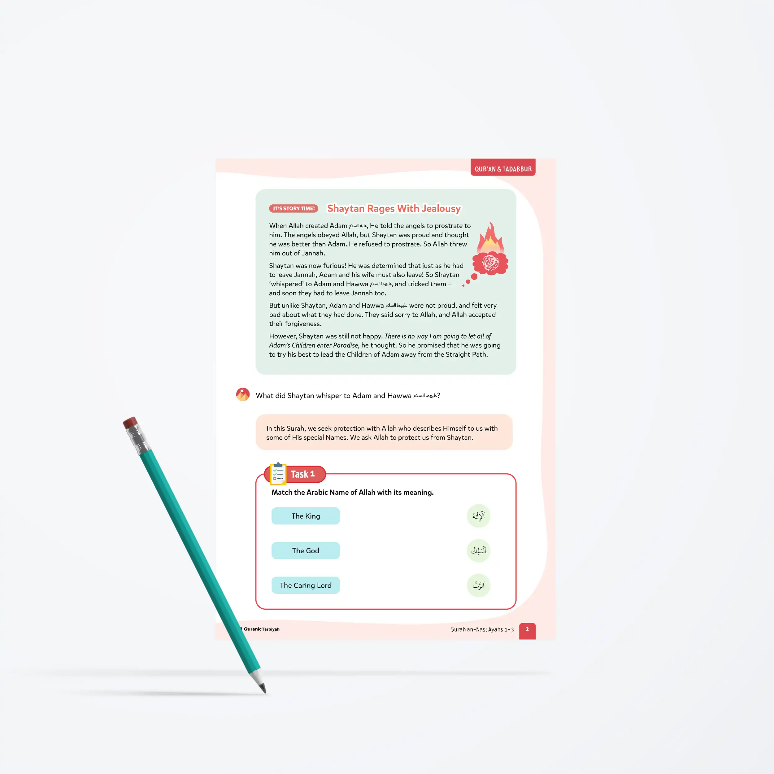 Help young learners explore Surah an-Nas ayahs 1-3, learning about Allah’s Names ar-Rabb, al-Malik, and al-Ilah with this engaging lesson featuring Shaytan’s story and tawhid activities.