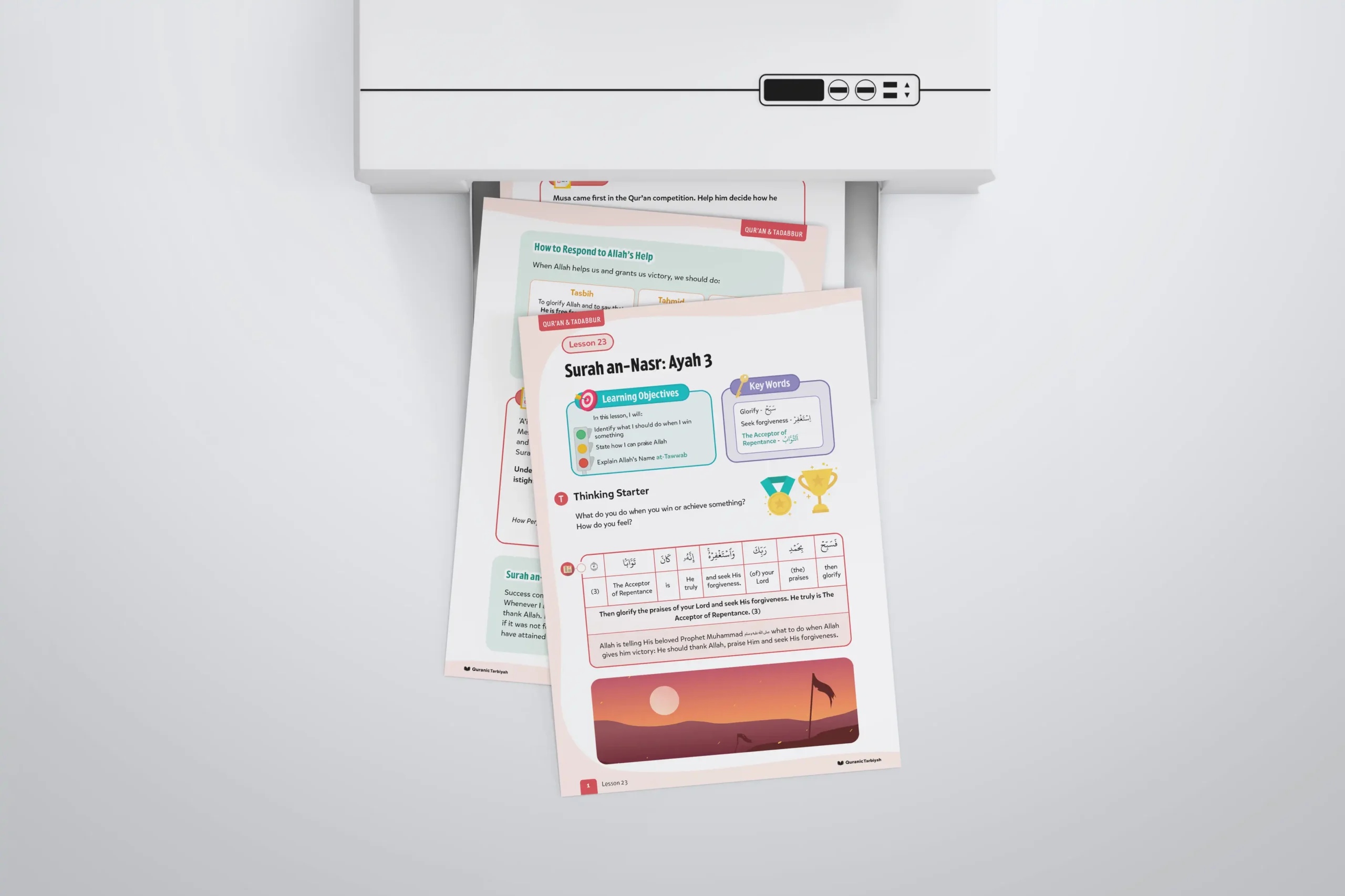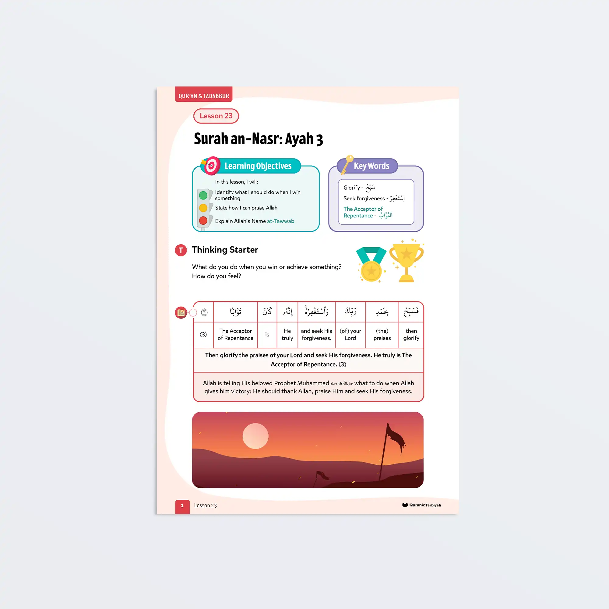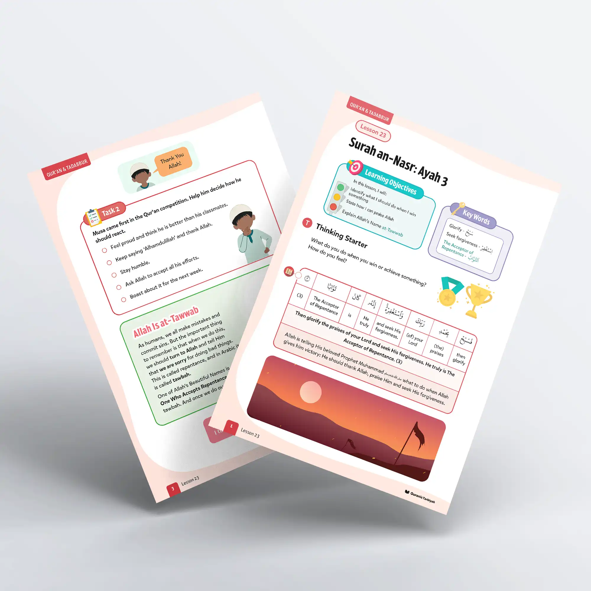 This transformative lesson teaches learners three essential responses to success: tasbih (glorifying Allah and saying He is Perfect), tahmid (praising and thanking Allah), and istighfar (seeking forgiveness for our sins). Through exploration of Allah’s Beautiful Name at-Tawwab (the Acceptor of Repentance), young learners will understand that real victory in this world is becoming servants of Allah, and real victory in the Hereafter is entry into Jannah.
