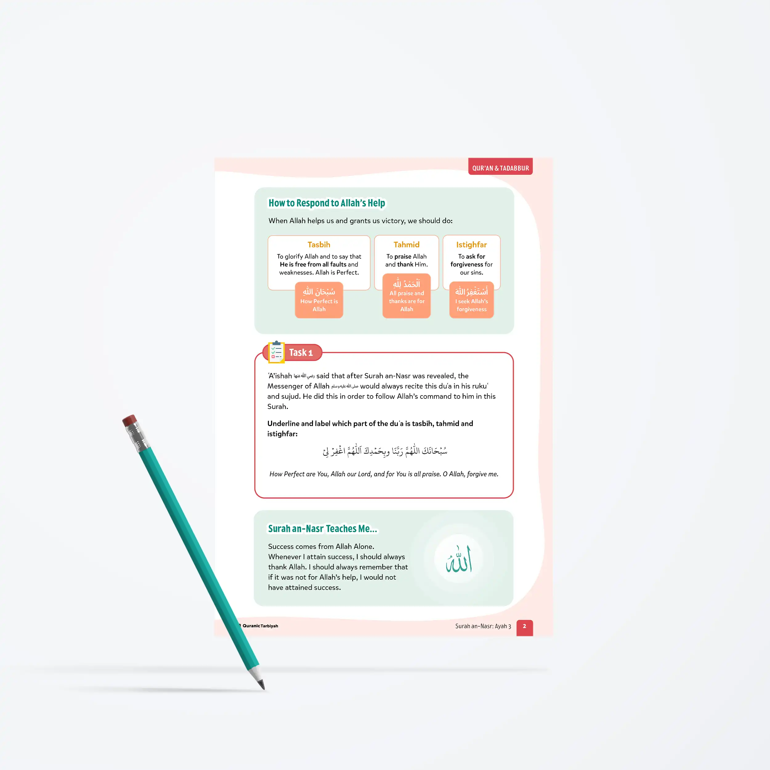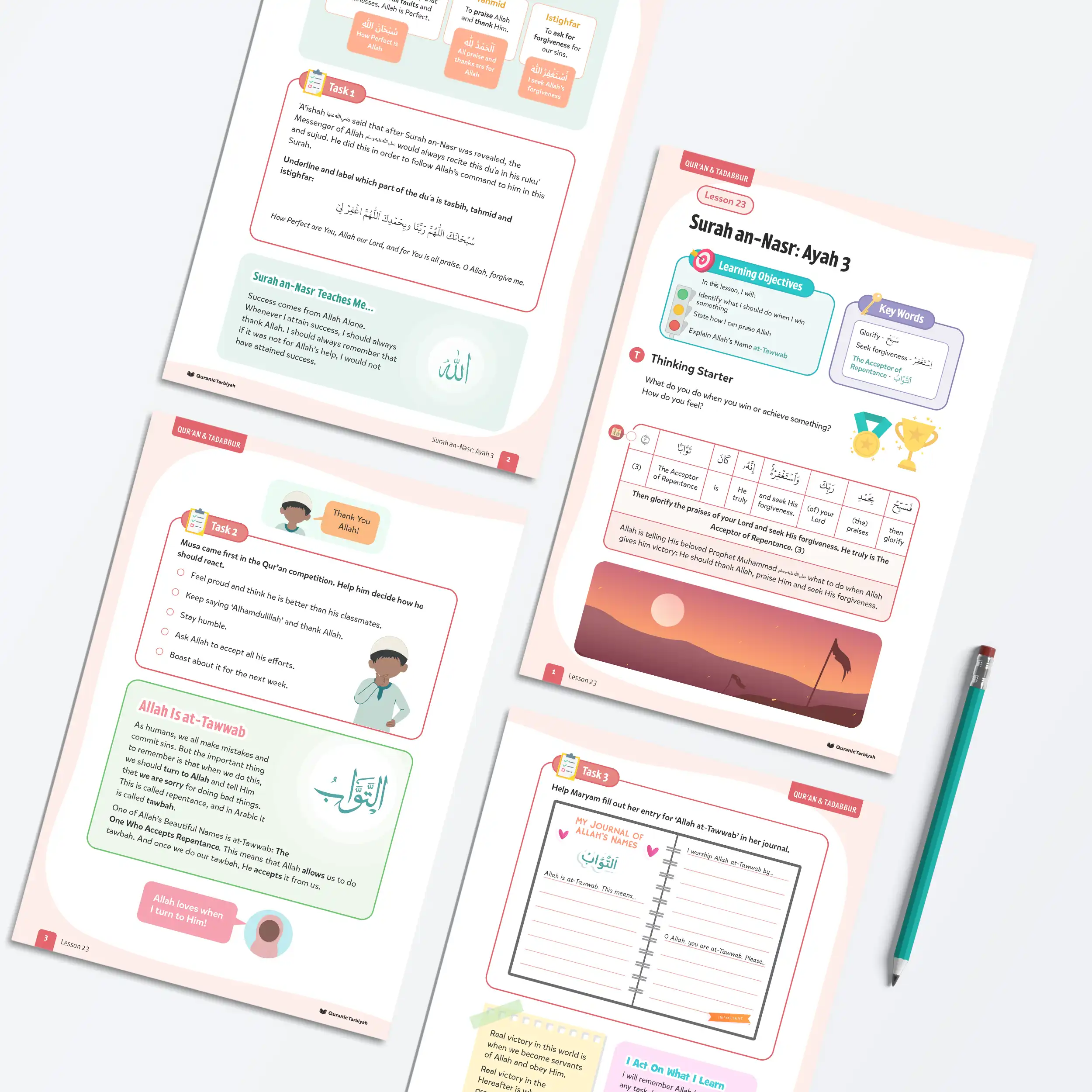 Help young learners complete Surah an-Nasr by exploring ayah 3, learning tasbih, tahmid, istighfar, and Allah’s Name at-Tawwab with this engaging lesson featuring authentic duʿa and journal activities.