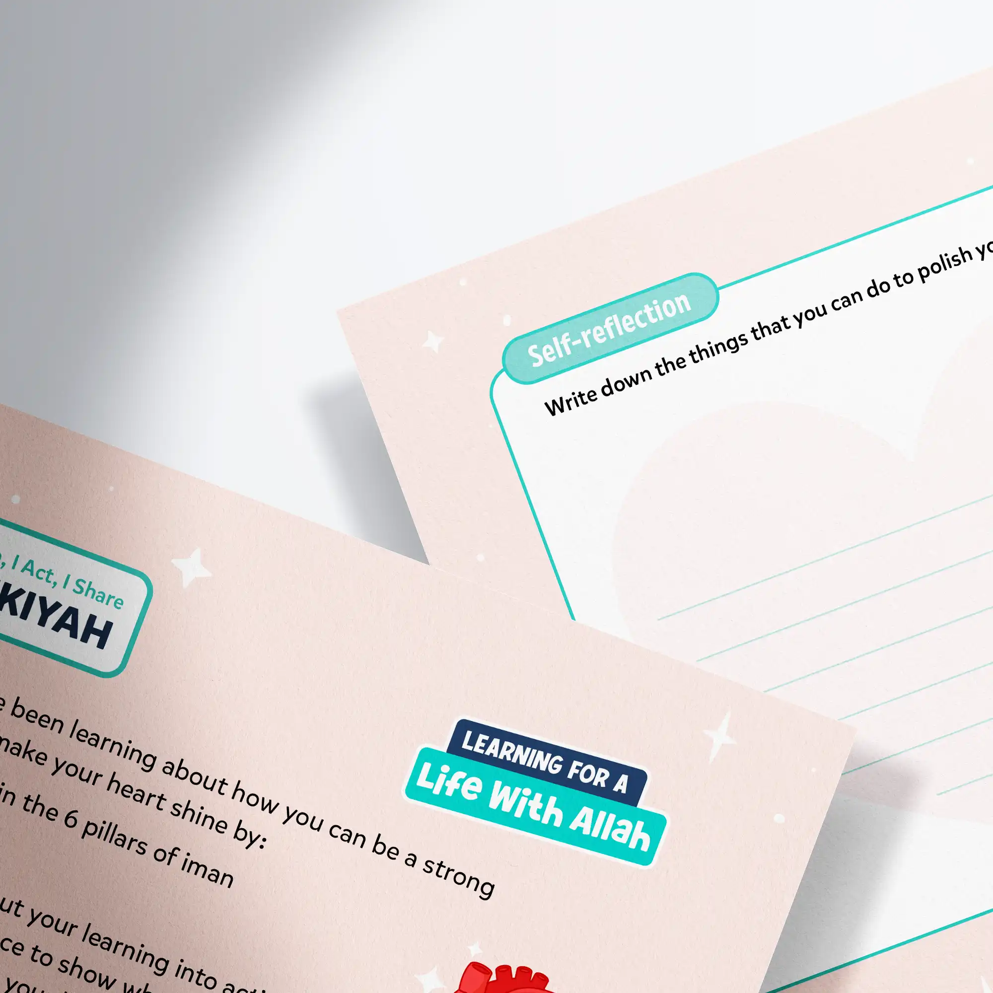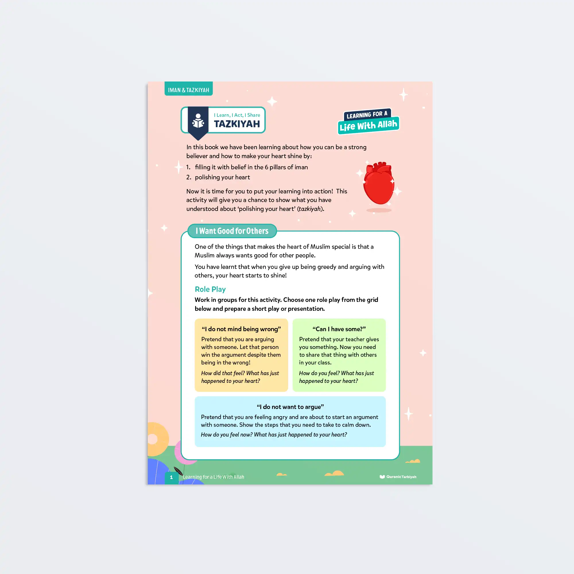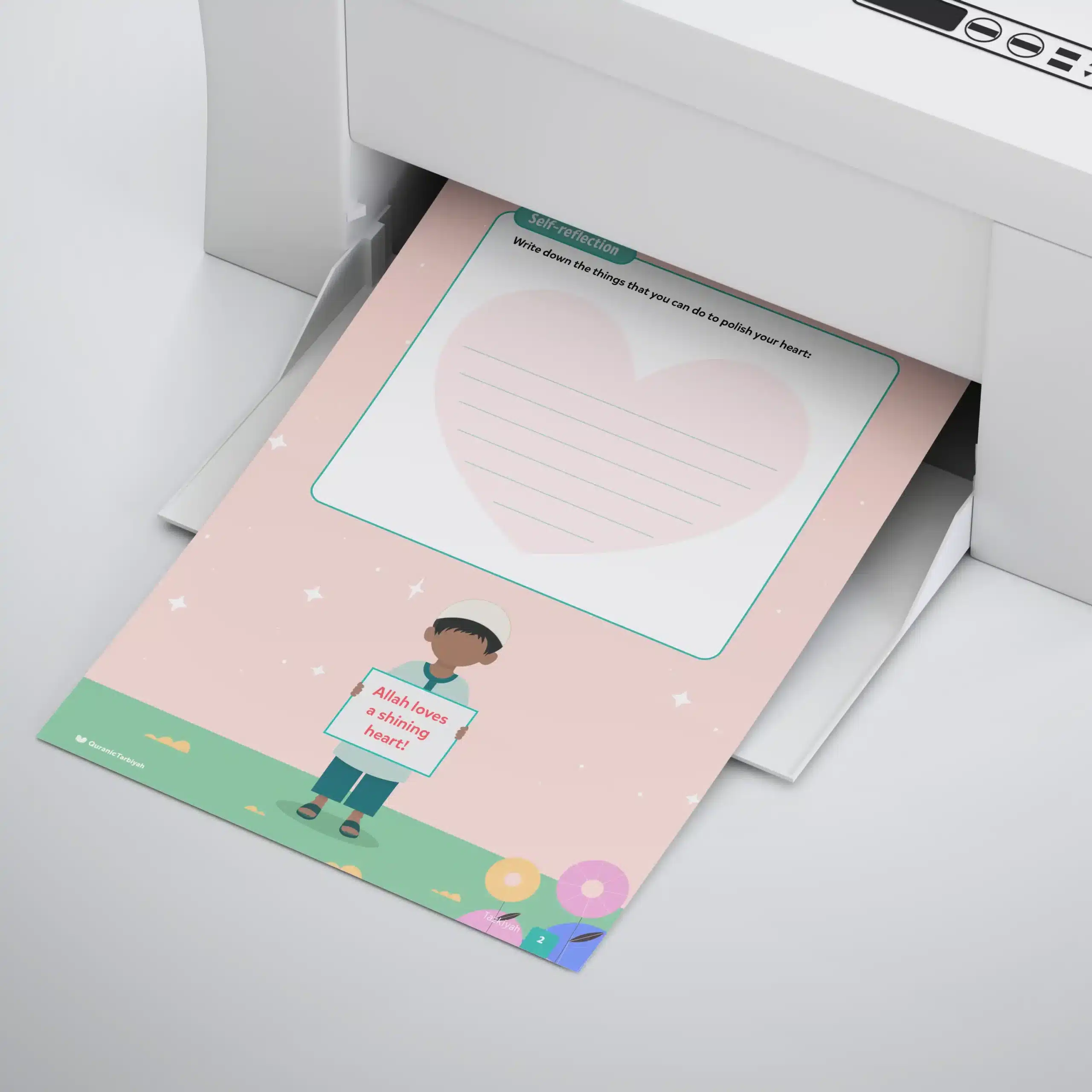 Help young learners aged 6+ develop a pure and shining heart through this Level 2 tazkiyah activity. They practise beautiful character through meaningful role play scenarios, learning to control anger, share generously, and choose peace over arguments. The gentle self-reflection exercises guide them to recognise how good actions polish their hearts.