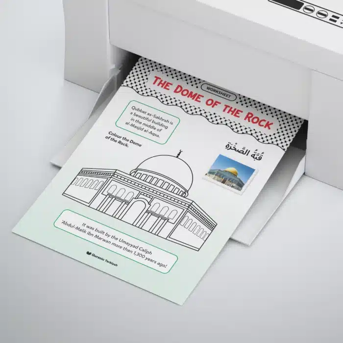 Help young learners discover Qubbat as-Sakhrah (the Dome of the Rock) through this beautiful colouring worksheet. Learners colour the iconic building whilst learning it sits in the middle of al-Masjid al-Aqsa and was built by Umayyad Caliph ʿAbdul-Malik ibn Marwan over 1,300 years ago. The activity nurtures awareness of Islamic history and architecture. Both coloured and black and white versions are included in the PDF file. Black and white can help save ink and printing costs.