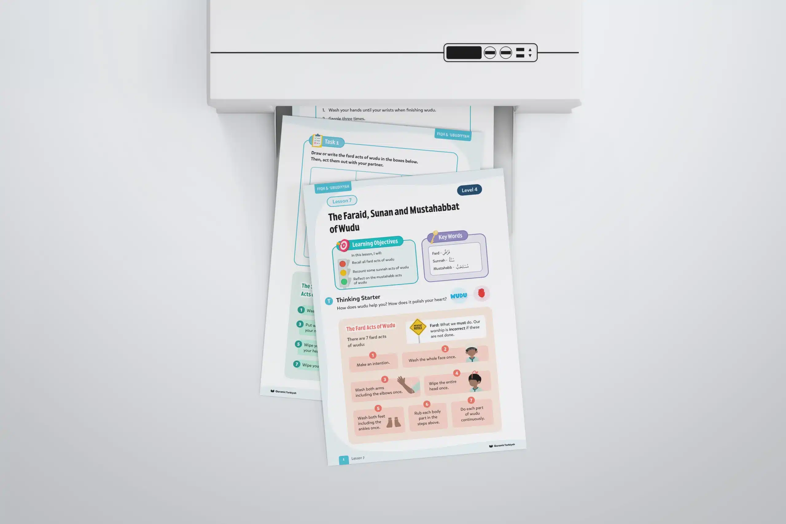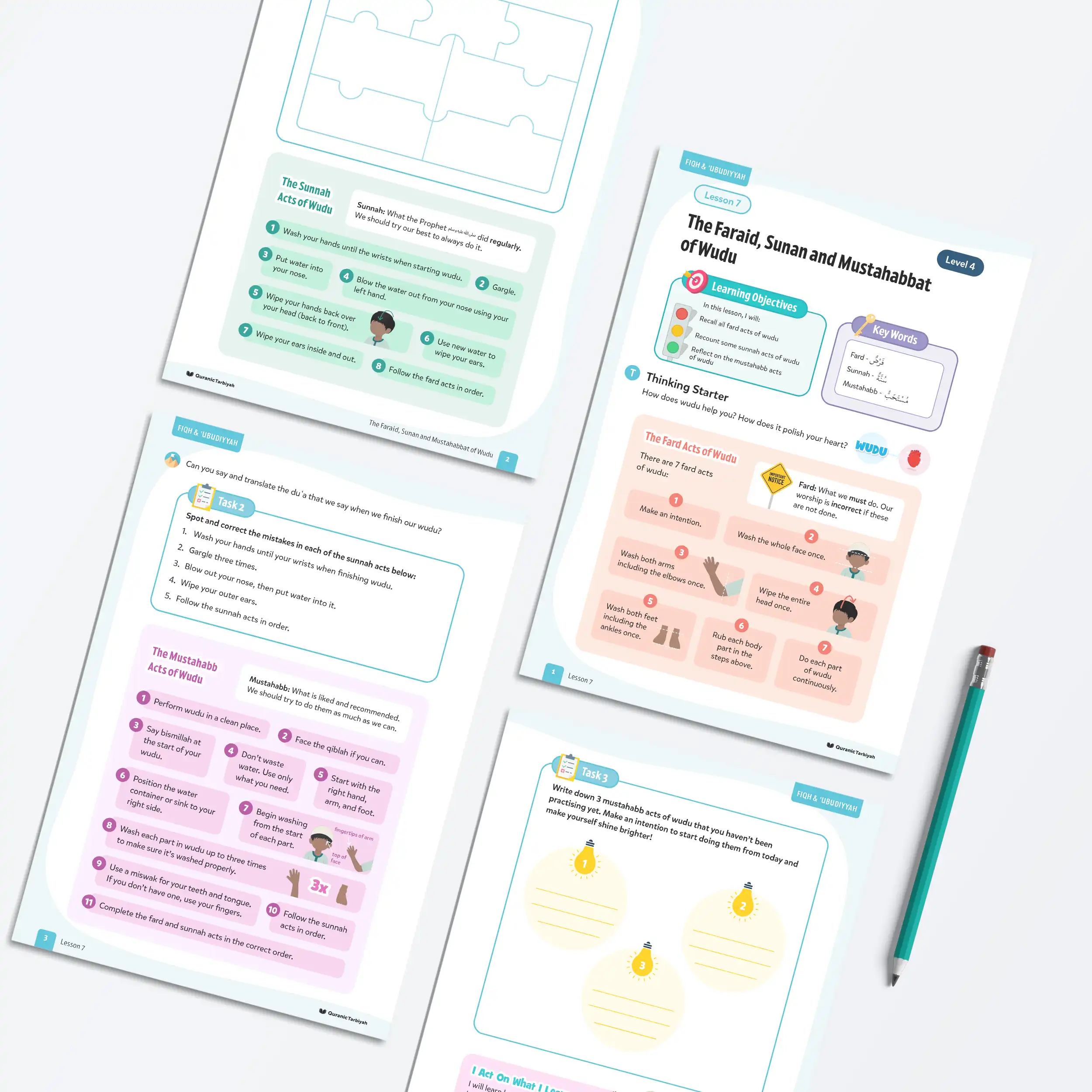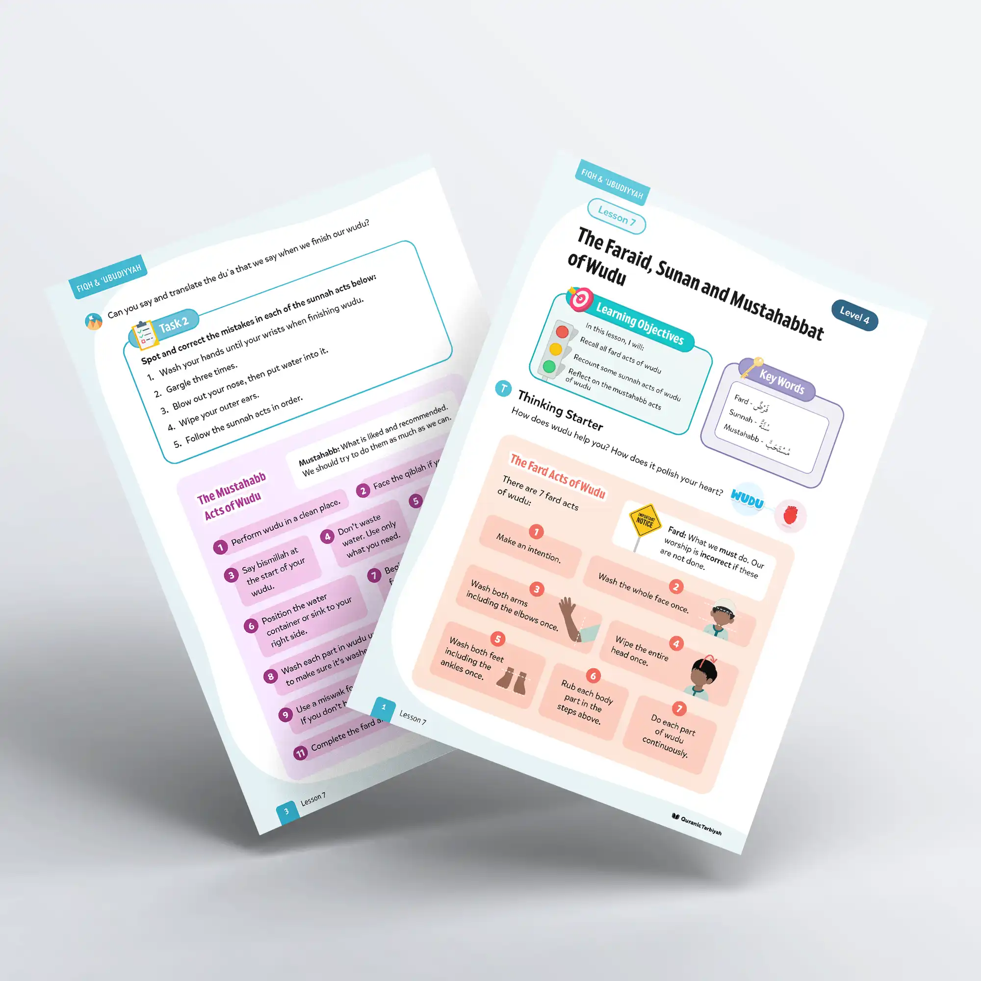 This thoughtfully designed lesson helps young learners understand that wudu is not just about fulfilling obligations but about following the Prophet’s beautiful example and seeking excellence in worship. Through reflection and hands-on practice, learners discover how each category of acts contributes to perfecting their purification, understanding that the more they practice the sunnah and mustahabb acts, the brighter they will shine.