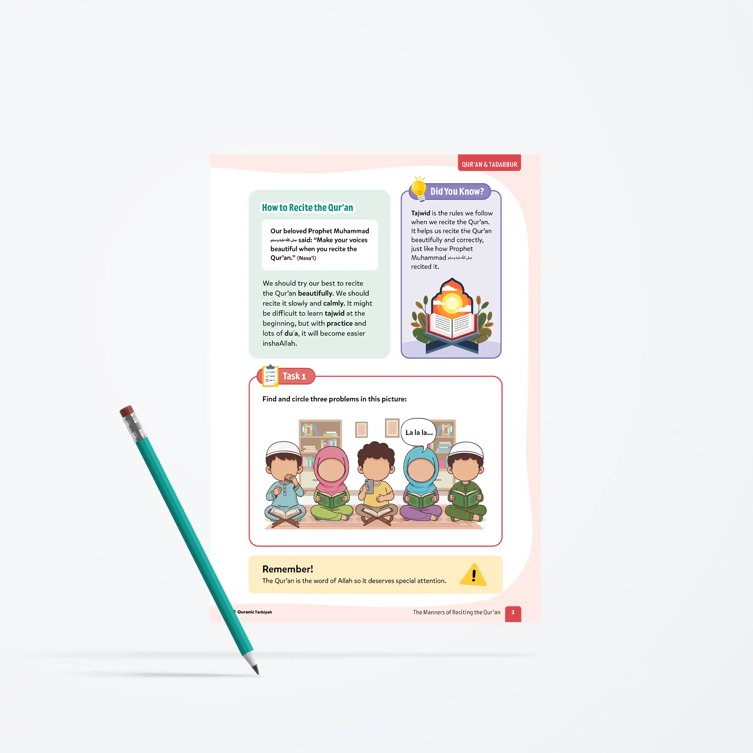 Through the inspiring story of Salim Mawla Abi Hudhayfah, a beloved Companion who was praised by our beloved Prophet ﷺ for his beautiful recitation, learners discover how proper adab with the Qur’an brings them closer to Allah’s mercy and blessings. This comprehensive lesson combines Islamic knowledge with interactive activities, helping 7+ year olds understand why proper manners matter when engaging with the Qur’an. From learning about tajwid to reflecting on their own recitation habits, learners will be motivated to become Qur’an champions themselves.