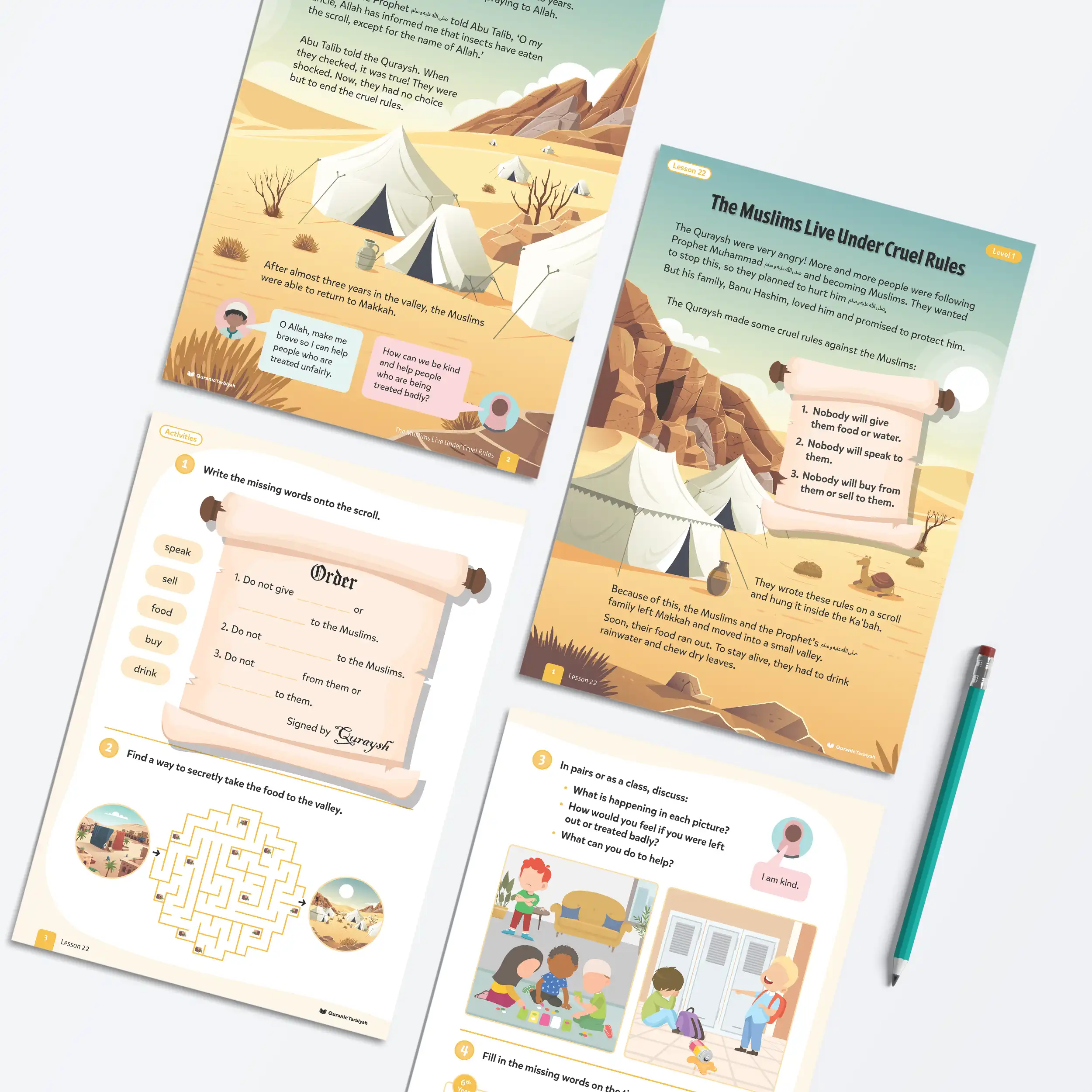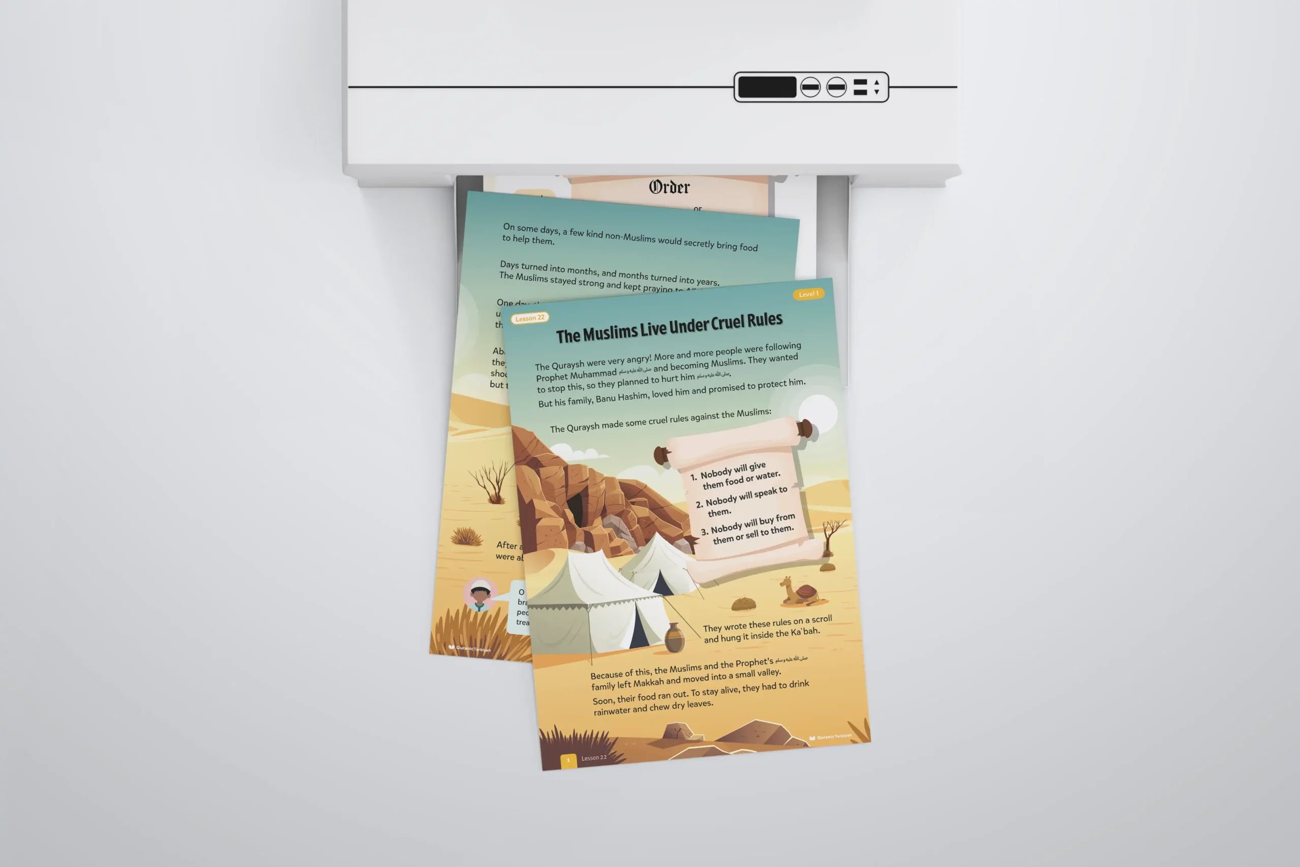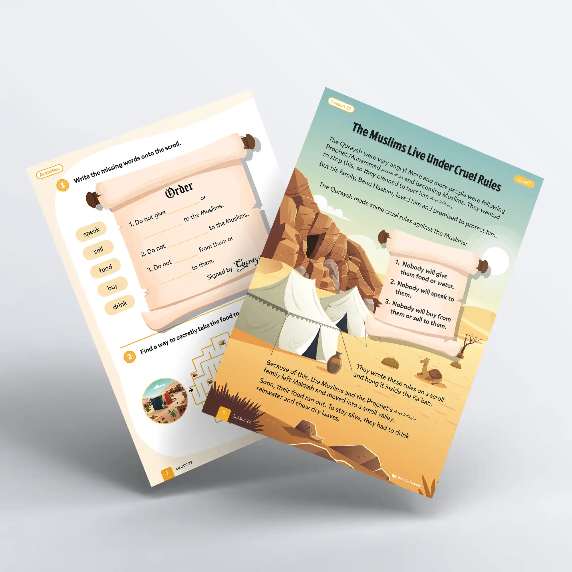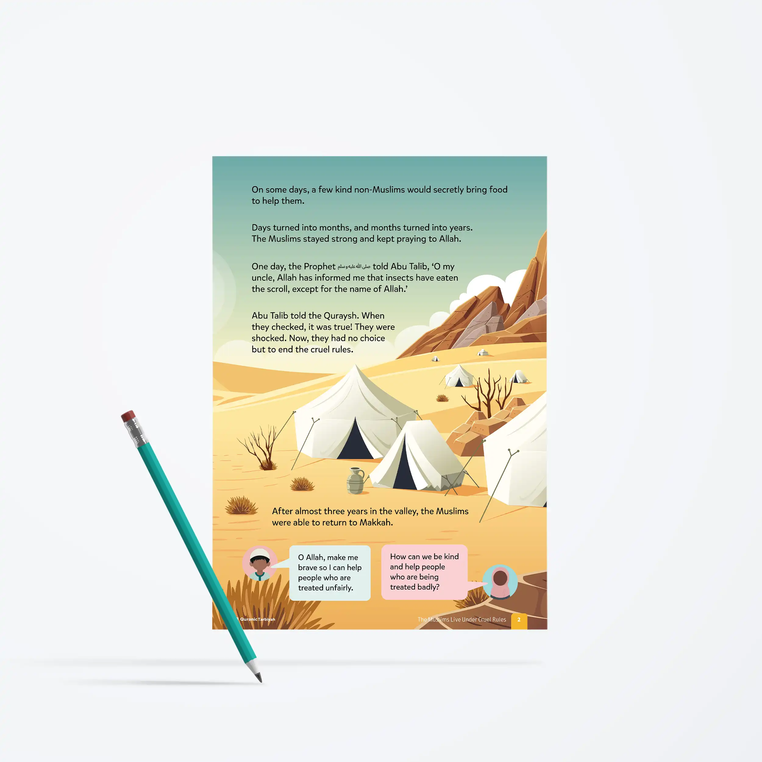 The Quraysh were watching Islam grow and they could not stand it. More and more people were accepting the truth, so they made a plan. They wrote three cruel rules onto a scroll and hung it inside the Kaʿbah: nobody will give the Muslims food or water, nobody will speak to them, and nobody will buy from them or sell to them. The Prophet’s ﷺ family, Banu Hashim, refused to abandon him. So together Muslims and family alike they left Makkah and moved into a small valley. Their food ran out. They drank rainwater. They chewed dry leaves to survive. Days became months. Months became years. Nearly three years passed like that. And through all of it, the Muslims stayed strong and kept praying to Allah.