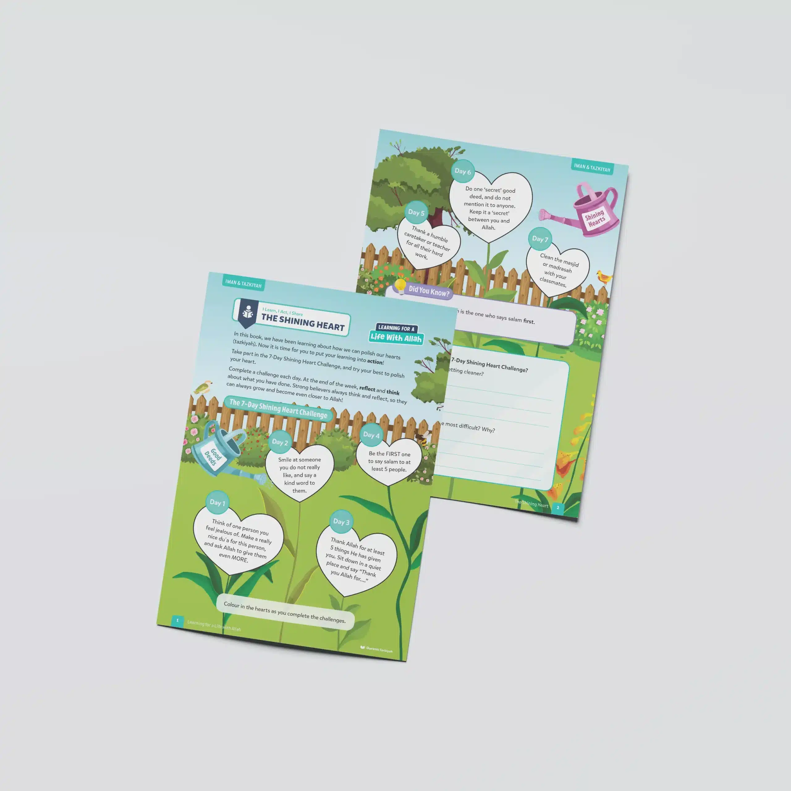 Help young learners aged 7+ experience tazkiyah (purification of the heart) through this transformative Level 3 activity. Children complete seven daily actions that polish their hearts, from overcoming jealousy to performing secret good deeds. The reflective journey nurtures gratitude, humility, and beautiful character whilst strengthening their connection to Allah.